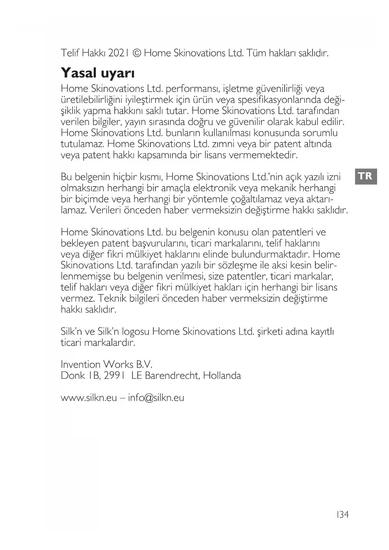 Telif Hakkı 2021 © Home Skinovations Ltd. Tüm hakları saklıdır. Yasal uyarı Home Skinovations Ltd. performansı, işletme güvenilirliği veya üretilebilirliğini iyileştirmek için ürün veya spesifikasyonlarında deği- şiklik yapma hakkını saklı tutar. Home Skinovations Ltd. tarafından verilen bilgiler, yayın sırasında doğru ve güvenilir olarak kabul edilir. Home Skinovations Ltd. bunların kullanılması konusunda sorumlu tutulamaz. Home Skinovations Ltd. zımni veya bir patent altında veya patent hakkı kapsamında bir lisans vermemektedir. Bu belgenin hiçbir kısmı, Home Skinovations Ltd.’nin açık yazılı izni olmaksızın herhangi bir amaçla elektronik veya mekanik herhangi bir biçimde veya herhangi bir yöntemle çoğaltılamaz veya aktarı- lamaz. Verileri önceden haber vermeksizin değiştirme hakkı saklıdır. Home Skinovations Ltd. bu belgenin konusu olan patentleri ve bekleyen patent başvurularını, ticari markalarını, telif haklarını veya diğer fikri mülkiyet haklarını elinde bulundurmaktadır. Home Skinovations Ltd. tarafından yazılı bir sözleşme ile aksi kesin belir- lenmemişse bu belgenin verilmesi, size patentler, ticari markalar, telif hakları veya diğer fikri mülkiyet hakları için herhangi bir lisans vermez. Teknik bilgileri önceden haber vermeksizin değiştirme hakkı saklıdır. Silk’n ve Silk’n logosu Home Skinovations Ltd. şirketi adına kayıtlı ticari markalardır. Invention Works B.V. Donk 1B, 2991 LE Barendrecht, Hollanda www.silkn.eu – info@silkn.eu135