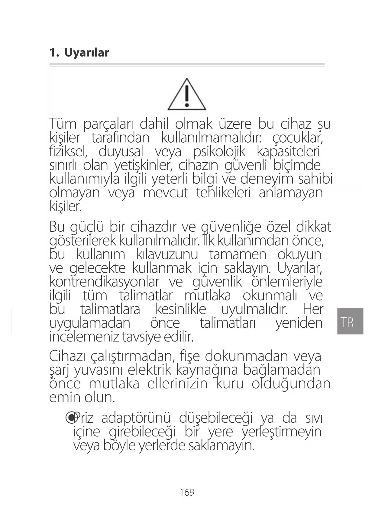 Tüm parçaları dahil olmak üzere bu cihaz şu kişiler tarafından kullanılmamalıdır: çocuklar, fiziksel, duyusal veya psikolojik kapasiteleri sınırlı olan yetişkinler, cihazın güvenli biçimde kullanımıyla ilgili yeterli bilgi ve deneyim sahibi olmayan veya mevcut tehlikeleri anlamayan kişiler. Bu güçlü bir cihazdır ve güvenliğe özel dikkat gösterilerek kullanılmalıdır. İlk kullanımdan önce, bu kullanım kılavuzunu tamamen okuyun ve gelecekte kullanmak için saklayın. Uyarılar, kontrendikasyonlar ve güvenlik önlemleriyle ilgili tüm talimatlar mutlaka okunmalı ve bu talimatlara kesinlikle uyulmalıdır. Her uygulamadan önce talimatları yeniden incelemeniz tavsiye edilir. Cihazı çalıştırmadan, fişe dokunmadan veya şarj yuvasını elektrik kaynağına bağlamadan önce mutlaka ellerinizin kuru olduğundan emin olun.