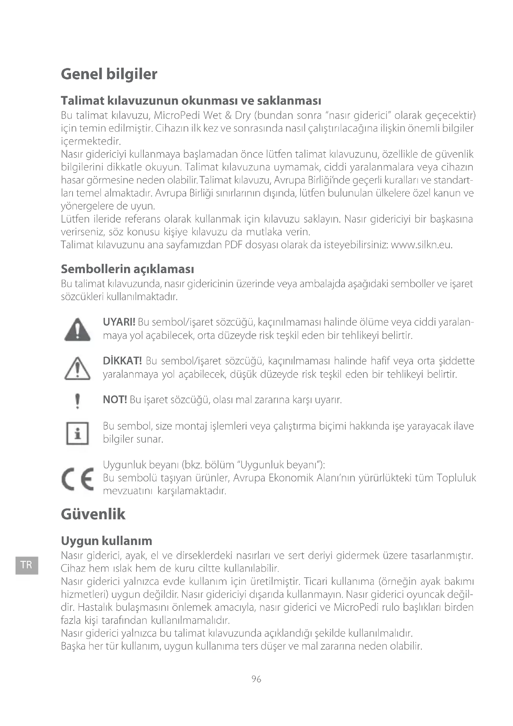 Genel bilgiler Talimat kılavuzunun okunması ve saklanması Bu talimat kılavuzu, MicroPedi Wet & Dry (bundan sonra “nasır giderici” olarak geçecektir) için temin edilmiştir. Cihazın ilk kez ve sonrasında nasıl çalıştırılacağına ilişkin önemli bilgiler içermektedir. Nasır gidericiyi kullanmaya başlamadan önce lütfen talimat kılavuzunu, özellikle de güvenlik bilgilerini dikkatle okuyun. Talimat kılavuzuna uymamak, ciddi yaralanmalara veya cihazın hasar görmesine neden olabilir. Talimat kılavuzu, Avrupa Birliği’nde geçerli kuralları ve standart- ları temel almaktadır. Avrupa Birliği sınırlarının dışında, lütfen bulunulan ülkelere özel kanun ve yönergelere de uyun. Lütfen ileride referans olarak kullanmak için kılavuzu saklayın. Nasır gidericiyi bir başkasına verirseniz, söz konusu kişiye kılavuzu da mutlaka verin. Talimat kılavuzunu ana sayfamızdan PDF dosyası olarak da isteyebilirsiniz: www.silkn.eu. Sembollerin açıklaması Bu talimat kılavuzunda, nasır gidericinin üzerinde veya ambalajda aşağıdaki semboller ve işaret sözcükleri kullanılmaktadır. UYARI! Bu sembol/işaret sözcüğü, kaçınılmaması halinde ölüme veya ciddi yaralan- maya yol açabilecek, orta düzeyde risk teşkil eden bir tehlikeyi belirtir. DİKKAT! Bu sembol/işaret sözcüğü, kaçınılmaması halinde hafif veya orta şiddette yaralanmaya yol açabilecek, düşük düzeyde risk teşkil eden bir tehlikeyi belirtir. NOT! Bu işaret sözcüğü, olası mal zararına karşı uyarır. Bu sembol, size montaj işlemleri veya çalıştırma biçimi hakkında işe yarayacak ilave bilgiler sunar. Uygunluk beyanı (bkz. bölüm “Uygunluk beyanı”): Bu sembolü taşıyan ürünler, Avrupa Ekonomik Alanı’nın yürürlükteki tüm Topluluk mevzuatını karşılamaktadır. Güvenlik Uygun kullanım Nasır giderici, ayak, el ve dirseklerdeki nasırları ve sert deriyi gidermek üzere tasarlanmıştır. Cihaz hem ıslak hem de kuru ciltte kullanılabilir. Nasır giderici yalnızca evde kullanım için üretilmiştir. Ticari kullanıma (örneğin ayak bakımı hizmetleri) uygun değildir. Nasır gidericiyi dışarıda kullanmayın. Nasır giderici oyuncak değil- dir. Hastalık bulaşmasını önlemek amacıyla, nasır giderici ve MicroPedi rulo başlıkları birden fazla kişi tarafından kullanılmamalıdır. Nasır giderici yalnızca bu talimat kılavuzunda açıklandığı şekilde kullanılmalıdır. Başka her tür kullanım, uygun kullanıma ters düşer ve mal zararına neden olabilir.97