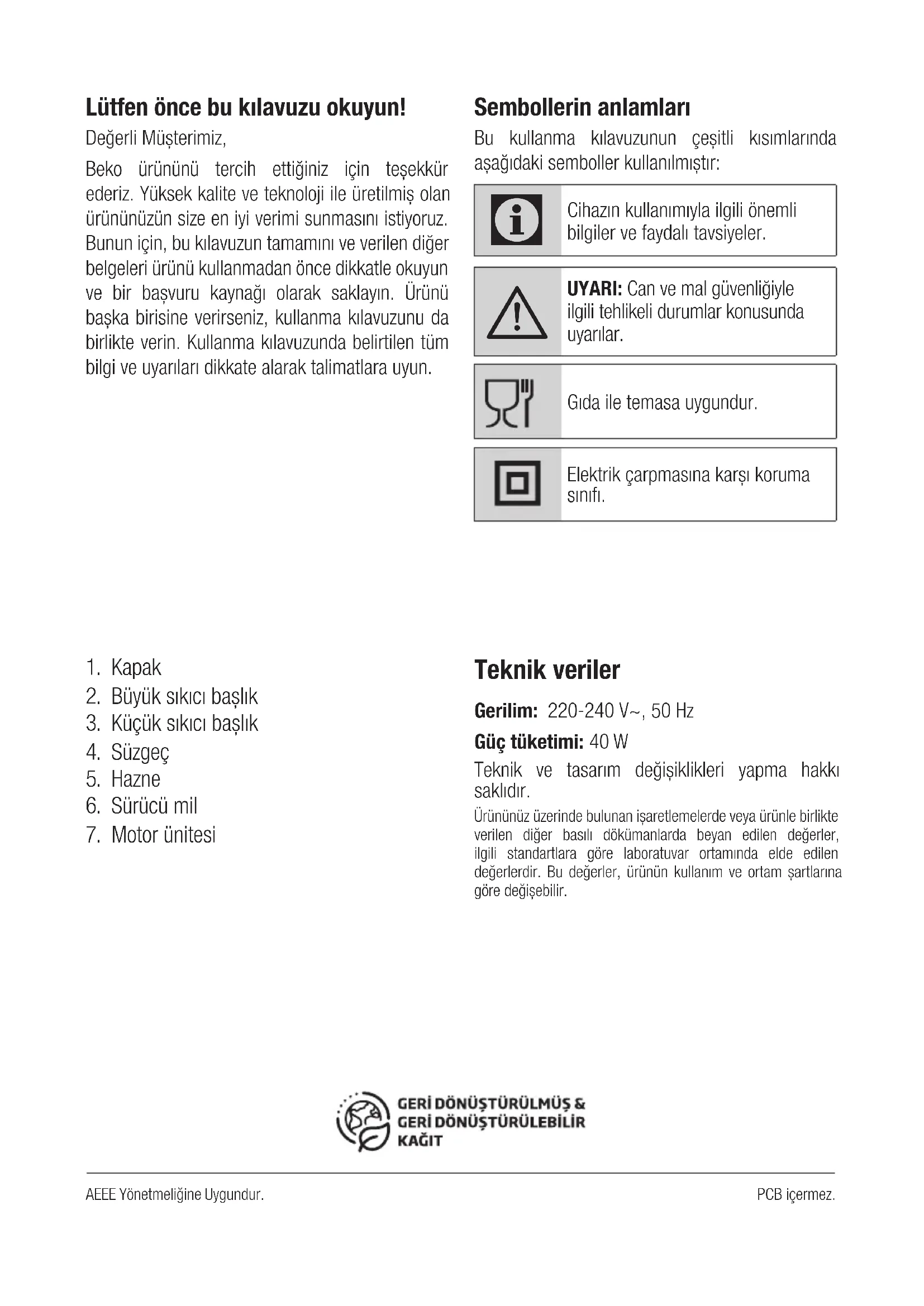 - N‘exercez pas de pression excessive sur le presse-agrumes : Si le moteur commence à faire un bruit plus important que d’habitude ou si sa vitesse baisse considérablement, c‘est qu‘une pression excessive est en train d’être exercée sur la tête. • Après 3 minutes de pressage, laissez refroidir le moteur à la température ambiante. • Ne touchez pas le réservoir à jus lors du fonctionnement. Toujours tenir la partie inférieure du bloc moteur lors de la pression du fruit.Lütfen önce bu kılavuzu okuyun! Değerli Müşterimiz,Beko ürününü tercih ettiğiniz için teşekkür ederiz. Yüksek kalite ve teknoloji ile üretilmiş olan ürününüzün size en iyi verimi sunmasını istiyoruz. Bunun için, bu kılavuzun tamamını ve verilen diğer belgeleri ürünü kullanmadan önce dikkatle okuyun ve bir başvuru kaynağı olarak saklayın. Ürünü başka birisine verirseniz, kullanma kılavuzunu da birlikte verin. Kullanma kılavuzunda belirtilen tüm bilgi ve uyarıları dikkate alarak talimatlara uyun. Sembollerin anlamları Bu kullanma kılavuzunun çeşitli kısımlarında aşağıdaki semboller kullanılmıştır: Cihazın kullanımıyla ilgili önemli bilgiler ve faydalı tavsiyeler. UYARI: Can ve mal güvenliğiyle ilgili tehlikeli durumlar konusunda uyarılar.Gıda ile temasa uygundur.Elektrik çarpmasına karşı koruma sınıfı.AEEE Yönetmeliğine Uygundur.PCB içermez.