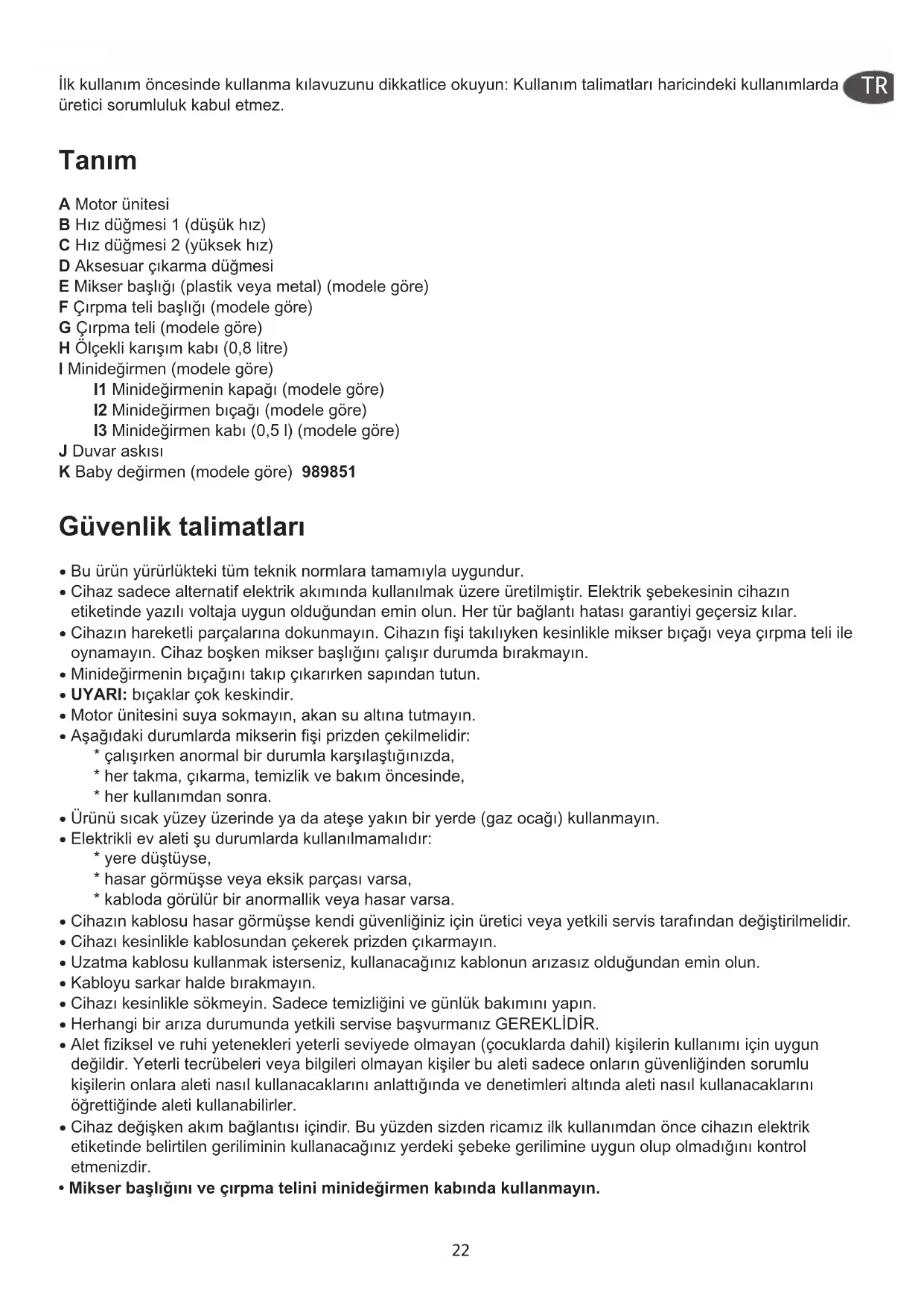 - Mikser başlığını ve çırpma telini minideğirmen kabında kullanmayın. TR23 Çalıştırma İlk kullanım öncesinde cihazın parçalarını su ve deterjanla yıkayın. İyice durulayın ve kurulayın. UYARI: bıçaklar çok keskindi Mikser başlığının kullanımı: Başlığı (E) motor ünitesine (A) oturtun, tık sesi duyacaksınız. Mikser sos, çorba, kokteyl, sütlü kokteyl, mayonez, krep hamuru, waffle hamuru ve bebek mamaları hazırlamak için idealdir. Malzemelerin etrafa sıçramasını önlemek için öncelikle mikser başlığını hazırlayacağınız yiyeceğe sokun, cihazın fişini takın ve (B) ya da (C) düğmesine basın. Malzemelerin daha iyi karışması için aşağıdan yukarıya doğru daireler çizin. Kullandıktan sonra cihazın fişini çekin, aksesuar çıkarma düğmesine (D) basın ve mikser başlığını çıkarın. Çırpma telinin kullanımı: Çırpma telini (G) başlığına (F) takın ve başlığı motor ünitesine oturtun (A), tık sesi duyacaksınız. Çırpma teli yardımıyla sıvı karışımlar hazırlayabilirsiniz (krep hamuru, yumurta beyazından kar, krem şanti….). Cihazın fişini takın, (B) ya da (C) düğmesine basın. Cihazın fişini çektikten sonra aksesuar çıkarma düğmesine (D) basın ve çırpma telini çıkarın. Minideğirmenin kullanımı: Minideğirmeni kullanmadan önce: