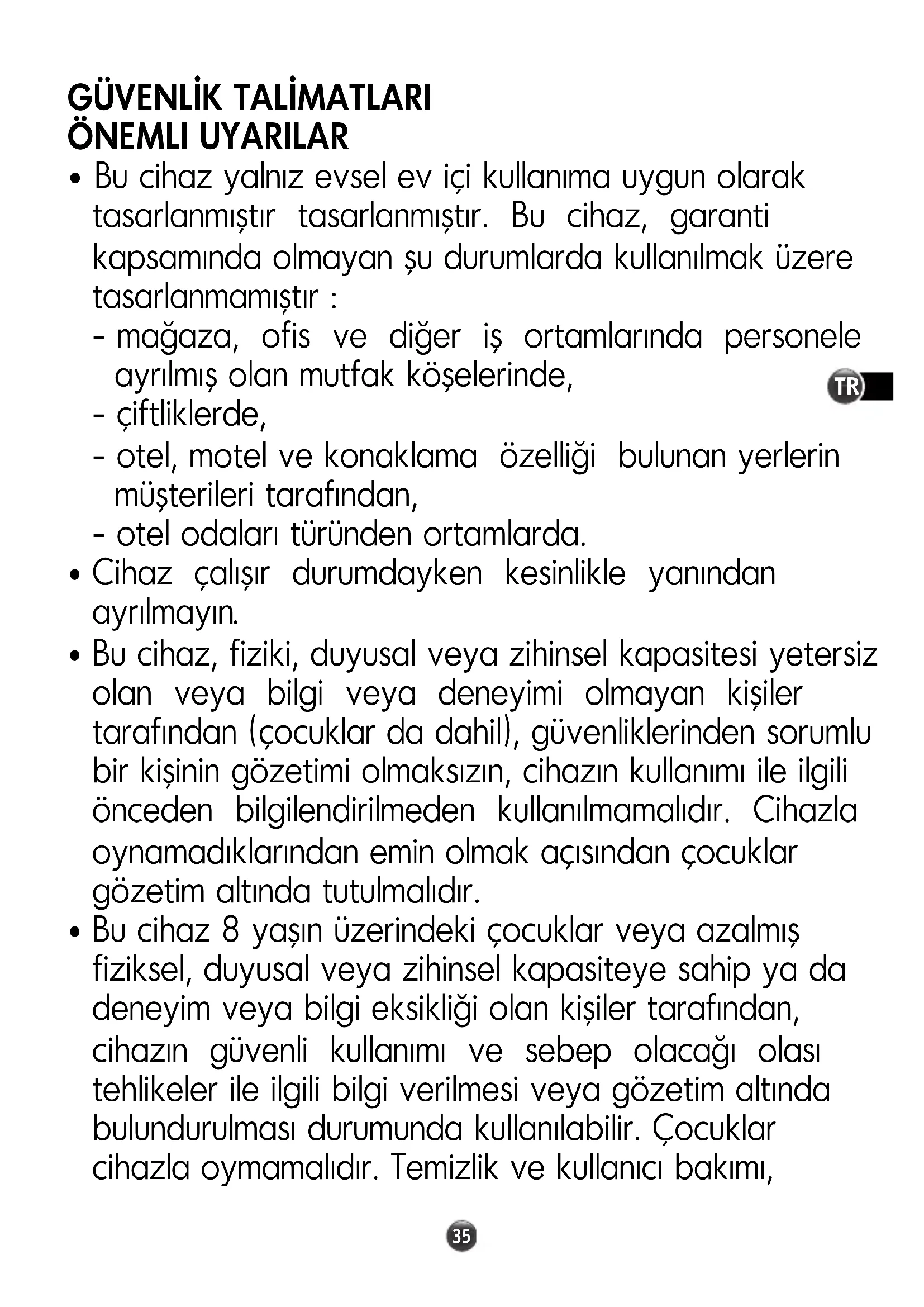 Bu cihaz, fiziki, duyusal veya zihinsel kapasitesi yetersiz olan veya bilgi veya deneyimi olmayan kişiler tarafından (çocuklar da dahil), güvenliklerinden sorumlu bir kişinin gözetimi olmaksızın, cihazın kullanımı ile ilgili önceden bilgilendirilmeden kullanılmamalıdır. Cihazla oynamadıklarından emin olmak açısından çocuklar gözetim altında tutulmalıdır.