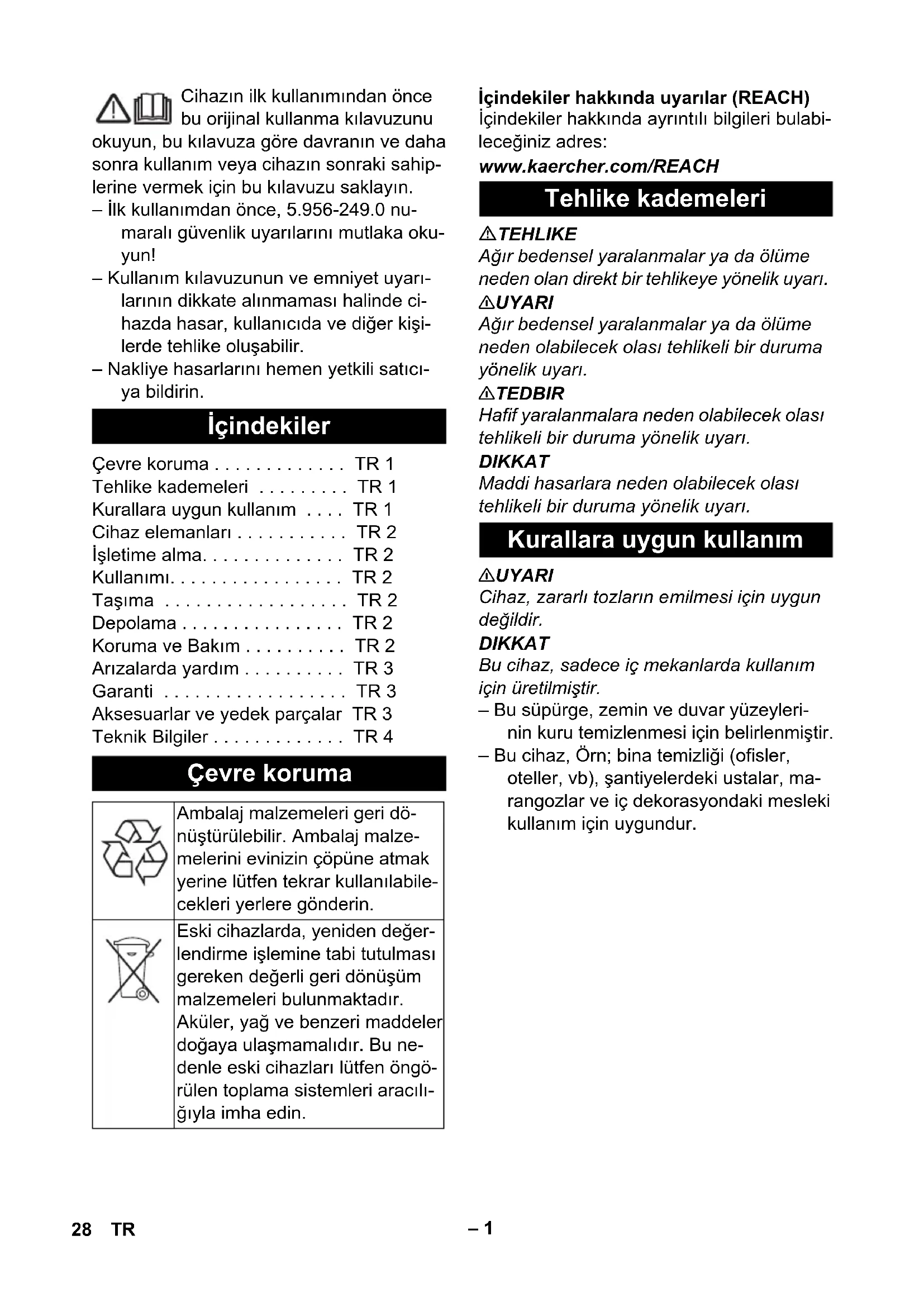 Best.nr. Kabellengde EU 9.770-650.0 7,5 m 27NO– 1 Cihazın ilk kullanımından önce bu orijinal kullanma kılavuzunu okuyun, bu kılavuza göre davranın ve daha sonra kullanım veya cihazın sonraki sahip- lerine vermek için bu kılavuzu saklayın. – İlk kullanımdan önce, 5.956-249.0 nu- maralı güvenlik uyarılarını mutlaka oku- yun! – Kullanım kılavuzunun ve emniyet uyarı- larının dikkate alınmaması halinde ci- hazda hasar, kullanıcıda ve diğer kişi- lerde tehlike oluşabilir. – Nakliye hasarlarını hemen yetkili satıcı- ya bildirin. İçindekiler hakkında uyarılar (REACH) İçindekiler hakkında ayrıntılı bilgileri bulabi- leceğiniz adres: www.kaercher.com/REACH TEHLIKE Ağır bedensel yaralanmalar ya da ölüme neden olan direkt bir tehlikeye yönelik uyarı. 몇 UYARI Ağır bedensel yaralanmalar ya da ölüme neden olabilecek olası tehlikeli bir duruma yönelik uyarı. 몇 TEDBIR Hafif yaralanmalara neden olabilecek olası tehlikeli bir duruma yönelik uyarı. DIKKAT Maddi hasarlara neden olabilecek olası tehlikeli bir duruma yönelik uyarı. 몇 UYARI Cihaz, zararlı tozları n emilmesi için uygun değildir. DIKKAT Bu cihaz, sadece iç mekanlarda kullanım için üretilmiştir. – Bu süpürge, zemin ve duvar yüzeyleri- nin kuru temizlenmesi için belirlenmiştir. – Bu cihaz, Örn; bina temizliği (ofisler, oteller, vb), şantiyelerdeki ustalar, ma- rangozlar ve iç dekorasyondaki mesleki kullanım için uygundur. İçindekiler Çevre koruma . . . . . . . . . . . . . TR 1 Tehlike kademeleri . . . . . . . . . TR 1 Kurallara uygun kullanım . . . . TR 1 Cihaz elemanları . . . . . . . . . . . TR 2 İşletime alma. . . . . . . . . . . . . . TR 2 Kullanımı. . . . . . . . . . . . . . . . . TR 2 Taşıma . . . . . . . . . . . . . . . . . . TR 2 Depolama . . . . . . . . . . . . . . . . TR 2 Koruma ve Bakım . . . . . . . . . . TR 2 Arızalarda yardım . . . . . . . . . . TR 3 Garanti . . . . . . . . . . . . . . . . . . TR 3 Aksesuarlar ve yedek parçalar TR 3 Teknik Bilgiler . . . . . . . . . . . . . TR 4 Çevre koruma Ambalaj malzemeleri geri dö- nüştürülebilir. Ambalaj malze- melerini evinizin çöpüne atmak yerine lütfen tekrar kullanılabile- cekleri yerlere gönderin. Eski cihazlarda, yeniden değer- lendirme işlemine tabi tutulması gereken değerli geri dönüşüm malzemeleri bulunmaktadır. Aküler, yağ ve benzeri maddeler doğaya ulaşmamalıdır. Bu ne- denle eski cihazları lütfen öngö- rülen toplama sistemleri aracılı- ğıyla imha edin. Tehlike kademeleri Kurallara uygun kullanım 28 TR– 2 1 Kağıt filtre torbası 2 Emme ağzı 3 Manifoldlu süpürme hortumu 4 Tip levhası 5 Taşıma kolu 6 Kablo kancası 7 Elektrik kablosu 8 Emme başlığı 9 Süpürge kafasının kilidi 10 Aksesuar yuvası 11 Yönlendirme makarası 12 Zbiornik na zanieczyszczenia 13 Ana şalter 14 Sert yüzey/halı zemin değiştiricisi 15 Taban memesi 16 Vakum borusu 17 Ana filtre sepeti 18 Motor koruma filtresi 19 Motor koruma filtresinin ızgarası Ana filtre sepetinin cihaza yerleştirilmiş olup olmadığının kontrolü. 1 Kağıt filtre poşetiyle çalışma 2 Filtre torbası olmadan çalışma Emme kafasının kilidini açın ve kafayı çıkartın. Ana filtre sepetini çıkartın. Kağıt filtre torbasını takın. Ana filtre sepetini yerleştirin. Emme kafasını yerleştirin ve kilitleyin. Şebeke fişini takın. Cihazı ana şalterden açın. Taban memesi değiştiricisini sert yüzey veya halı zemine ayarlayın. Temizliği yapın. Cihazı ana şalterden kapatın. Şebeke fişini prizden çekiniz. Kabı boşaltın. 몇 TEDBIR Yaralanma ve hasar tehlikesi! Taşıma sıra- sında cihazın ağırlığına dikkat edin. Araçlarda taşıma sırasında, cihazı ge- çerli yönetmeliklere göre kaymaya ve devrilmeye karşı emniyete alın. 몇 TEDBIR Yaralanma ve hasar tehlikesi! Depolama sırasında cihazın ağırlığına dikkat edin. Bu cihaz sadece iç mekanlarda depolan- malıdır. TEHLIKE Cihazdaki tüm çalışmalardan önce cihaz