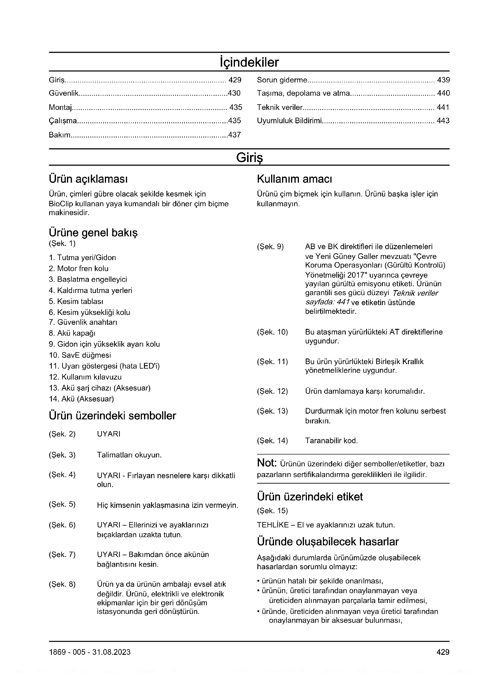 1869 - 005 - 31.08.2023gelmeyin. Dikkatsizce gerçekleştirilen işlemler bir anda ciddi yaralanmalara neden olabilir. Ürün kullanımı ve bakımı