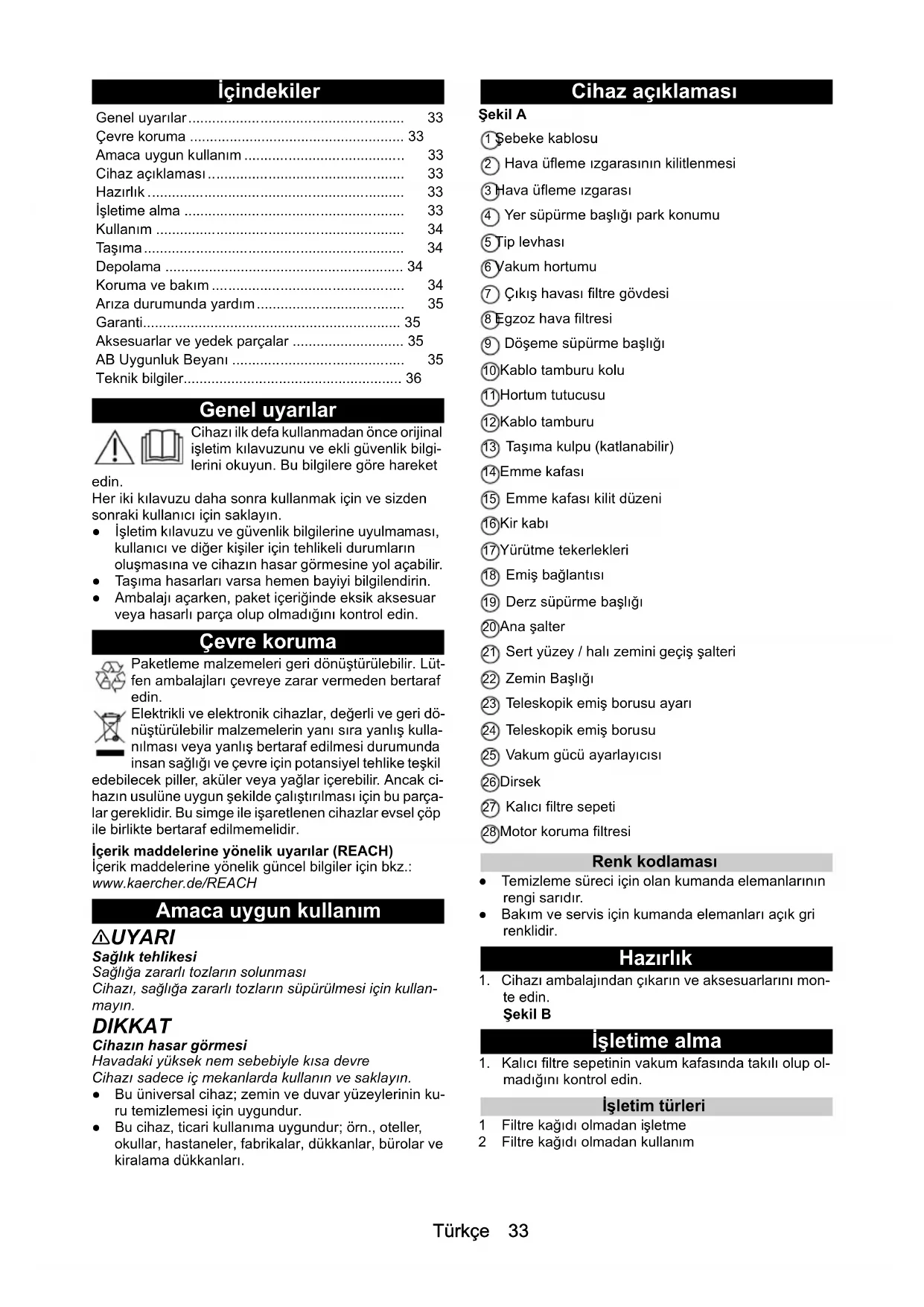 H05VV 2x1,0 GF H05VV 2x1,0 GF Onderdeelnummer (EU) 6.650-915.0 6.650-915.0 Onderdeelnummer (GB) 6.652-282.0 6.652-282.0 Onderdeelnummer (CH) 6.652-281.0 6.652-281.0 Kabellengte m 12 12Türkçe 33 İçindekiler Genel uyarılar Cihazı ilk defa kullanmadan önce orijinal işletim kılavuzunu ve ekli güvenlik bilgi- lerini okuyun. Bu bilgilere göre hareket edin. Her iki kılavuzu daha sonra kullanmak için ve sizden sonraki kullanıcı için saklayın. ●İşletim kılavuzu ve güvenlik bilgilerine uyulmaması, kullanıcı ve diğer kişiler için tehlikeli durumların oluşmasına ve cihazın hasar görmesine yol açabilir. ● Taşıma hasarları varsa hemen bayiyi bilgilendirin. ● Ambalajı açarken, paket içeriğinde eksik aksesuar veya hasarlı parça olup olmadığını kontrol edin. Çevre koruma Paketleme malzemeleri geri dönüştürülebilir. Lüt- fen ambalajları çevreye zarar vermeden bertaraf edin. Elektrikli ve elektronik cihazlar, değerli ve geri dö- nüştürülebilir malzemelerin yanı sıra yanlış kulla- nılması veya yanlış bertaraf edilmesi durumunda insan sağlığı ve çevre için potansiyel tehlike teşkil edebilecek piller, aküler veya yağlar içerebilir. Ancak ci- hazın usulüne uygun şekilde çalıştırılması için bu parça- lar gereklidir. Bu simge ile işaretlenen cihazlar evsel çöp ile birlikte bertaraf edilmemelidir. İçerik maddelerine yönelik uyarılar (REACH) İçerik maddelerine yönelik güncel bilgiler için bkz.: www.kaercher.de/REACH Amaca uygun kullanım 몇 UYARI Sağlık tehlikesi Sağlığa zararlı tozların solunması Cihazı, sağlığa zararlı tozların süpürülmesi için kullan- mayın. DIKKAT Cihazın hasar görmesi Havadaki yüksek nem sebebiyle kısa devre Cihazı sadece iç mekanlarda kullanın ve saklayın. ● Bu üniversal cihaz; zemin ve duvar yüzeylerinin ku- ru temizlemesi için uygundur. ● Bu cihaz, ticari kullanı ma uygundur; örn., oteller, okullar, hastaneler, fabrikalar, dükkanlar, bürolar ve kiralama dükkanları. Cihaz açıklaması Şekil A 1 Şebeke kablosu 2 Hava üfleme ızgarasının kilitlenmesi 3 Hava üfleme ızgarası 4 Yer süpürme başlığı park konumu 5 Tip levhası 6 Vakum hortumu 7 Çıkış havası filtre gövdesi 8 Egzoz hava filtresi 9 Döşeme süpürme başlığı 10 Kablo tamburu kolu 11 Hortum tutucusu 12 Kablo tamburu 13 Taşıma kulpu (katlanabilir) 14 Emme kafası 15 Emme kafası kilit düzeni 16 Kir kabı 17 Yürütme tekerlekleri 18 Emiş bağlantısı 19 Derz süpürme başlığı 20 Ana şalter 21 Sert yüzey / halı zemini geçiş şalteri 22 Zemin Başlığı 23 Teleskopik emiş borusu ayarı 24 Teleskopik emiş borusu 25 Vakum gücü ayarlayıcısı 26 Dirsek 27 Kalıcı filtre sepeti 28 Motor koruma filtresi Renk kodlaması ● Temizleme süreci için olan kumanda elemanlarının rengi sarıdır. ● Bakım ve servis için kumanda elemanları açık gri renklidir. Hazırlık