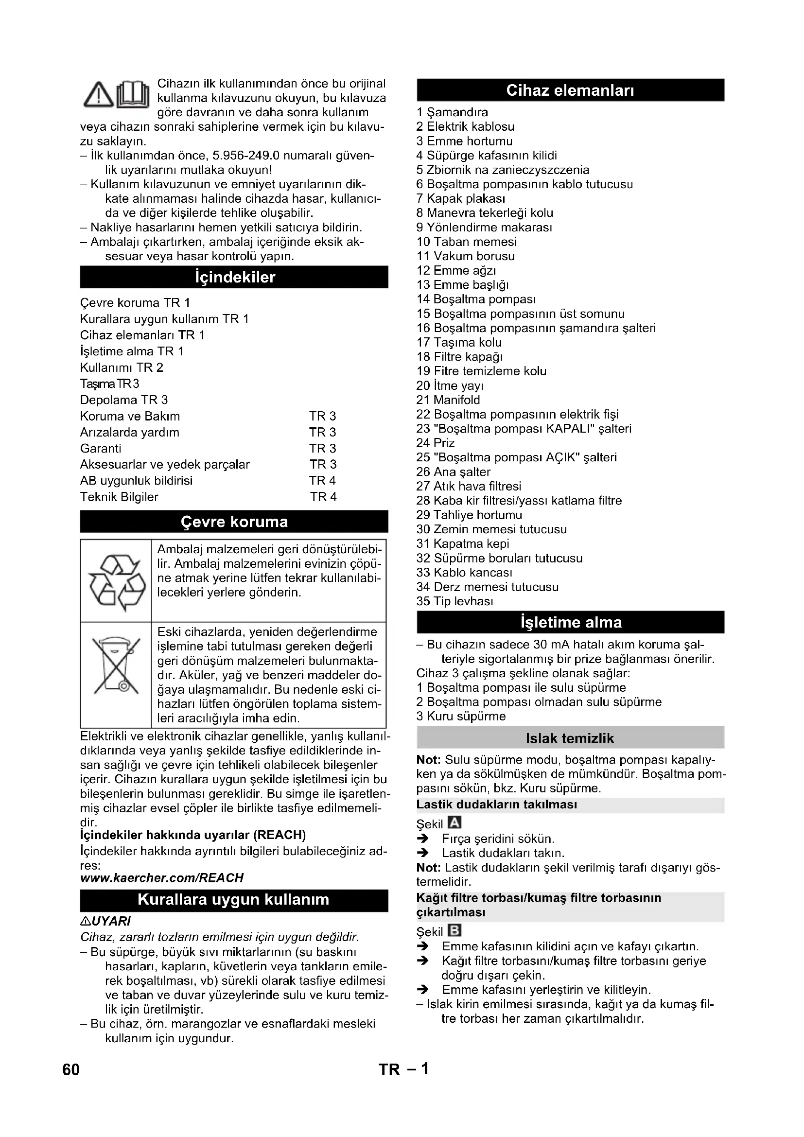 Αριθ. ανταλλ. Μήκος καλωδίου EU 6.649-413.0 10 m CH 6.649-254.0 10 m 59EL– 1 Cihazın ilk kullanımından önce bu orijinal kullanma kılavuzunu okuyun, bu kılavuza göre davranın ve daha sonra kullanım veya cihazın sonraki sahiplerine vermek için bu kılavu- zu saklayın. – İlk kullanımdan önce, 5.956-249.0 numaralı güven- lik uyarılarını mutlaka okuyun! – Kullanım kılavuzunun ve emniyet uyarılarının dik- kate alınmaması halinde cihazda hasar, kullanıcı- da ve diğer kişilerde tehlike oluşabilir. – Nakliye hasarlarını hemen yetkili satıcıya bildirin. – Ambalajı çıkartırken, ambalaj içeriğinde eksik ak- sesuar veya hasar kontrolü yapın. Elektrikli ve elektronik cihazlar genellikle, yanlış kullanıl- dıklarında veya yanlış şekilde tasfiye edildiklerinde in- san sağlığı ve çevre için tehlikeli olabilecek bileşenler içerir. Cihazın kurallara uygun şekilde işletilmesi için bu bileşenlerin bulunması gereklidir. Bu simge ile işaretlen- miş cihazlar evsel çöpler ile birlikte tasfiye edilmemeli- dir. İçindekiler hakkında uyarılar (REACH) İçindekiler hakkında ayrıntılı bilgileri bulabileceğiniz ad- res: www.kaercher.com/REACH 몇 UYARI Cihaz, zararlı tozların emilmesi için uygun değildir. – Bu süpürge, büyük sıvı miktarlarının (su baskını hasarları, kapların, küvetlerin veya tankların emile- rek boşaltılması, vb) sürekli olarak tasfiye edilmesi ve taban ve duvar yüzeylerinde sulu ve kuru temiz- lik için üretilmiştir. – Bu cihaz, örn. marangozlar ve esnaflardaki mesleki kullanım için uygundur. 1 Şamandıra 2 Elektrik kablosu 3 Emme hortumu 4 Süpürge kafasının kilidi 5 Zbiornik na zanieczyszczenia 6 Boşaltma pompasının kablo tutucusu 7 Kapak plakası 8 Manevra tekerleği kolu 9 Yönlendirme makarası 10 Taban memesi 11 Vakum borusu 12 Emme ağzı 13 Emme başlığı 14 Boşaltma pompası 15 Boşaltma pompasının üst somunu 16 Boşaltma pompasının şamandıra şalteri 17 Taşıma kolu 18 Filtre kapağı 19 Fitre temizleme kolu 20 İtme yayı 21 Manifold 22 Boşaltma pompasının elektrik fişi 23 "Boşaltma pompası KAPALI" şalteri 24 Priz 25 "Boşaltma pompası AÇIK" şalteri 26 Ana şalter 27 Atık hava filtresi 28 Kaba kir filtresi/yassı katlama filtre 29 Tahliye hortumu 30 Zemin memesi tutucusu 31 Kapatma kepi 32 Süpürme boruları tutucusu 33 Kablo kancası 34 Derz memesi tutucusu 35 Tip levhası – Bu cihazın sadece 30 mA hatalı akım koruma şal- teriyle sigortalanmış bir prize bağlanması önerilir. Cihaz 3 çalışma şekline olanak sağlar: 1 Boşaltma pompası ile sulu süpürme 2 Boşaltma pompası olmadan sulu süpürme 3 Kuru süpürme Not: Sulu süpürme modu, boşaltma pompası kapalıy- ken ya da sökülmüşken de mümkündür. Boşaltma pom- pasını sökün, bkz. Kuru süpürme. Şekil Fırça şeridini sökün. Lastik dudakları takın. Not: Lastik dudakların şekil verilmiş tarafı dışarıyı gös- termelidir. Şekil Emme kafasının kilidini açın ve kafayı çıkartın. Kağıt filtre torbasını/kumaş filtre torbasını geriye doğru dışarı çekin. Emme kafasını yerleştirin ve kilitleyin. – Islak kirin emilmesi sırasında, kağıt ya da kumaş fil- tre torbası her zaman çıkartılmalıdır. İçindekiler Çevre koruma TR 1 Kurallara uygun kullanım TR 1 Cihaz elemanları TR 1 İşletime alma TR 1 Kullanımı TR 2 Taşıma TR 3 Depolama TR 3 Koruma ve Bakım TR 3 Arızalarda yardım TR 3 Garanti TR 3 Aksesuarlar ve yedek parçalar TR 3 AB uygunluk bildirisi TR 4 Teknik Bilgiler TR 4 Çevre koruma Ambalaj malzemeleri geri dönüştürülebi- lir. Ambalaj malzemelerini evinizin çöpü- ne atmak yerine lütfen tekrar kullanılabi- lecekleri yerlere gönderin. Eski cihazlarda, yeniden değerlendirme işlemine tabi tutulması gereken değerli geri dönüşüm malzemeleri bulunmakta- dır. Aküler, yağ ve benzeri maddeler do- ğaya ulaşmamalıdır. Bu nedenle eski ci- hazları lütfen öngörülen toplama sistem- leri aracılığıyla imha edin. Kurallara uygun kullanım Cihaz elemanları İşletime alma Islak temizlik Lastik dudakların takılması Kağıt filtre torbası/kumaş filtre torbasının çıkartılması 60 TR– 2 Şekil Emme kafasının kilidini açın ve kafayı çıkartın. Diyafram filtresini çıkartın. Emme kafasını yerleştirin ve kilitleyin. – Islak kirin emilmesi sırasında, diyafram filtresi her zaman çıkartılmalıdır. Filtre kapağını açın. Yassı katlama filtresini çıkartın. Kapa kir filtresini takın. Filtre kapağını kapatın; duyulur bir şekilde kilitlen- melidir. Şekil Kapağı çıkarın. Boşaltma hortumunu bağlayın (nominal genişlik 3/ 4" veya daha büyük). 몇 TEDBIR Yerel atık su işleme talimatlarına uyun. Şekil Pis suyu, tahliye hortumuyla boşaltın. DIKKAT Süpürme sırasında kaba kir filtresini kesinlikle çıkartma- yın. – Boşaltma pompası olmadan sulu süpürme: Bir özel filtre torbasının (sulu) kullanılması önerilir (Bkz. Fil- tre sistemleri). – Maksimum sıvı seviyesine ulaşılması durumunda cihaz otomatik olarak kapatılır. – Sulu süpürmenin tamamlanmasından sonra: Şa- mandıra, hazne ve gerekirse boşaltma pompasını nemli bir bezle temizleyin ve kurutun. DIKKAT Kuru süpürmeden önce: Boşaltma pompasını sökün ve yassı katlama filtresini takın. Not: Kuru süpürme sırasında genel olarak bir yassı kat- lama filtresi kullanılmalıdır. DIKKAT Emme sırasında yassı katlama filtresi kesinlikle çıkartıl- mamalıdır. – İnce tozun emilmesi sırasında, ek olarak bir kağıt filtre torbası, bir elyaf filtre torbası ya da diyafram filtresi kullanılabilir. Boşaltma pompasının elektrik fişini çıkartın. Emme kafasının kilidini açın ve kafayı çıkartın. Şekil Boşaltma pompasının üst somununu sökün.