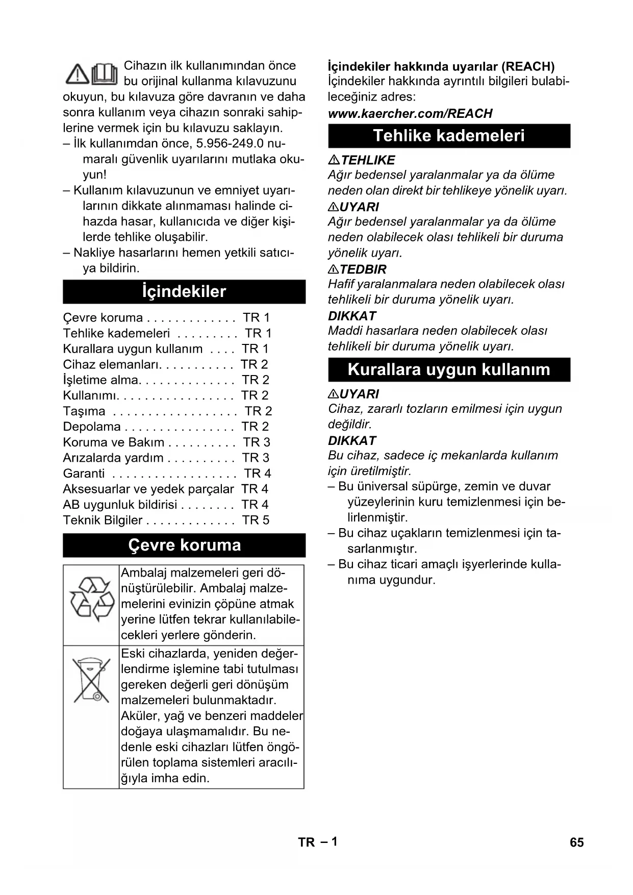 6.650-589.0 25 m 64 EL– 1 Cihazın ilk kullanımından önce bu orijinal kullanma kılavuzunu okuyun, bu kılavuza göre davranın ve daha sonra kullanım veya cihazın sonraki sahip- lerine vermek için bu kılavuzu saklayın. – İlk kullanımdan önce, 5.956-249.0 nu- maralı güvenlik uyarılarını mutlaka oku- yun! – Kullanım kılavuzunun ve emniyet uyarı- larının dikkate alınmaması halinde ci- hazda hasar, kullanıcıda ve diğer kişi- lerde tehlike oluşabilir. – Nakliye hasarlarını hemen yetkili satıcı- ya bildirin. İçindekiler hakkında uyarılar (REACH) İçindekiler hakkında ayrıntılı bilgileri bulabi- leceğiniz adres: www.kaercher.com/REACH TEHLIKE Ağır bedensel yaralanmalar ya da ölüme neden olan direkt bir tehlikeye yönelik uyarı. 몇 UYARI Ağır bedensel yaralanmalar ya da ölüme neden olabilecek olası tehlikeli bir duruma yönelik uyarı. 몇 TEDBIR Hafif yaralanmalara neden olabilecek olası tehlikeli bir duruma yönelik uyarı. DIKKAT Maddi hasarlara neden olabilecek olası tehlikeli bir duruma yönelik uyarı. 몇 UYARI Cihaz, zararlı tozları n emilmesi için uygun değildir. DIKKAT Bu cihaz, sadece iç mekanlarda kullanım için üretilmiştir. – Bu üniversal süpürge, zemin ve duvar yüzeylerinin kuru temizlenmesi için be- lirlenmiştir. – Bu cihaz uçakların temizlenmesi için ta- sarlanmıştır. – Bu cihaz ticari amaçlı işyerlerinde kulla- nıma uygundur. İçindekiler Çevre koruma . . . . . . . . . . . . . TR 1 Tehlike kademeleri . . . . . . . . . TR 1 Kurallara uygun kullanım . . . . TR 1 Cihaz elemanları. . . . . . . . . . . TR 2 İşletime alma. . . . . . . . . . . . . . TR 2 Kullanımı. . . . . . . . . . . . . . . . . TR 2 Taşıma . . . . . . . . . . . . . . . . . . TR 2 Depolama . . . . . . . . . . . . . . . . TR 2 Koruma ve Bakım . . . . . . . . . . TR 3 Arızalarda yardım . . . . . . . . . . TR 3 Garanti . . . . . . . . . . . . . . . . . . TR 4 Aksesuarlar ve yedek parçalar TR 4 AB uygunluk bildirisi . . . . . . . . TR 4 Teknik Bilgiler . . . . . . . . . . . . . TR 5 Çevre koruma Ambalaj malzemeleri geri dö- nüştürülebilir. Ambalaj malze- melerini evinizin çöpüne atmak yerine lütfen tekrar kullanılabile- cekleri yerlere gönderin. Eski cihazlarda, yeniden değer- lendirme işlemine tabi tutulması gereken değerli geri dönüşüm malzemeleri bulunmaktadır. Aküler, yağ ve benzeri maddeler doğaya ulaşmamalıdır. Bu ne- denle eski cihazları lütfen öngö- rülen toplama sistemleri aracılı- ğıyla imha edin. Tehlike kademeleri Kurallara uygun kullanım 65TR– 2 1 Elyaf filtre torbası 2 Emme ağzı 3 Emme hortumu 4 Tip levhası 5 Kablo kancası 6 Taşıma kolu 7 Elektrik kablosu 8 Emme başlığı 9 Süpürge kafasının kilidi 10 Yönlendirme makarası 11 Zbiornik na zanieczyszczenia 12 Ana şalter 13 Sert yüzey/halı zemin değiştiricisi 14 Taban memesi 15 Vakum borusu 16 Şebeke fişi sabitlemesi 17 Taban memesinin yuvası 18 Kapak kaplaması 19 Kapak 20 Süpürme kuvveti ayarlayıcısı (kademe- siz) 21 Manifold 22 Filtre muhafazası 23 Atık hava filtresi 24 Ana filtre sepeti 25 Motor koruma filtresi 26 Motor koruma filtresinin ızgarası – Temizlik prosesinin kullanım elemanları sarıdır. – Bakım ve servis kullanım elemanları açık gridir. Ana filtre sepetinin cihaza yerleştirilmiş olup olmadığının kontrolü. 1 Elyaf filtre torbası ya da kağıt filtre tor- bası (özel aksesuar) ile çalışma 2 Filtre torbası olmadan çalışma Emme kafasının kilidini açın ve kafayı çıkartın. Ana filtre sepetini çıkartın. Elyaf filtre torbası ya da kağıt filtre tor- basını (özel aksesuar) takın. Ana filtre sepetini yerleştirin. Emme kafasını yerleştirin ve kilitleyin. Şebeke fişini takın. Cihazı ana şalterden açın. Taban memesi değiştiricisini sert yüzey veya halı zemine ayarlayın. Süpürme kuvvetini süpürme kuvveti ayarlayıcısından ayarlayın (kademesiz). Temizliği yapın. Cihazı ana şalterden kapatın. Şebeke fişini prizden çekiniz. Kabı boşaltın. Cihazın dışını ve içini tozunu alarak ve silerek nemli bir bezle temizleyin. 몇 TEDBIR Yaralanma ve hasar tehlikesi! Taşıma sıra- sında cihazın ağırlığına dikkat edin. Araçlarda taşıma sırasında, cihazı ge- çerli yönetmeliklere göre kaymaya ve devrilmeye karşı emniyete alın. 몇 TEDBIR Yaralanma ve hasar tehlikesi! Depolama sırasında cihazın ağırlığına dikkat edin. Bu cihaz sadece iç mekanlarda depolan- malıdır. Cihaz elemanları Renk kodu İşletime alma Mod türleri Filtre torbasının takılması Kullanımı Cihazı açın Temizleme modu Cihazın kapatılması Her çalışmadan sonra Taşıma Depolama 66 TR– 3 TEHLIKE Cihazdaki tüm çalışmalardan önce cihazı kapatın ve elektrik fişini çekin. Ana filtre sepetini (yıkanabilir) gerekirse akar su altında temizleyin. DIKKAT Hasar tehlikesi! Ana filtre sepetini kesinlikle ıslak şekilde yerleştirmeyin. Atık hava filtresi: Yılda 1 kez değiştirin Kapağın kilidini açın ve kapağı çıkartın. Filtre muhafazasını dışarı alın. Atık hava filtresini filtre muhafazasın- dan dışarı alın. Yeni atık hava filtresini filtre muhafaza- sına yerleştirin. Filtre muhafazasnı yerine yerleştirin. Kapağı takın ve kilitleyin. Emme kafasının kilidini açın ve kafayı çıkartın. Motor koruma filtresinin ızgarasını aşa- ğı bastırın, döndürün ve dışarı alın. Motor koruma filtresini çıkartın. Yeni motor koruma filtresini yerleştirin. Motor koruma filtresinin ızgarasını yer- leştirin ve kilitleyin. Emme kafasını yerleştirin ve kilitleyin. TEHLIKE Cihazdaki tüm çalışmalardan önce cihazı kapatın ve elektrik fişini çekin. – Motor termik korucusu tepki verdi Elyaf filtre torbası ya da kağıt filtre tor- basını (özel aksesuar) değiştirin. Motor koruma filtresini değiştirin. Atık hava filtresini değiştirin. Tüm parçalara tı