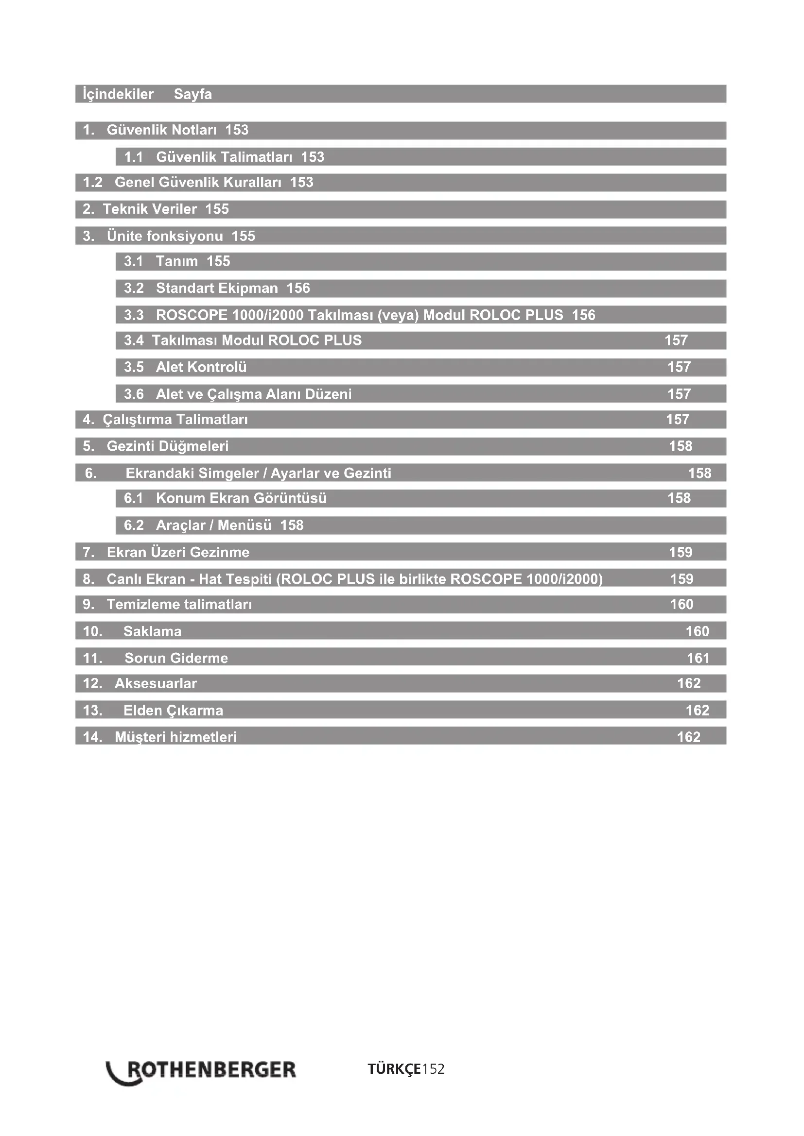Belirti Olası Neden Çözüm Ekran ünitesi açılmıyor Akü boşalmış Aküyü şarj edin Akünün akü bölmesinde olup olmadığını kontrol edin Aküyü akü bölmesine yerleştirin Elektronik arıza ROTHENBERGER Servis Merkezine Başvurun Ekran açılıyor, fakat görüntü yok. Gevşek kablo bağlantısı Kablo bağlantılarını kontrol edin. Görüntüleyici kafası pislikle kaplı Görüntüleyici kafasını temizleyin Ekran tepkisiz bir görüntü gösteriyor Görüntü işlemcisi bir hatayla karşılaşmış İşlemciyi sıfırlamak için üniteyi KAPATIN/AÇIN Akü şarj tutmuyor Saklama sırasında akü hafçe boşalmış olabilir Saklama sırasında aküyü sökün Çalışma zamanı LED kullanımına bağlı LED'lerin fazla kullanılması durumunda aküyü daha sık şarj edin Akü hasar görmüş olabilir Aküyü değiştirin Akü ömrü bitmiş Aküyü değiştirin Sinyal Yok Yanlış frekans Sondanızın frekansını teyit edin ve menü yoluyla ROLOC frekansını uygun hale getirin Derinlik ölçümü Şunu gösterir: ROLOC PLUS menzil dışındadır En güçlü sinyali teyit edin ROSCOPE 1000/i2000 Hata Kodu 1 “ş takılı değil” Görüntüleyicinin şi takılıp çalıştırıldığında ve ardından çıkarıldığında bu hata oluşur Servis Departmanına Başvurun ROSCOPE 1000/i2000 Hata Kodu 2 “Dijital / Video Senk. Yok” Dijital bir görüntüleyicinin saptandığını ancak video senkronizasyonu olmadığını gösterir Servis Departmanına Başvurun ROSCOPE 1000/i2000 Hata Kodu 3 “Analog / Video Senk. Yok” Analog bir görüntüleyicinin saptandığını ancak video senkronizasyonu olmadığını gösterir Servis Departmanına Başvurun ROSCOPE 1000/i2000 Hata Kodu 4 (PPI) “Video Verileri Doğru Formatta Değil” Video verilerinin doğru formatta olmadığını gösterir Servis Departmanına BaşvurunTÜRKÇE162 Belirti Olası Neden Çözüm ROSCOPE 1000/i2000 Hata Kodu 5 “Aurora Saptandı” Bu, görüntüleyicinin otomatik düzeltme planının (yalnızca dijital görüntüleyici) video artefaktlarına sahip bir görüntüye neden olduğu durumdur; ardından görüntüleyici sıfırlanır. Bu durum sonraki denemelerde devam ederse, bu hata oluşur. Servis Departmanına Başvurun ROSCOPE 1000/i2000 Hata Kodu 6 “Bağlı veya Bozuk Veri Hatları” Bu, sistemin kendini bir test modeli oluşturmak üzere yapılandırdığı, kendi kendine tanı hatasıdır bu model daha sonra doğrulanır. Model doğru değilse, video kaynağından ana işlemciye giden veri hatlarında bir eksiklik veya açık olduğunu gösterir. Servis Departmanına Başvurun