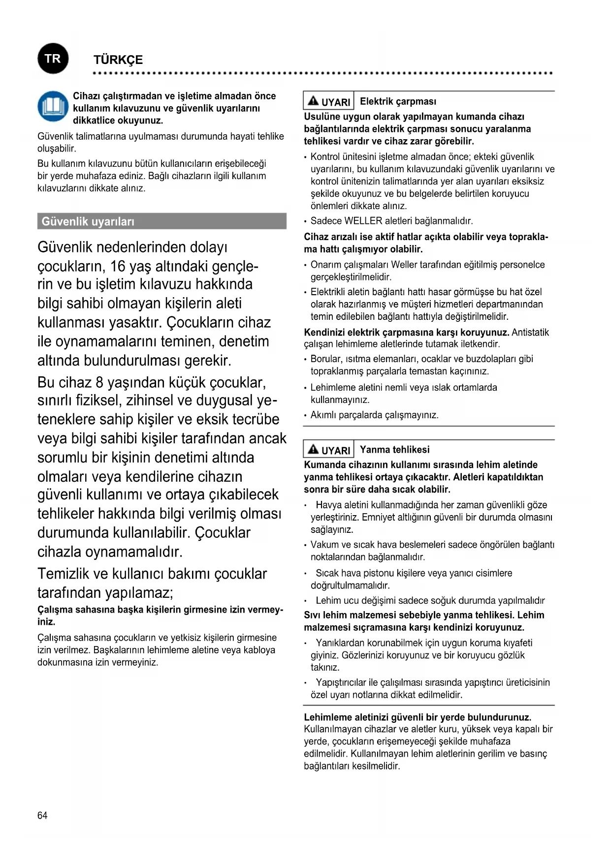 teneklere sahip kişiler ve eksik tecrübe veya bilgi sahibi kişiler tarafından ancak sorumlu bir kişinin denetimi altında olmaları veya kendilerine cihazın güvenli kullanımı ve ortaya çıkabilecek tehlikeler hakkında bilgi verilmiş olması durumunda kullanılabilir. Çocuklar cihazla oynamamalıdır. Temizlik ve kullanıcı bakımı çocuklar tarafından yapılamaz; Çalışma sahasına başka kişilerin girmesine izin vermey- iniz. Çalışma sahasına çocukların ve yetkisiz kişilerin girmesine izin verilmez. Başkalarının lehimleme aletine veya kabloya dokunmasına izin vermeyiniz. UYARI Elektrik çarpması Usulüne uygun olarak yapılmayan kumanda cihazı balantılarında elektrik çarpması sonucu yaralanma tehlikesi vardır ve cihaz zarar görebilir.