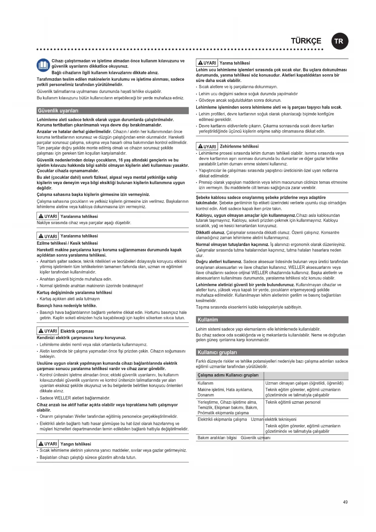 - Prensipolarakyapışkanmaddeninveyalehimmacunununcildinizetemasetmesine izinvermeyin.Bumaddelerlecilttemasısağlığınızazararverebilir. Şebeke kablosu sadece onaylanmış şebeke prizlerine veya adaptöre takılmalıdır. Şebeke geriliminin tip etiketi üzerindeki verilerle uyumlu olup olmadığını kontrol edin. Aleti sadece kapalı iken prize takın. Kabloyu, uygun olmayan amaçlar için kullanmayınız.Cihazıaslakablosundan tutaraktaşımayınız.Kabloyu,soketiprizdençekmekiçinkullanmayınız.Kabloyu sıcaklık,yağvekesicikenarlardankoruyunuz. Dikkatli olunuz. Çalışmalarsırasındadikkatliolunuz.Özenliçalışınız.Konsantre olamadığınızzamanlehimlemealetinikullanmayınız. Normal olmayan tutuşlardan kaçınınız. İşalanınızıergonomikolarakdüzenleyiniz. Çalışmalarsırasındatutmahatalarındankaçınınız,tutmahatalarıhasarlaraneden olur. Doru aletleri kullanınız. Sadeceaksesuarlistesindebulunanveyaüreticitarafından onaylananaksesuarlarıveilavecihazlarıkullanınız.WELLERaksesuarlarınıveya ilavecihazlarınısadeceorijinalWELLERcihazlarındakullanınız.Başkaaletlerinve aksesuarlarınkullanılmasıdurumunda,yaralanmatehlikesisözkonusuolabilir. Lehimleme aletinizi güvenli bir yerde bulundurunuz.Kullanılmayancihazlarve aletlerkuru,yüksekveyakapalıbiryerde,çocuklarınerişemeyeceğişekilde muhafazaedilmelidir.Kullanılmayanlehimaletleriningerilimvebasınçbağlantıları kesilmelidir. Taşımasırasındaeksenlerinikablokelepçeleriylesabitleyin. Kullanim Lehimsistemisadeceyapıelemanlarınıellelehimlemedekullanılabilir. Bucihazsadeceodasıcaklığındaveiçmekanlardakullanılabilir.Nemevedoğrudan gelengüneşışınlarınakarşıkorunmalıdır. Kullanıcı grupları Farklıdüzeyderisklervetehlikepotansiyellerinedeniylebazıçalışmaadımlarısadece eğitimliuzmanlartarafındanyürütülebilir. Çalışma adımı Kullanıcı grupları Kullanım Makineişletimi,Hataayıklama, Donanım Uzmanolmayançalışan(öğretildi,öğrenildi) Teknikeğitimgörenler,eğitimliuzmanların gözetimindevetalimatıylaçalışabilir Yerleştirme,Cihazıişletimealma, Temizlik,Ekipmanbakımı,Bakım, Pnömatikekipmanlaçalışma Teknikeğitimliuzmanpersonel Elektrikliekipmanlaçalışma Uzmanelektrikteknisyeni Teknikeğitimgörenler,eğitimliuzmanların gözetimindevetalimatıylaçalışabilir Bakımaralıklarıbilgisi Güvenlikuzmanı