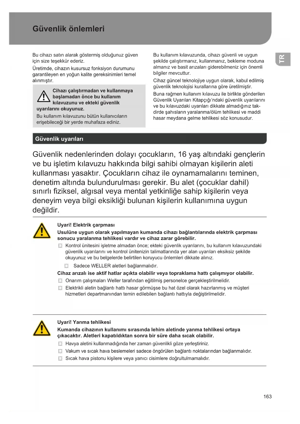 Οιαξιώσειςτουαγοραστήγιατυχόνελαττώματα παραγράφονταιμετάαπόέναέτοςαπότην παράδοσηστοναγοραστή.Αυτόδενισχύειγια αναγωγικέςαξιώσειςτουαγοραστήσύμφωναμε την§§478,479BGB. Γιαμιαεγγύησηπουδίνουμεφέρουμετηνευθύνη μόνο,ότανηεγγύησηποιότηταςήηεγγύηση αντοχήςέχειδοθείαπόεμάςγραπτάκαιμετη χρήσητουόρου«εγγύηση». Ηεγγύησηεκπίπτεισεπερίπτωσηακατάλληλης χρήσηςκαιότανπραγματοποιήθηκανεπεμβάσεις απόμηειδικευμέναάτομα. Μεεπιφύλαξητουδικαιώματοςτεχνικώναλλαγών! Πληροφορηθείτεπαρακαλώστηδιεύθυνση www.weller-tools.com. Τεχνικά στοιχεία GR163 Güvenlik önlemleri Bucihazısatınalarakgöstermişolduğunuzgüven içinsizeteşekkürederiz. Üretimde,cihazınkusursuzfonksiyondurumunu garantileyenenyoğunkalitegereksinimleritemel alınmıştır. Cihazı çalıştırmadan ve kullanmaya başlamadan önce bu kullanım kılavuzunu ve ekteki güvenlik uyarılarını okuyunuz. Bukullanımkılavuzunubütünkullanıcıların erişebileceğibiryerdemuhafazaediniz. Bukullanımkılavuzunda,cihazıgüvenliveuygun şekildeçalıştırmanız,kullanmanız,beklememoduna almanızvebasitarızalarıgiderebilmeniziçinönemli bilgiler mevcuttur. Cihazgüncelteknolojiyeuygunolarak,kabuledilmiş güvenlikteknolojisikurallarınagöreüretilmiştir. Bunarağmenkullanımkılavuzuilebirliktegönderilen GüvenlikUyarılarıKitapçığı‘ndakigüvenlikuyarılarını vebukılavuzdakiuyarılarıdikkatealmadığınıztak- dirdeşahıslarınyaralanma/ölümtehlikesivemaddi hasarmeydanagelmetehlikesisözkonusudur. Güvenlik uyarıları Güvenliknedenlerindendolayıçocukların,16yaşaltındakigençlerin vebuişletimkılavuzuhakkındabilgisahibiolmayankişilerinaleti kullanmasıyasaktır.Çocuklarıncihazileoynamamalarınıteminen, denetimaltındabulundurulmasıgerekir.Bualet(çocuklardahil) sınırlıziksel,algısalveyamentalyetkinliğesahipkişilerinveya deneyimveyabilgieksikliğibulunankişilerinkullanımınauygun değildir. Uyari! Elektrik çarpması Usulüne uygun olarak yapılmayan kumanda cihazı balantılarında elektrik çarpması sonucu yaralanma tehlikesi vardır ve cihaz zarar görebilir. Kontrolünitesiniişletmealmadanönce;ektekigüvenlikuyarılarını,bukullanımkılavuzundaki güvenlikuyarılarınıvekontrolünitenizintalimatlarındayeralanuyarılarıeksiksizşekilde okuyunuzvebubelgelerdebelirtilenkoruyucuönlemleridikkatealınız. SadeceWELLERaletleribağlanmalıdır. Cihaz arızalı ise aktif hatlar açıkta olabilir veya topraklama hattı çalışmıyor olabilir. OnarımçalışmalarıWellertarafındaneğitilmişpersonelcegerçekleştirilmelidir. Elektriklialetinbağlantıhattıhasargörmüşsebuhatözelolarakhazırlanmışvemüşteri hizmetleridepartmanındanteminedilebilenbağlantıhattıyladeğiştirilmelidir. Uyari! Yanma tehlikesi Kumanda cihazının kullanımı sırasında lehim aletinde yanma tehlikesi ortaya çıkacaktır. Aletleri kapatıldıktan sonra bir süre daha sıcak olabilir. Havyaaletinikullanmadığındaherzamangüvenlikligözeyerleştiriniz. Vakumvesıcakhavabeslemelerisadeceöngörülenbağlantınoktalarındanbağlanmalıdır. Sıcakhavapistonukişilereveyayanıcıcisimleredoğrultulmamalıdır. TR164 Uyari! Yangın ve patlama tehlikesi! Sıcak aletler nedeniyle yanma tehlikesi Havyaaletinikullanmadığındaherzamangüvenlikligözeyerleştiriniz. Sıcakhavapistonukişilereveyayanıcıcisimleredoğrultulmamalıdır. Patlayıcıveyanıcıcisimleruzaktutulmalıdır. Aletin üzeri örtülmemelidir. Uyari! Yaralanma tehlikesi Nakliyesırasındacihazveyaparçalaraşağıdüşebilir. Kullanim WELLERlehimaletlerineyönelikbeslemeünitesi. Onarımistasyonusadeceişletimkılavuzunda belirtilenlehimlemevelehimçözmeamaçlarıyla buradabelirtilenkoşullarauygunolarak kullanılmalıdır. Yanıcıgazlarınvesıvılarınemilmesi yasaktır. Bualetsadecedoğruyerleştirilmişve kullanımıöngörülmüşltrekartuşları ilebirliktekullanılmalıdır. Dolanltrekartuşlarıdeğiştirilmelidir. Aletsadecekapalımekanlardakullanılmalıdır. Nemevedoğrudangelengüneşışınlarınakarşı korunmalıdır. Amacauygunkullanımşunlarıdaiçerir Bukullanımkılavuzunudikkatealmanız, Diğerbütündokümanlarıdikkatealmanız, Kullanımyerindeulusalkazaönleme yönetmeliklerinidikkatealmanız. Cihazdakendiyaptığınızdeğişiklikleriçinüretici sorumluluk kabul etmez. Kullanıcı grupları Farklıdüzeyderisklervetehlikepotansiyellerinedeniylebazıçalışmaadımlarısadeceeğitimliuzmanlar tarafındanyürütülebilir. Çalışma adımı Kullanıcı grupları Lehim parametresi bilgisi Teknikeğitimliuzmanpersonel Elektrikliyedekparçalarındeğiştirilmesi Uzmanelektrikteknisyeni Bakımaralıklarıbilgisi Güvenlikuzmanı Kullanım Filtredeğişimi Uzmanolmayançalışan Kullanım Filtredeğişimi Elektrikliyedekparçalarındeğiştirilmesi Teknikeğitimgörenler,eğitimliuzmanlarıngözetimin- devetalimatıylaçalışabilir Güvenlik önlemleri TR165 Cihazı işletime alma Dikkat! Balı cihazların ilgili kullanım kılavuzlarını dikkate alınız. Cihazı,„İşletimealma“bölümündeaçıklanan şekildeçalıştırınız. Şebekegeriliminintipetiketiüzerindeki verilerleuyumluolupolmadığınıkontrol edin. Aletisadecekapalıikenprizetakın. Cihazıaçtıktansonramikroişlemci,bütün segmanlarınkısasüreliişletimdeolduğubirself testyürütür. Lehimleme ve lehim çıkartma Lehimçalışmalarını,bağladığınızlehimaletinin kullanımkılavuzunagöreyapınız. Havya uçlarının kullanılması İlkısıtmaişlemindenönce,lehimlenebilirseçmeli hav