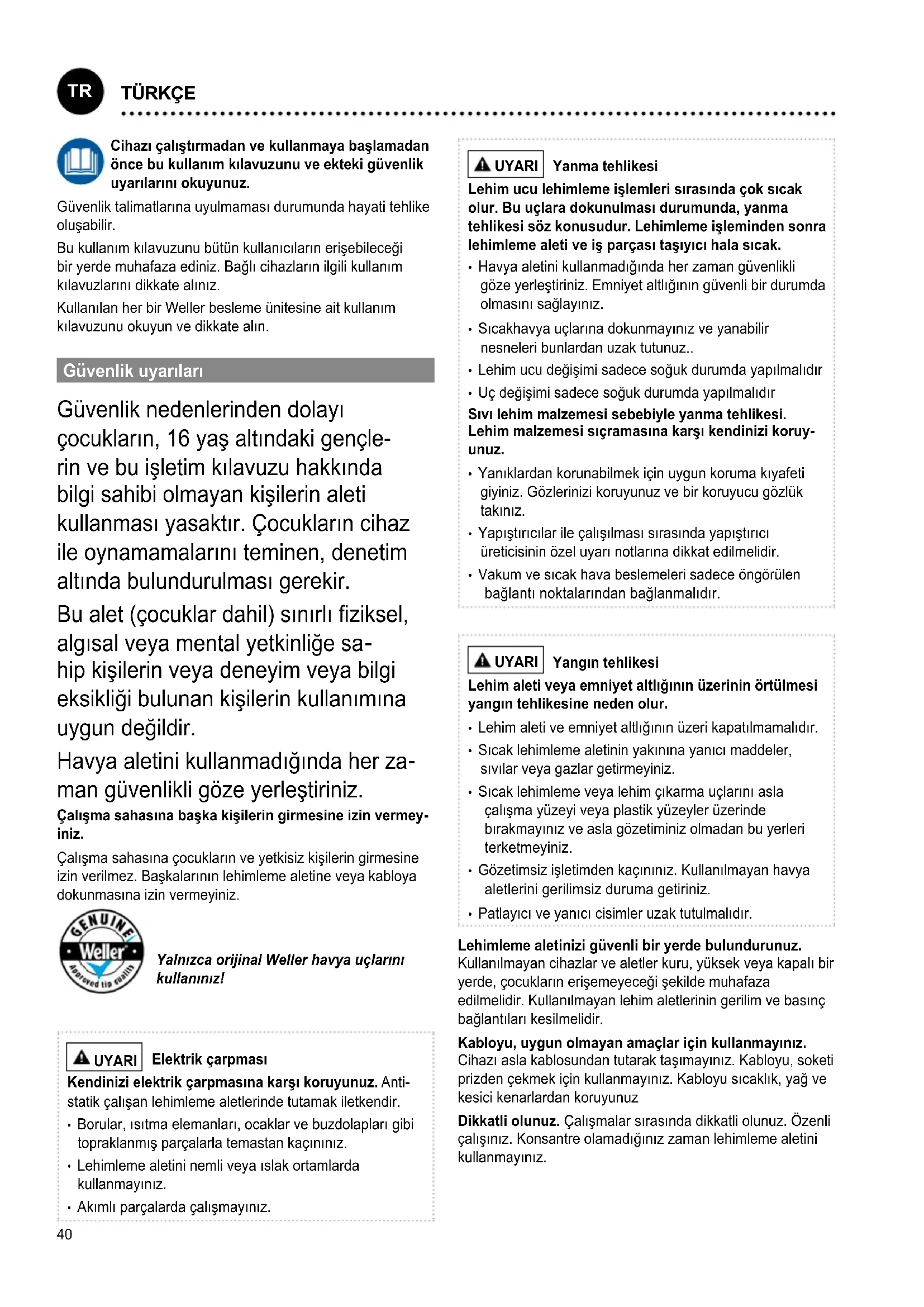 man güvenlikli göze yerleştiriniz. Çalışma sahasına başka kişilerin girmesine izin vermey- iniz. Çalışma sahasına çocukların ve yetkisiz kişilerin girmesine izin verilmez. Başkalarının lehimleme aletine veya kabloya dokunmasına izin vermeyiniz. Yalnızca orijinal Weller havya uçlarını kullanınız! UYARI Elektrik çarpması Kendinizi elektrik çarpmasına karşı koruyunuz. Anti- statik çalışan lehimleme aletlerinde tutamak iletkendir.