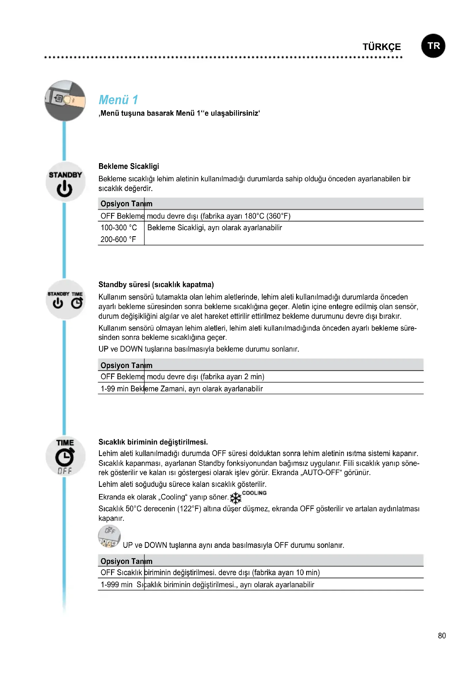 ΕΛΛΗΝΙΚΑ80 Menü 1 ‚Menü tuşuna basarak Menü 1‘‘e ulaşabilirsiniz‘ Bekleme Sicakligi Bekleme sıcaklığı lehim aletinin kullanılmadığı durumlarda sahip olduğu önceden ayarlanabilen bir sıcaklık değerdir. Opsiyon Tanım OFF Bekleme modu devre dışı (fabrika ayarı 180°C (360°F) 100-300 °C 200-600 °F Bekleme Sicakligi, ayrı olarak ayarlanabilir Standby süresi (sıcaklık kapatma) Kullanım sensörü tutamakta olan lehim aletlerinde, lehim aleti kullanılmadığı durumlarda önceden ayarlı bekleme süresinden sonra bekleme sıcaklığına geçer. Aletin içine entegre edilmiş olan sensör, durum değişikliğini algılar ve alet hareket ettirilir ettirilmez bekleme durumunu devre dışı bırakır. Kullanım sensörü olmayan lehim aletleri, lehim aleti kullanılmadığında önceden ayarlı bekleme süre- sinden sonra bekleme sıcaklığına geçer. UP ve DOWN tuşlarına basılmasıyla bekleme durumu sonlanır. Opsiyon Tanım OFF Bekleme modu devre dışı (fabrika ayarı 2 min) 1-99 min Bekleme Zamani, ayrı olarak ayarlanabilir Sıcaklık biriminin değiştirilmesi. Lehim aleti kullanılmadığı durumda OFF süresi dolduktan sonra lehim aletinin ısıtma sistemi kapanır. Sıcaklık kapanması, ayarlanan Standby fonksiyonundan bağımsız uygulanır. Fiili sıcaklık yanıp söne- rek gösterilir ve kalan ısı göstergesi olarak işlev görür. Ekranda „AUTO-OFF“ görünür. Lehim aleti soğuduğu sürece kalan sıcaklık gösterilir. Ekranda ek olarak „Cooling“ yanıp söner. Sıcaklık 50°C derecenin (122°F) altına düşer düşmez, ekranda OFF gösterilir ve artalan aydınlatması kapanır. UP ve DOWN tuşlarına aynı anda basılmasıyla OFF durumu sonlanır. Opsiyon Tanım OFF Sıcaklık biriminin değiştirilmesi. devre dışı (fabrika ayarı 10 min) 1-999 min Sıcaklık biriminin değiştirilmesi., ayrı olarak ayarlanabilir