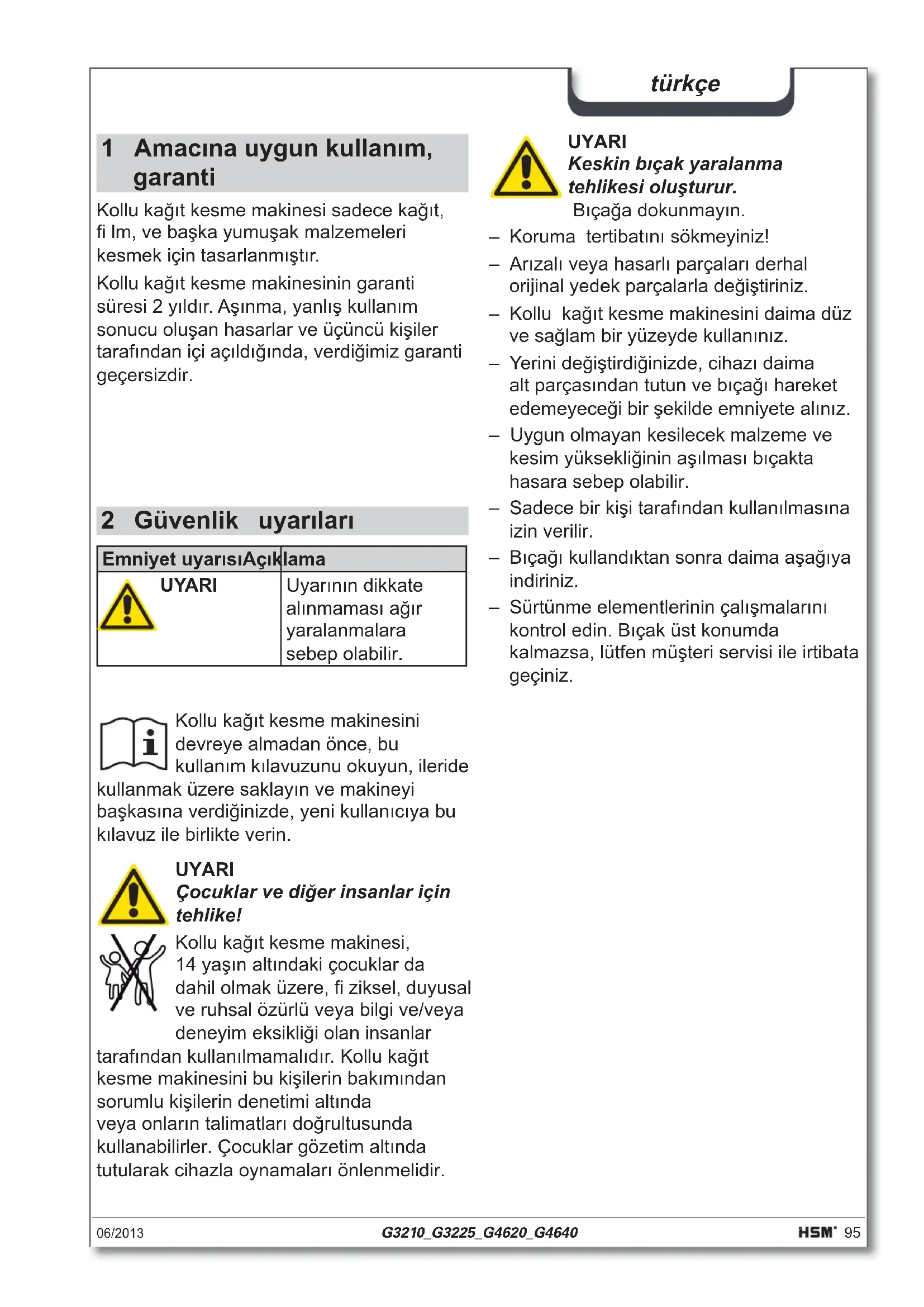 Μέγιστο ύψος κοπής (mm) 1,0 2,5 2,0 4,0 Μέγιστο μέγεθος A4 A4 A3 A3 Μήκος κοπής (mm) 325 325 460 460 Συμπίεση χειροκίνητα αυτόματα αυτόματα αυτόματα Επιφάνεια εργασίας (mm) 325 x 155 325 x 230 460 x 230 460 x 320 Διαστάσεις (mm) 605 x 280 x 75 606 x 308 x 122 737 x 362 x 122 750 x 406 x 133 Βάρος (kg) 2,12 3,72 4,66 7,30 Υπόδειξη: Για μείωση του αναγκαίου χώρου κατά τη φύλαξη και για σταθεροποίηση του μαχαιριού κατά τη μεταφορά της συσκευής μπορείτε να στρέψετε το προστατευτικό κάλυμμα. Αυτό όμως είναι δυνατό μόνο όταν το μαχαίρι βρίσκεται στην κάτω θέση.94 G3210_G3225_G4620_G4640 06/2013 ελληνικά06/2013 G3210_G3225_G4620_G4640 95 türkçe 1 Amacına uygun kullanım, garanti Kollu kağıt kesme makinesi sadece kağıt, fi lm, ve başka yumuşak malzemeleri kesmek için tasarlanmıştır. Kollu kağıt kesme makinesinin garanti süresi 2 yıldır. Aşınma, yanlış kullanım sonucu oluşan hasarlar ve üçüncü kişiler tarafından içi açıldığında, verdiğimiz garanti geçersizdir. 2 Güvenlik uyarıları Emniyet uyarısı Açıklama UYARI Uyarının dikkate alınmaması ağır yaralanmalara sebep olabilir. Kollu kağıt kesme makinesini devreye almadan önce, bu kullanım kılavuzunu okuyun, ileride kullanmak üzere saklayın ve makineyi başkasına verdiğinizde, yeni kullanıcıya bu kılavuz ile birlikte verin. UYARI Çocuklar ve diğer insanlar için tehlike! Kollu kağıt kesme makinesi, 14 yaşın altındaki çocuklar da dahil olmak üzere, fi ziksel, duyusal ve ruhsal özürlü veya bilgi ve/veya deneyim eksikliği olan insanlar tarafından kullanılmamalıdır. Kollu kağıt kesme makinesini bu kişilerin bakımından sorumlu kişilerin denetimi altında veya onların talimatları doğrultusunda kullanabilirler. Çocuklar gözetim altında tutularak cihazla oynamaları önlenmelidir. UYARI Keskin bıçak yaralanma tehlikesi oluşturur. Bıçağa dokunmayın. – Koruma tertibatını sökmeyiniz! – Arızalı veya hasarlı parçaları derhal orijinal yedek parçalarla değiştiriniz. – Kollu kağıt kesme makinesini daima düz ve sağlam bir yüzeyde kullanınız. – Yerini değiştirdiğinizde, cihazı daima alt parçasından tutun ve bıçağı hareket edemeyeceği bir şekilde emniyete alınız. – Uygun olmayan kesilecek malzeme ve kesim yüksekliğinin aşılması bıçakta hasara sebep olabilir. – Sadece bir kişi tarafından kullanılmasına izin verilir. – Bıçağı kullandıktan sonra daima a şağıya indiriniz. – Sürtünme elementlerinin çalışmalarını kontrol edin. Bıçak üst konumda kalmazsa, lütfen müşteri servisi ile irtibata geçiniz.96 G3210_G3225_G4620_G4640 06/2013 türkçe