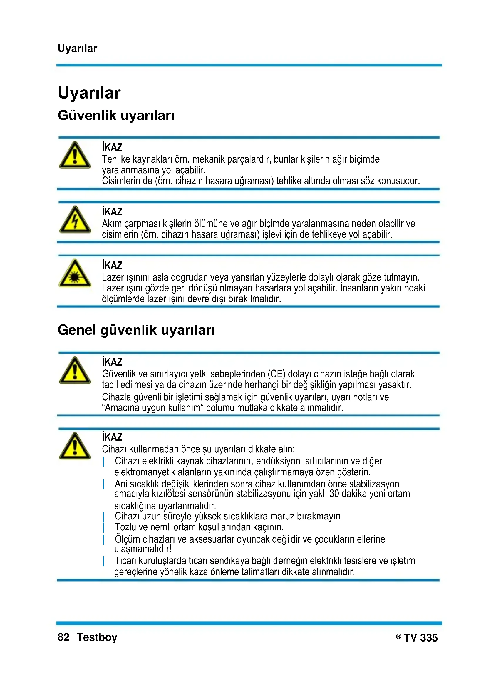İKAZ Cihazı kullanmadan önce şu uyarıları dikkate alın: | Cihazı elektrikli kaynak cihazlarının, endüksiyon ısıtıcılarının ve diğer elektromanyetik alanların yakınında çalıştırmamaya özen gösterin. | Ani sıcaklık değişikliklerinden sonra cihaz kullanımdan önce stabilizasyon amacıyla kızılötesi sensörünün stabilizasyonu için yakl. 30 dakika yeni ortam sıcaklığına uyarlanmalıdır. | Cihazı uzun süreyle yüksek sıcaklıklara maruz bırakmayın. | Tozlu ve nemli ortam koşullarından kaçının. | Ölçüm cihazları ve aksesuarlar oyuncak değildir ve çocukların ellerine ulaşmamalıdır! | Ticari kuruluşlarda ticari sendikaya bağlı derneğin elektrikli tesislere ve işletim gereçlerine yönelik kaza önleme talimatları dikkate alınmalıdır.Uyarılar