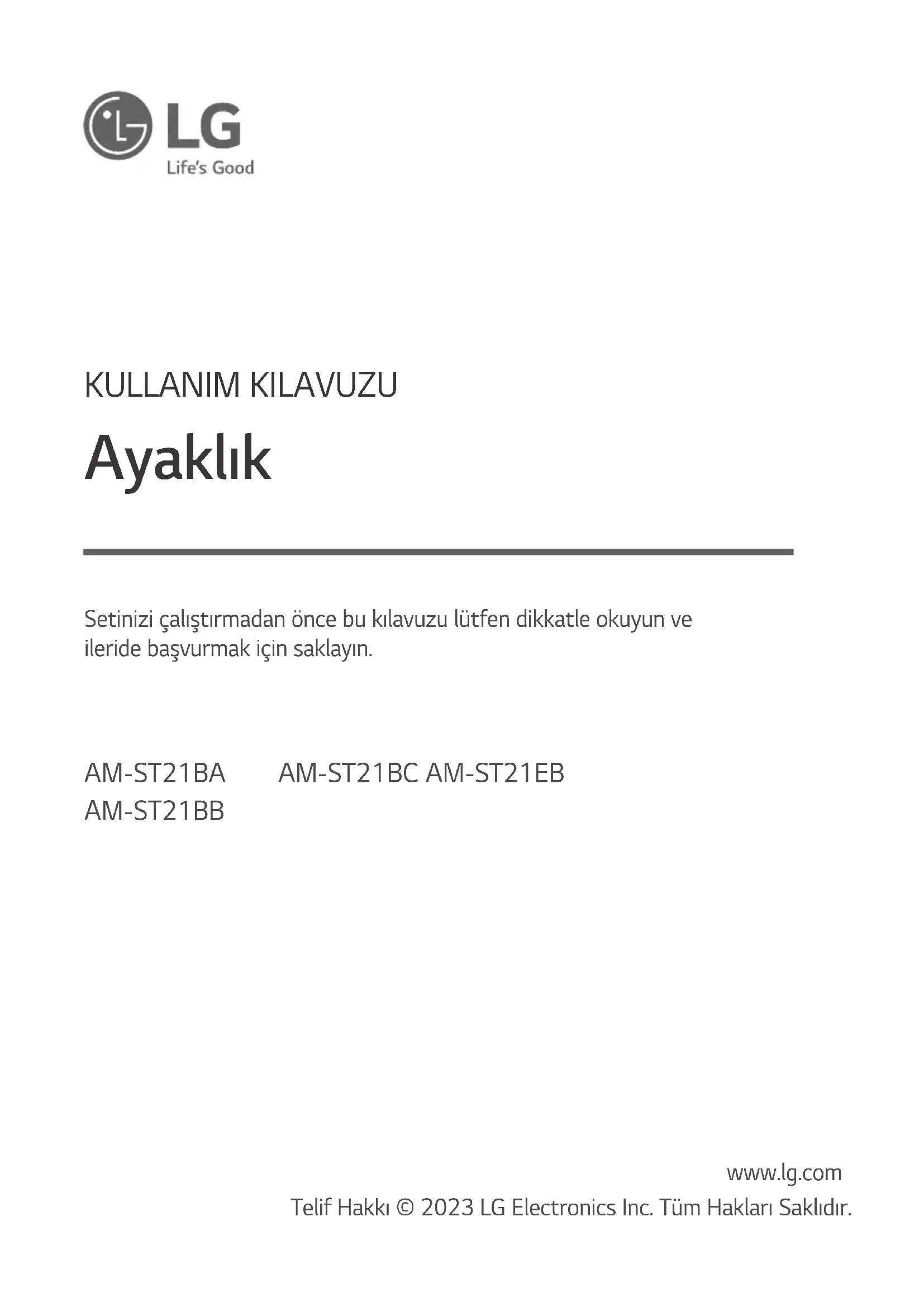 Серійний номерKULLANIM KILAVUZU Ayaklık www.lg.com Telif Hakkı © 2023 LG Electronics Inc. Tüm Hakları Saklıdır. Setinizi çalıştırmadan önce bu kılavuzu lütfen dikkatle okuyun ve ileride başvurmak için saklayın. AM-ST21BA AM-ST21BB AM-ST21BC AM-ST21EB2