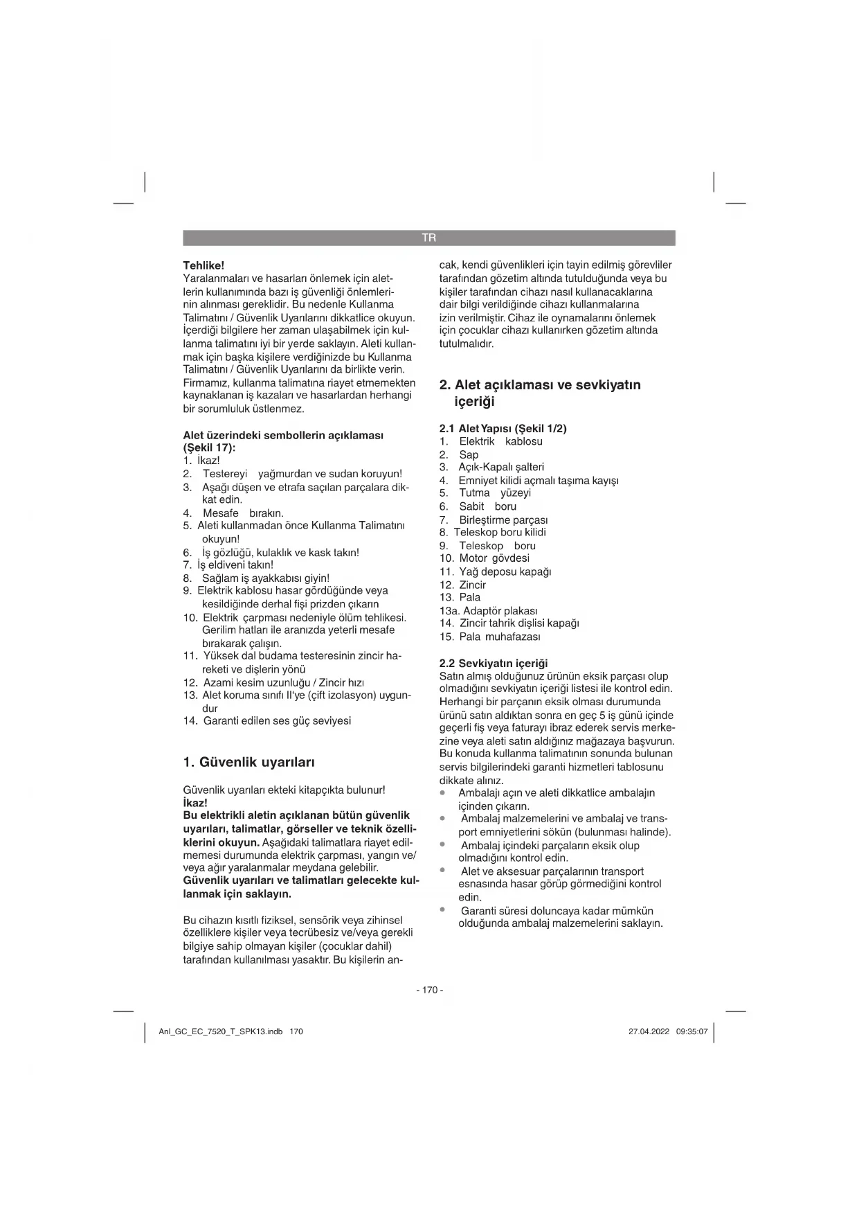 çalışma Hazırlık Güvenli çalışabilmek için her çalışmaya başlamadan önce ve aletin olası hasarlı olması durumunda aşağıdaki noktalaır kontrol edin: Elektrikli yüksek dal budamanın durumu Çalışmaya başlamadan önce yüksek dal budamanın gövdesi, elektrik kablosu, zincir ve palasını kontrol edin. Kesinlikle bariz hasarı olan aleti çalıştırmayın. - İş kazası tehlikesi! Tehlike! Koruma tertibatlarının sökülmesi veya üzerinde değişiklik yapılması yasaktır. - İş kazası tehlikesi! Koruma tertibatları düzgün şekilde çalışmadığında testereyi kullanmayın. İş Anl_GC_EC_7520_T_SPK13.indb 173Anl_GC_EC_7520_T_SPK13.indb 173 27.04.2022 09:35:0727.04.2022 09:35:07TR
