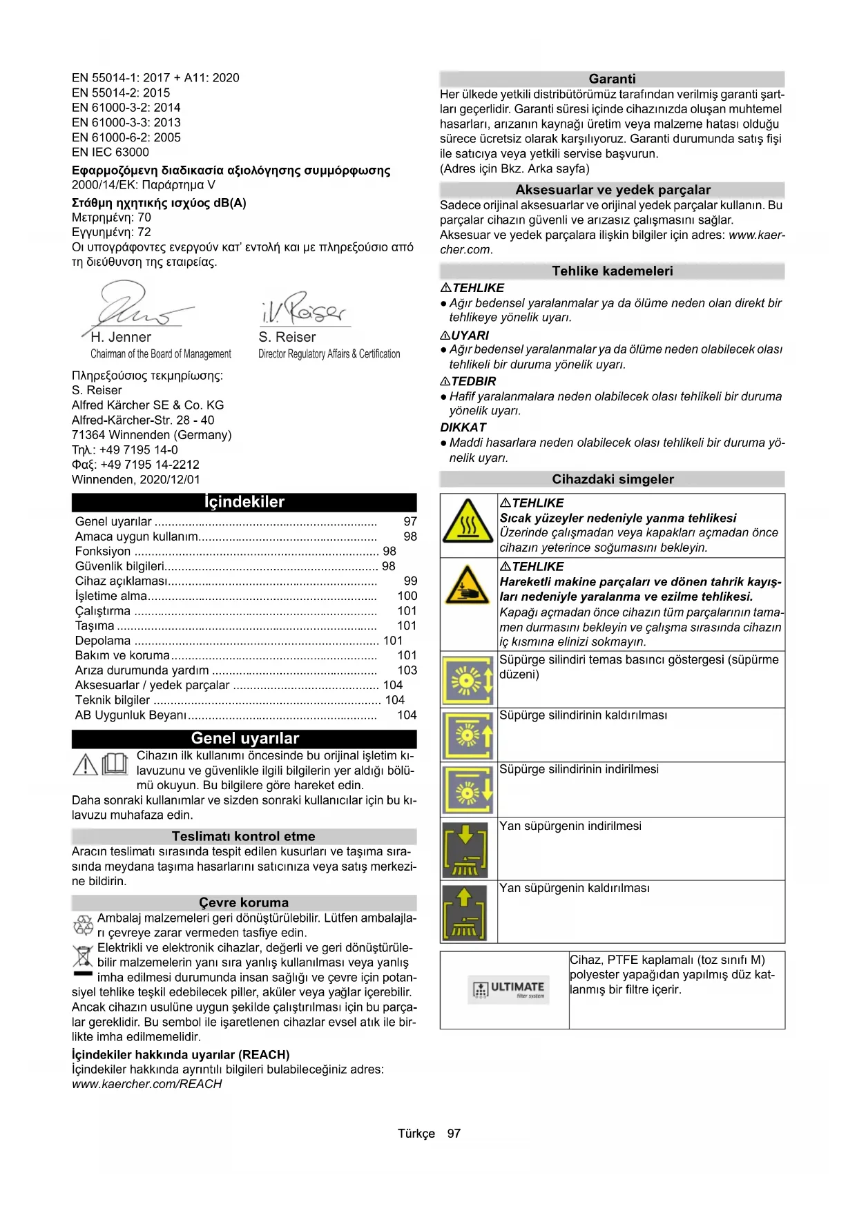 - dB(A) 2Türkçe 97 EN 55014-1: 2017 + A11: 2020 EN 55014-2: 2015 EN 61000-3-2: 2014 EN 61000-3-3: 2013 EN 61000-6-2: 2005 EN IEC 63000 Εφαρμοζόμενη διαδικασία αξιολόγησης συμμόρφωσης 2000/14/EΚ: Παράρτημα V Στάθμη ηχητικής ισχύος dB(A) Μετρημένη: 70 Εγγυημένη: 72 Οι υπογράφοντες ενεργούν κατ’ εντολή και με πληρεξούσιο από τη διεύθυνση της εταιρείας. Πληρεξούσιος τεκμηρίωσης: S. Reiser Alfred Kärcher SE & Co. KG Alfred-Kärcher-Str. 28 - 40 71364 Winnenden (Germany) Τηλ.: +49 7195 14-0 Φαξ: +49 7195 14-2212 Winnenden, 2020/12/01 İçindekiler Genel uyarılar Cihazın ilk kullanımı öncesinde bu orijinal işletim kı- lavuzunu ve güvenlikle ilgili bilgilerin yer aldığı bölü- mü okuyun. Bu bilgilere göre hareket edin. Daha sonraki kullanımlar ve sizden sonraki kullanıcılar için bu kı- lavuzu muhafaza edin. Teslimatı kontrol etme Aracın teslimatı sırasında tespit edilen kusurları ve taşıma sıra- sında meydana taşıma hasarlarını satıcınıza veya satış merkezi- ne bildirin. Çevre koruma Ambalaj malzemeleri geri dönüştürülebilir. Lütfen ambalajla- rı çevreye zarar vermeden tasfiye edin. Elektrikli ve elektronik cihazlar, değerli ve geri dönüştürüle- bilir malzemelerin yanı sıra yanlış kullanılması veya yanlış imha edilmesi durumunda insan sağlığı ve çevre için potan- siyel tehlike teşkil edebilecek piller, aküler veya yağlar içerebilir. Ancak cihazın usulüne uygun şekilde çalıştırılması için bu parça- lar gereklidir. Bu sembol ile işaretlenen cihazlar evsel atık ile bir- likte imha edilmemelidir. İçindekiler hakkında uyarılar (REACH) İçindekiler hakkında ayrıntılı bilgileri bulabileceğiniz adres: www.kaercher.com/REACH Garanti Her ülkede yetkili distribütörümüz tarafından verilmiş garanti şart- ları geçerlidir. Garanti süresi içinde cihazınızda oluşan muhtemel hasarları, arızanın kaynağı üretim veya malzeme hatası olduğu sürece ücretsiz olarak karşılıyoruz. Garanti durumunda satış fişi ile satıcıya veya yetkili servise başvurun. (Adres için Bkz. Arka sayfa) Aksesuarlar ve yedek parçalar Sadece orijinal aksesuarlar ve orijinal yedek parçalar kullanın. Bu parçalar cihazın güvenli ve arızasız çalışmasını sağlar. Aksesuar ve yedek parçalara ilişkin bilgiler için adres: www.kaer- cher.com. Tehlike kademeleri TEHLIKE ● Ağır bedensel yaralanmalar ya da ölüme neden olan direkt bir tehlikeye yönelik uyarı. 몇 UYARI ● Ağır bedensel yaralanmalar ya da ölüme neden olabilecek olası tehlikeli bir duruma yönelik uyarı. 몇 TEDBIR ● Hafif yaralanmalara neden olabilecek olası tehlikeli bir duruma yönelik uyarı. DIKKAT ● Maddi hasarlara neden olabilecek olası tehlikeli bir duruma yö- nelik uyarı. Cihazdaki simgeler Genel uyarılar p. 97