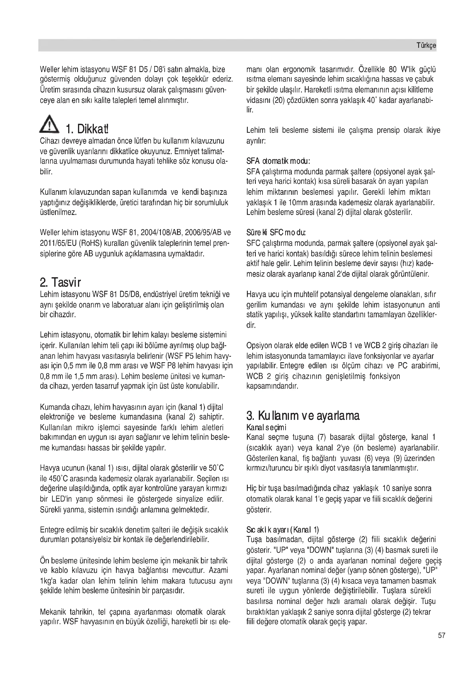 Cihaz∂ devreye almadan önce lütfen bu kullan∂m k∂lavuzunu ve güvenlik uyar∂lar∂n∂ dikkatlice okuyunuz. Emniyet talimat- lar∂na uyulmamas∂ durumunda hayati tehlike söz konusu ola- bilir. Kullan∂m k∂lavuzundan sapan kullan∂mda ve kendi baμ∂n∂za yapt∂π∂n∂z deπiμikliklerde, üretici taraf∂ndan hiç bir sorumluluk üstlenilmez. Weller lehim istasyonu WSF 81, 2004/108/AB, 2006/95/AB ve 2011/65/EU (RoHS) kurallar∂ güvenlik taleplerinin temel pren- siplerine göre AB uygunluk aç∂klamas∂na uymaktad∂r.