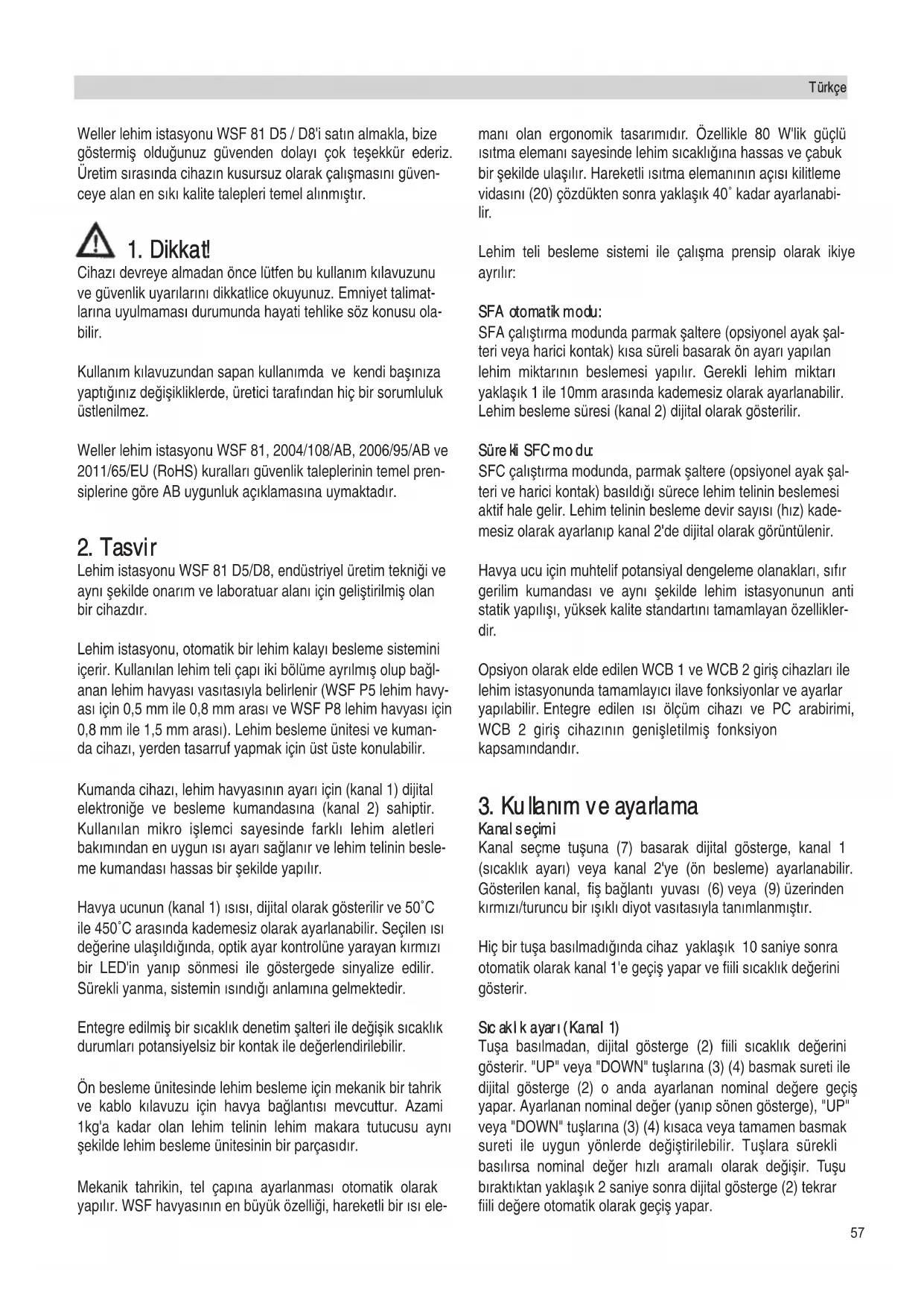 Weller lehim istasyonu WSF 81 D5 / D8'i sat∂n almakla, bize göstermiμ olduπunuz güvenden dolay∂ çok teμekkür ederiz. Üretim s∂ras∂nda cihaz∂n kusursuz olarak çal∂μmas∂n∂ güven- ceye alan en s∂k∂ kalite talepleri temel al∂nm∂μt∂r.