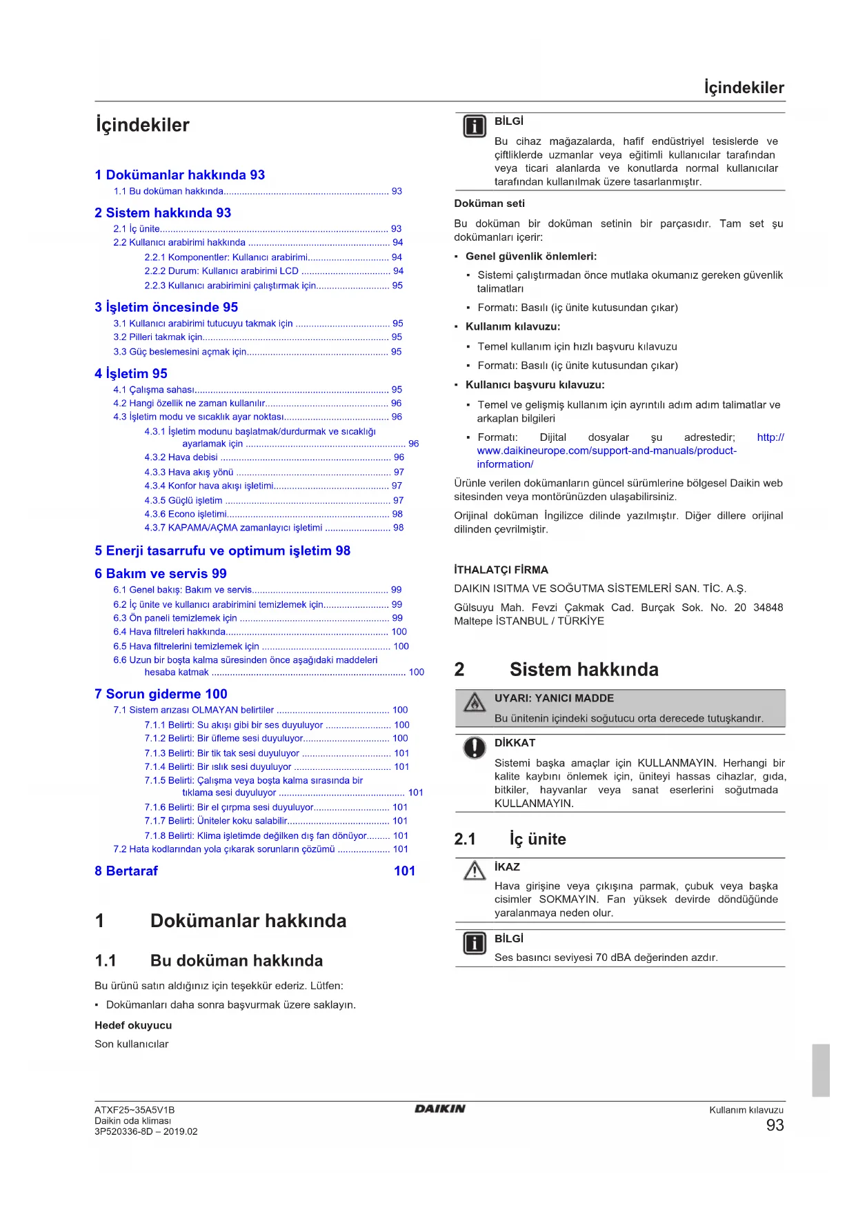 Daikin oda kliması 3P520336-8D – 2019.02 6 Bakım ve servis Ürünlerimizin kullanım ömrü on (10) yıldır. Tüm yetkili servis istasyonlarına ve yedek parça malzemelerinin temin edileceği yerlere ilişkin güncel iletişim bilgileri internet sitemizde yer almaktadır. Tüm yetkili servis istasyonu bilgilerimiz, Bakanlık tarafından oluşturulan Servis Bilgi Sisteminde yer almaktadır.