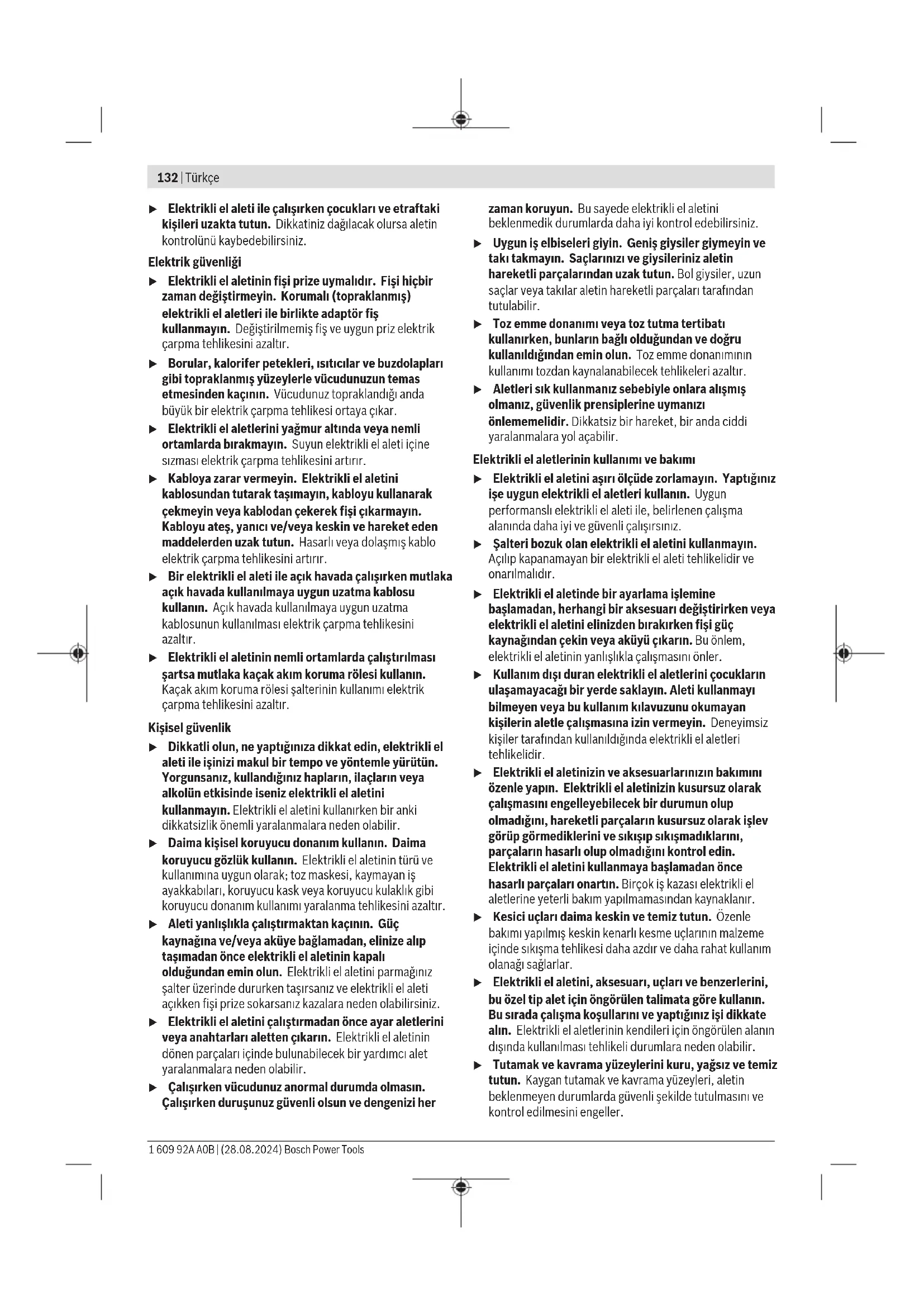 Μην ρίχνετε τα ηλεκτρικά εργαλεία στα απορρίμ- ματα του σπιτιού σας! Μόνο για χώρες τηςΕΕ: Τα άχρηστα ηλεκτρικά εργαλεία πρέπει να αποσύρονται ξεχω- ριστά. Χρησιμοποιείτε τα προβλεπόμενα συστήματα συλλογής. Εάν οι παλαιές ηλεκτρικές και ηλεκτρονικές συσκευές απορρί- πτονται με ακατάλληλο τρόπο, μπορεί να έχουν επιβλαβείς επι- πτώσεις στο περιβάλλον και την ανθρώπινη υγεία λόγω της πι- θανής παρουσίας επικίνδυνων ουσιών. Türkçe Güvenlik talimatı Elektrikli El Aletleri İçin Genel Güvenlik Uyarıları UYARI Bu elektrikli el aletiyle birlikte gelen tüm güvenlik uyarılarını, talimatları, resim ve açıklamaları okuyun. Aşağıda bulunan talimatlara uyulmaması halinde elektrik çarpmalarına, yangınlara ve/veya ağır yaralanmalara neden olabilir. Bütün uyarıları ve talimat hükümlerini ileride kullanmak üzere saklayın. Uyarı ve talimat hükümlerinde kullanılan "elektrikli el aleti" terimi, akım şebekesine bağlı (elektrikli) aletlerle akü ile çalışan aletleri (akülü) kapsamaktadır. Çalışma yeri güvenliği u Çalıştığınız yeri temiz tutun ve iyi aydınlatın. Dağınık veya karanlık alanlar kazalara davetiye çıkarır. u Yakınında patlayıcı maddeler, yanıcı sıvı, gaz veya tozların bulunduğu yerlerde elektrikli el aleti ile çalışmayın. Elektrikli el aletleri, toz veya buharların tutuşmasına neden olabilecek kıvılcımlar çıkarırlar. Bosch Power Tools 1 609 92A A0B | (28.08.2024)132 | Türkçe u Elektrikli el aleti ile çalışırken çocukları ve etraftaki kişileri uzakta tutun. Dikkatiniz dağılacak olursa aletin kontrolünü kaybedebilirsiniz. Elektrik güvenliği u Elektrikli el aletinin fişi prize uymalıdır. Fişi hiçbir zaman değiştirmeyin. Korumalı (topraklanmış) elektrikli el aletleri ile birlikte adaptör fiş kullanmayın. Değiştirilmemiş fiş ve uygun priz elektrik çarpma tehlikesini azaltır. u Borular, kalorifer petekleri, ısıtıcılar ve buzdolapları gibi topraklanmış yüzeylerle vücudunuzun temas etmesinden kaçının. Vücudunuz topraklandığı anda büyük bir elektrik çarpma tehlikesi ortaya çıkar. u Elektrikli el aletlerini yağmur altında veya nemli ortamlarda bırakmayın. Suyun elektrikli el aleti içine sızması elektrik çarpma tehlikesini artırır. u Kabloya zarar vermeyin. Elektrikli el aletini kablosundan tutarak taşımayın, kabloyu kullanarak çekmeyin veya kablodan çekerek fişi çıkarmayın. Kabloyu ateş, yanıcı ve/veya keskin ve hareket eden maddelerden uzak tutun. Hasarlı veya dolaşmış kablo elektrik çarpma tehlikesini artırır. u Bir elektrikli el aleti ile açık havada çalışırken mutlaka açık havada kullanılmaya uygun uzatma kablosu kullanın. Açık havada kullanılmaya uygun uzatma kablosunun kullanılması elektrik çarpma tehlikesini azaltır. u Elektrikli el aletinin nemli ortamlarda çalıştırılması şartsa mutlaka kaçak akım koruma rölesi kullanın. Kaçak akım koruma rölesi şalterinin kullanımı elektrik çarpma tehlikesini azaltır. Kişisel güvenlik u Dikkatli olun, ne yaptığınıza dikkat edin, elektrikli el aleti ile işinizi makul bir tempo ve yöntemle yürütün. Yorgunsanız, kullandığınız hapların, ilaçların veya alkolün etkisinde iseniz elektrikli el aletini kullanmayın. Elektrikli el aletini kullanırken bir anki dikkatsizlik önemli yaralanmalara neden olabilir. u Daima kişisel koruyucu donanım kullanın. Daima koruyucu gözlük kullanın. Elektrikli el aletinin türü ve kullanımına uygun olarak; toz maskesi, kaymayan iş ayakkabıları, koruyucu kask veya koruyucu kulaklık gibi koruyucu donanım kullanımı yaralanma tehlikesini azaltır. u Aleti yanlışlıkla çalıştırmaktan kaçının. Güç kaynağına ve/veya aküye bağlamadan, elinize alıp taşımadan önce elektrikli el aletinin kapalı olduğundan emin olun. Elektrikli el aletini parmağınız şalter üzerinde dururken taşırsanız ve elektrikli el aleti açıkken fişi prize sokarsanız kazalara neden olabilirsiniz. u Elektrikli el aletini çalıştırmadan önce ayar aletlerini veya anahtarları aletten çıkarın. Elektrikli el aletinin dönen parçaları içinde bulunabilecek bir yardımcı alet yaralanmalara neden olabilir. u Çalışırken vücudunuz anormal durumda olmasın. Çalışırken duruşunuz güvenli olsun ve dengenizi her zaman koruyun. Bu sayede elektrikli el aletini beklenmedik durumlarda daha iyi kontrol edebilirsiniz. u Uygun iş elbiseleri giyin. Geniş giysiler giymeyin ve takı takmayın. Saçlarınızı ve giysileriniz aletin hareketli parçalarından uzak tutun. Bol giysiler, uzun saçlar veya takılar aletin hareketli parçaları tarafından tutulabilir. u Toz emme donanımı veya toz tutma tertibatı kullanırken, bunların bağlı olduğundan ve doğru kullanıldığından emin olun. Toz emme donanımının kullanımı tozdan kaynalanabilecek tehlikeleri azaltır. u Aletleri sık kullanmanız sebebiyle onlara alışmış olmanız, güvenlik prensiplerine uymanızı önlememelidir. Dikkatsiz bir hareket, bir anda ciddi yaralanmalara yol açabilir. Elektrikli el aletlerinin kullanımı ve bakımı u Elektrikli el aletini aşırı ölçüde zorlamayın. Yaptığınız işe uygun elektrikli el aletleri kullanın. Uygun performanslı elektrikli el aleti ile, belirlenen çalışma alanında daha iyi ve güvenli çalışırsınız. u Şalteri bozuk olan elektrikli el aletini kullanmayın. Açılıp kapanamayan bir elektrikli el aleti tehlikelidir ve onarılmalıdır. u Elektrikli el aletinde bir ayarlama işlemine başlamadan, herhangi bir aksesuarı değiştiri