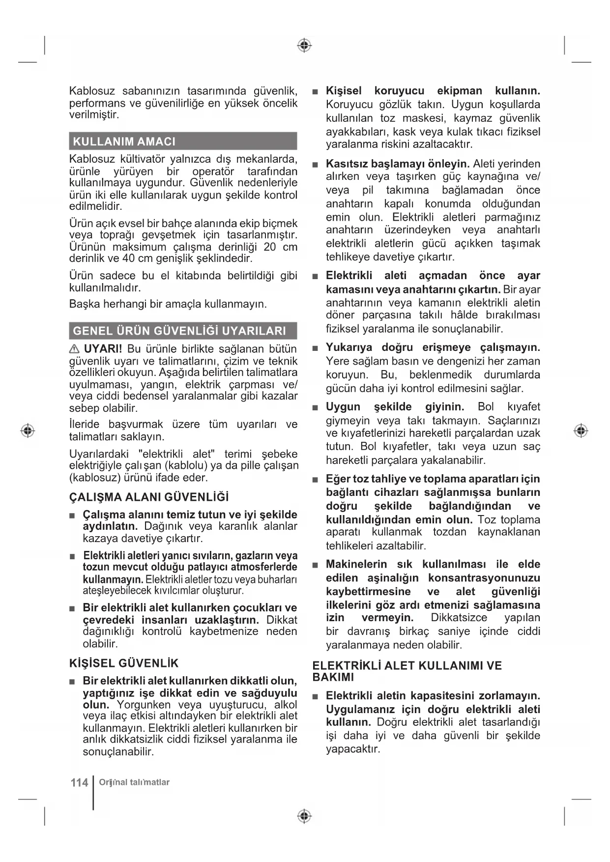 ■ Sadece üretc tarafından belrtlen şarj chazı le şarj edn. Tek br pl takımı tpne uygun br şarj chazı başka br pl takımı le brlkte kullanıldığında yangın rsk oluşturablr. ■ Elektrkl aletler sadece özel olarak belrtlmş pl takımları le brlkte kullanın. Başka br pl takımı kullanmak yaralanma ve yangın rsk oluşturablr. ■ Pl takımı kullanılmadığı zaman ataş, bozuk para, anahtar, çv, vda ve dğer metal nesneler gb br termnalden dğerne bağlantı oluşturablecek dğer metal nesnelerden uzak tutun. Pl termnallernn brlkte kısa devre yapması yanığa veya yangına neden olablr. ■ Kötü koşullarda plden sıvı boşalablr; temas etmekten kaçının. Eğer kazara temas edersenz temas eden yer suyla yıkayın. Eğer sıvı gözlernze temas ederse ek olarak tıbb yardım alın. Plden boşalan sıvı tahrşe veya yanıklara neden olablr. ■ Hasar görmüş ya da değştrlmş pl paket ya da alet kullanmayın. Hasar görmüş ya da değştrlmş pller yangın, patlama ya da yaralanma rskne yol açablecek beklenmeyen davranış sergleyeblr. ■ Pl paket ya da alet ateş ya da aşırı sıcağa maruz bırakmayın. Ateş ya da 130°C üzernde ısıya maruz kalmak patlamaya neden olablr. ■ Şarj şlemne lşkn tüm talmatlara uyun ve pl paket ya da alet talmatlarda belrtlen sıcaklık aralığı dışında şarj etmeyn. Belrtlen sıcaklık aralığı dışında şarj edldğnde pl zarar göreblr ve yangın rsk artar. SERVİS ■ Ürününüzün onarımını yalnızca orjnal yedek parça kullanan ntelkl br tamrcye yaptırın. Bu ürünün güvenlğnn korunmasını sağlayacaktır. ■ Hasarlı pl takımlarına asla bakım uygulamayın. Pl takımlarının bakımı üretc ya da yetkl hzmet sağlayıcılar tarafından yapılmalıdır. KÜLTİVATÖR GÜVENLİK UYARILARI ■ Ürünü yamaçlarda yukarı veya aşağıya doğru değl, yamaç boyunca kullanın. Eğmler üzernde yön değştrrken çok dkkatl olun.116 Orı