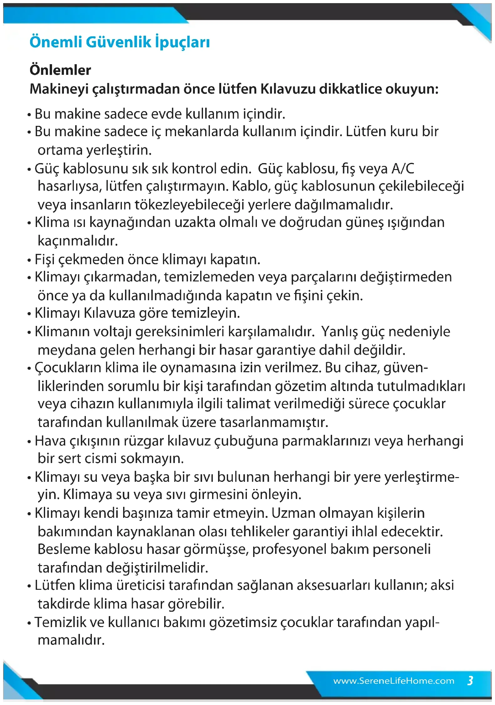 - Ünitede soğutucu akışkan sistemini tehlikeye atabilecek bir hasar mey- dana gelmişse ürünü kullanmayın ve tavsiye için satıcıyla iletişime geçin.. www.SereneLifeHome.com