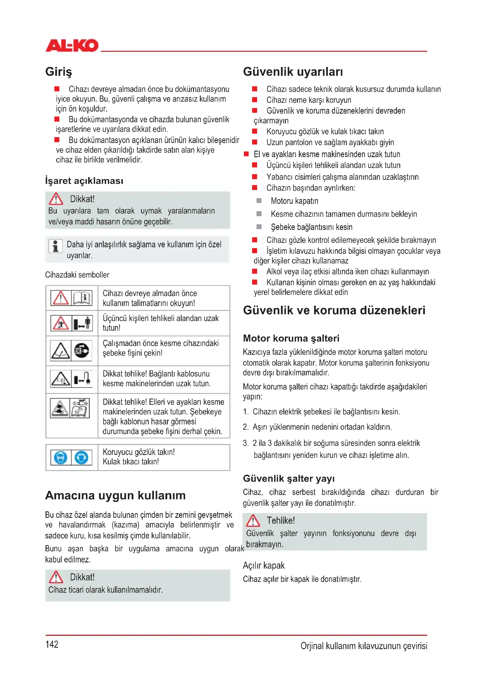 Производител 2006/42/EG 2014/30/EU 2000/14/EG 2011/65/EU 2014/35/EU Хармонизирани норми EN 60335-1:2002+A1+A11+A12+A2+A13 EN 13684+A3 EN 60335-2-92 Ниво на јачината на звукот Ниво на јачината на звукот EN ISO 3744 98 / 99 dB(A) Проценка на усогласеност 2000/14/EG ПрилогV Kötz,01.07.2016WolfgangHergeth,ManagingDirector142 Orjinal kullanım kılavuzunun çevirisi Giriş Cihazıdevreyealmadanöncebudokümantasyonu iyiceokuyun.Bu,güvenliçalışmavearızasızkullanım içinönkoşuldur. Budokümantasyondavecihazdabulunangüvenlik işaretlerineveuyarılaradikkatedin. Budokümantasyonaçıklananürününkalıcıbileşenidir vecihazeldençıkarıldığıtakdirdesatınalankişiye cihazilebirlikteverilmelidir. İşaret açıklaması Dikkat! Bu uyarılara tam olarak uymak yaralanmaların ve/veyamaddihasarınönünegeçebilir. Dahaiyianlaşılırlıksağlamavekullanımiçinözel uyarılar. Cihazdakisemboller Cihazıdevreyealmadanönce kullanımtalimatlarınıokuyun! Üçüncükişileritehlikelialandanuzak tutun! Çalışmadanöncekesmecihazındaki şebekeşiniçekin! Dikkattehlike!Bağlantıkablosunu kesmemakinelerindenuzaktutun. Dikkattehlike!Elleriveayaklarıkesme makinelerindenuzaktutun.Şebekeye bağlıkablonunhasargörmesi durumundaşebekeşiniderhalçekin. Koruyucugözlüktakın! Kulaktıkacıtakın! Amacına uygun kullanım Bucihazözelalandabulunançimdenbirzeminigevşetmek ve havalandırmak (kazıma) amacıyla belirlenmiştir ve sadecekuru,kısakesilmişçimdekullanılabilir. Bunu aşan başka bir uygulama amacına uygun olarak kabuledilmez. Dikkat! Cihazticariolarakkullanılmamalıdır. Güvenlik uyarıları Cihazısadeceteknikolarakkusursuzdurumdakullanın Cihazınemekarşıkoruyun Güvenlikvekorumadüzeneklerinidevreden çıkarmayın Koruyucugözlükvekulaktıkacıtakın Uzunpantolonvesağlamayakkabıgiyin Elveayaklarıkesmemakinesindenuzak tutun Üçüncükişileritehlikelialandanuzaktutun Yabancıcisimleriçalışmaalanındanuzaklaştırın Cihazınbaşındanayrılırken: Motorukapatın Kesmecihazınıntamamendurmasınıbekleyin Şebekebağlantısınıkesin Cihazıgözlekontroledilemeyecekşekildebırakmayın İşletimkılavuzuhakkındabilgisiolmayançocuklarveya diğerkişilercihazıkullanamaz Alkolveyailaçetkisialtındaikencihazıkullanmayın Kullanankişininolmasıgerekenenazyaşhakkındaki yerelbelirlemeleredikkatedin Güvenlik ve koruma düzenekleri Motor koruma şalteri Kazıcıyafazlayüklenildiğindemotorkorumaşalterimotoru otomatikolarakkapatır.Motorkorumaşalterininfonksiyonu devredışıbırakılmamalıdır. Motorkorumaşaltericihazıkapattığıtakdirdeaşağıdakileri yapın: