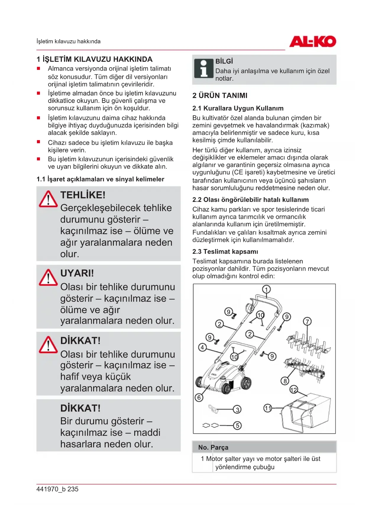 No. Parça 1 Üst yönlendirme çubuğu, katlanabilir 2 Alt yönlendirme çubuğu, döndürülebilir 3 Motor şalter yayı 4 Güvenlik tuşu ve entegre şebeke fişi ile motor şalteri 5 Kablo çekme yükünü azaltma 6 Yönlendirme çubuğunu katlamak için hızlı sıkma tertibatı441970_b 237 Güvenlik notları No. Parça 7 Tutamak yüksekliği ayarı için döndürme ve kilitleme mafsalı 8 Cihazın taşıma kolu 9 Çalışma derinliği için ayar çarkı 10 5 kademeli çalışma derinliği göstergesi 11 Kazıma ve havalandırma makaralı kesme tertibatı 12 Çarpma klapesi 13 Çim toplama haznesi 14 Çim toplama haznesinin taşıma kolu