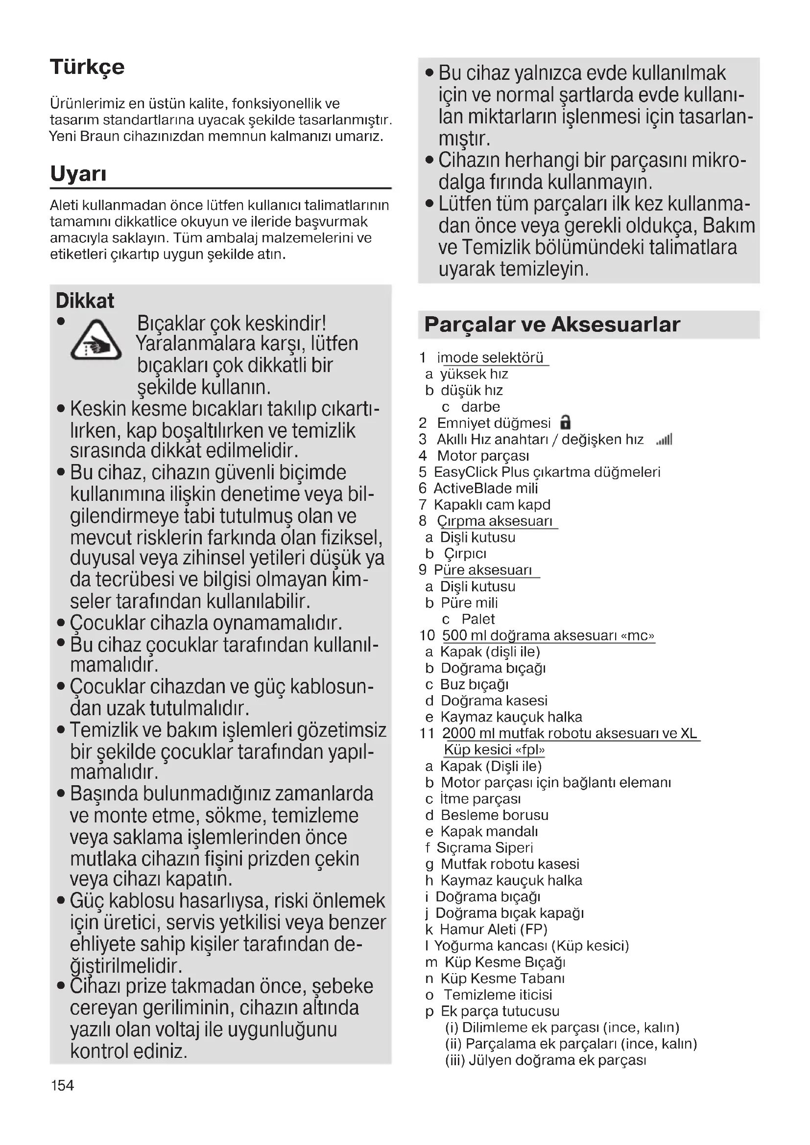 - Bıçaklar çok keskindir. Parçaları sadece plastik kısımlarından tutun.