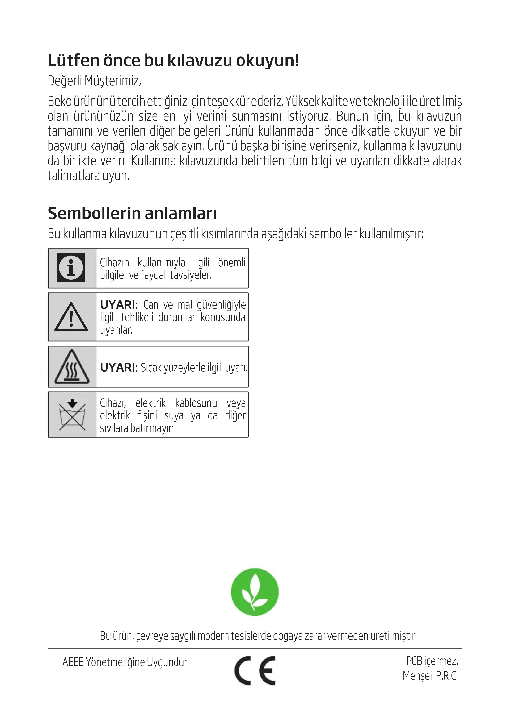 - Pendant la manipulation et le transport, portez toujours l’appareil dans son emballage d’origine. L’emballage de l’appareil le protège des dommages physiques. • Ne placez pas de charge lourde sur l’appareil ou sur l’emballage. Cela pourrait l’endommager. • Toute chute de l’appareil peut le rendre non opérationnel ou l’endommager de façon permanente.Lütfen önce bu kılavuzu okuyun! Değerl Müştermz, Beko ürününü terch ettğnz çn teşekkür ederz. Yüksek kalte ve teknoloj le üretlmş olan ürününüzün sze en y verm sunmasını styoruz. Bunun çn, bu kılavuzun tamamını ve verlen dğer belgeler ürünü kullanmadan önce dkkatle okuyun ve br başvuru kaynağı olarak saklayın. Ürünü başka brsne verrsenz, kullanma kılavuzunu da brlkte vern. Kullanma kılavuzunda belrtlen tüm blg ve uyarıları dkkate alarak talmatlara uyun. Sembollerin anlamları Bu kullanma kılavuzunun çeştl kısımlarında aşağıdak semboller kullanılmıştır: