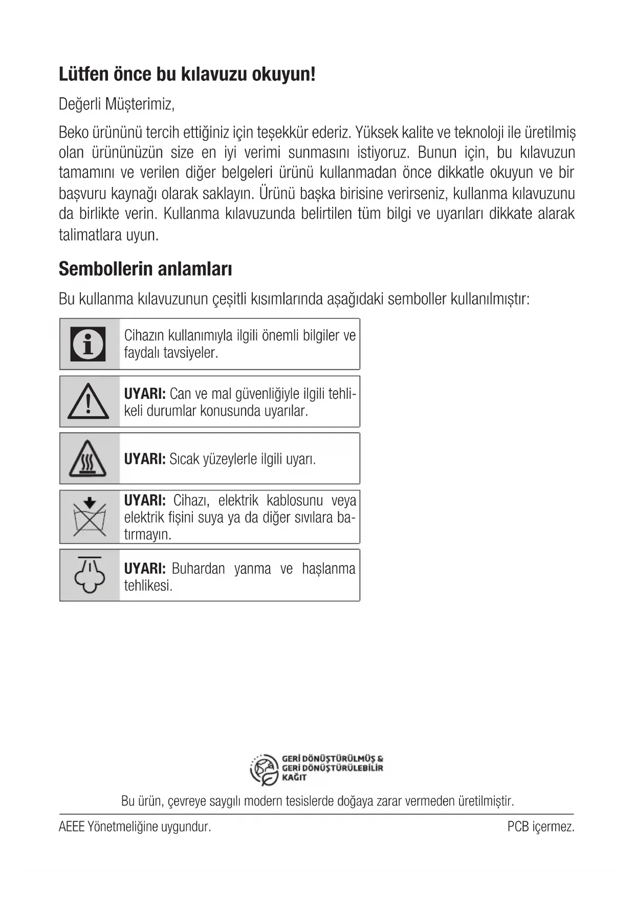 UYARI: Can ve mal güvenliğiyle ilgili tehli- keli durumlar konusunda uyarılar. UYARI: Sıcak yüzeylerle ilgili uyarı. UYARI: Cihazı, elektrik kablosunu veya elektrik fişini suya ya da diğer sıvılara ba- tırmayın. UYARI: Buhardan yanma ve haşlanma tehlikesi. AEEE Yönetmeliğine uygundur.PCB içermez.Bu ürün, çevreye saygılı modern tesislerde doğaya zarar vermeden üretilmiştir.108 / TR Buharlı Ütü / Kullanma Kılavuzu 1 Önemli güvenlik ve çevre talimatları Bu bölümde, yaralanma ya da maddi hasar tehlikelerini önleme- ye yardımcı olacak güvenlik tali- matları yer almaktadır. Bu talimatlara uyulmaması halin- de her türlü garanti geçersiz hale gelir.