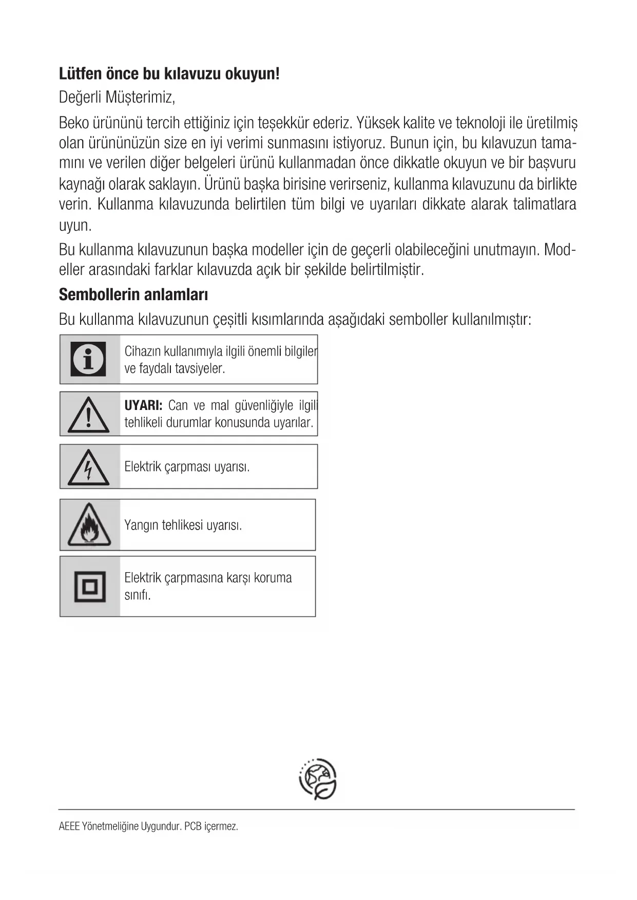 Για προϊόντα με φίλτρα άνθρακα, το φίλτρο θα πρέπει κανονικά να αλλάζεται κάθε 3 μήνες.Lütfen önce bu kılavuzu okuyun! Değerli Müşterimiz, Beko ürününü tercih ettiğiniz için teşekkür ederiz. Yüksek kalite ve teknoloji ile üretilmiş olan ürününüzün size en iyi verimi sunmasını istiyoruz. Bunun için, bu kılavuzun tama- mını ve verilen diğer belgeleri ürünü kullanmadan önce dikkatle okuyun ve bir başvuru kaynağı olarak saklayın. Ürünü başka birisine verirseniz, kullanma kılavuzunu da birlikte verin. Kullanma kılavuzunda belirtilen tüm bilgi ve uyarıları dikkate alarak talimatlara uyun. Bu kullanma kılavuzunun başka modeller için de geçerli olabileceğini unutmayın. Mod- eller arasındaki farklar kılavuzda açık bir şekilde belirtilmiştir. Sembollerin anlamları Bu kullanma kılavuzunun çeşitli kısımlarında aşağıdaki semboller kullanılmıştır: