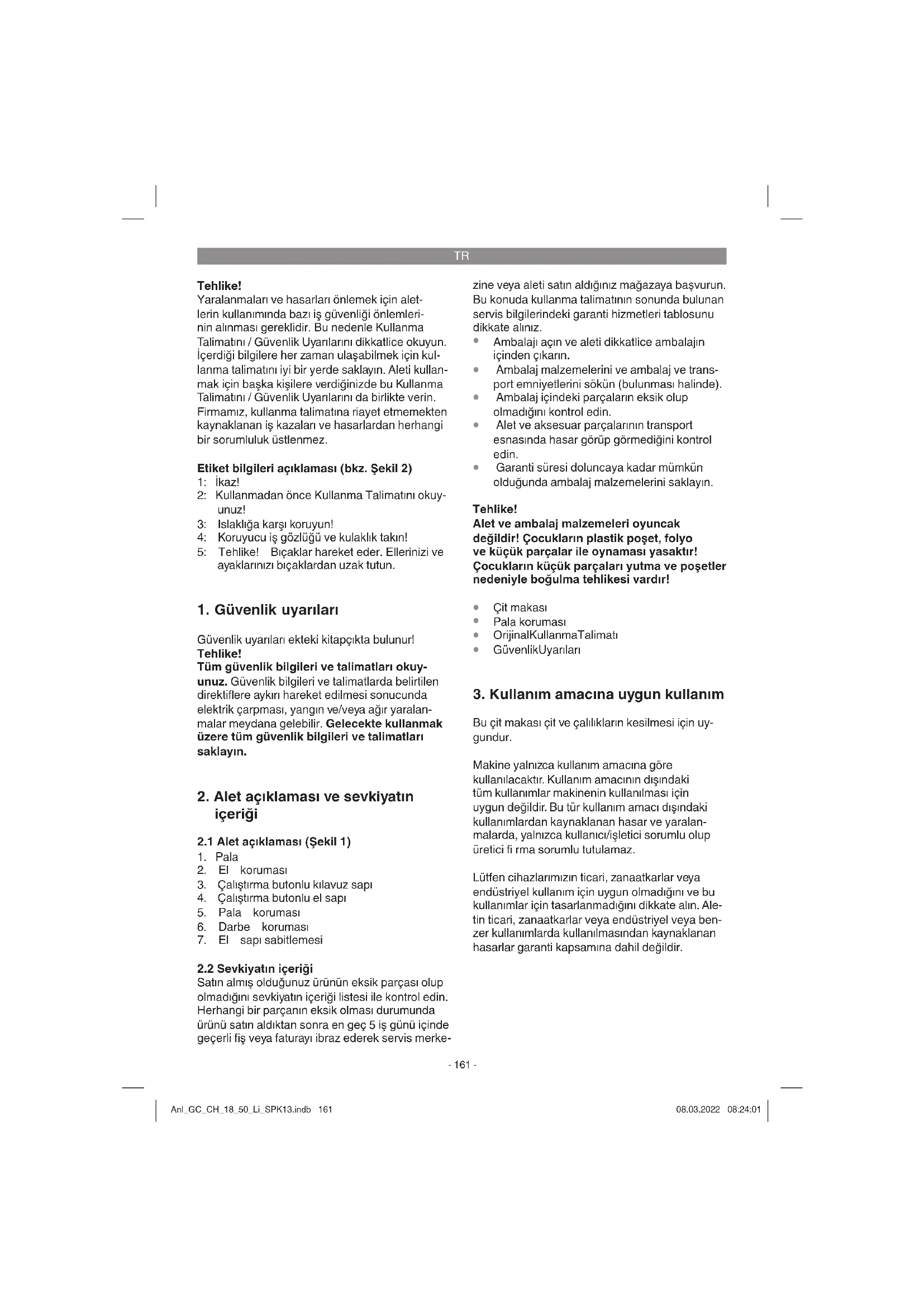 Bu çit makası çit ve çalılıkların kesilmesi için uy- gundur. Makine yalnızca kullanı m amacına göre kullanılacaktır. Kullanım amacının dışındaki tüm kullanımlar makinenin kullanılması için uygun değildir. Bu tür kullanım amacı dışındaki kullanımlardan kaynaklanan hasar ve yaralan- malarda, yalnızca kullanıcı/işletici sorumlu olup üretici fi rma sorumlu tutulamaz. Lütfen cihazlarımızın ticari, zanaatkarlar veya endüstriyel kullanım için uygun olmadığını ve bu kullanımlar için tasarlanmadığını dikkate alın. Ale- tin ticari, zanaatkarlar veya endüstriyel veya ben- zer kullanımlarda kullanılmasından kaynaklanan hasarlar garanti kapsamına dahil değildir. Anl_GC_CH_18_50_Li_SPK13.indb 161Anl_GC_CH_18_50_Li_SPK13.indb 161 08.03.2022 08:24:0108.03.2022 08:24:01TR