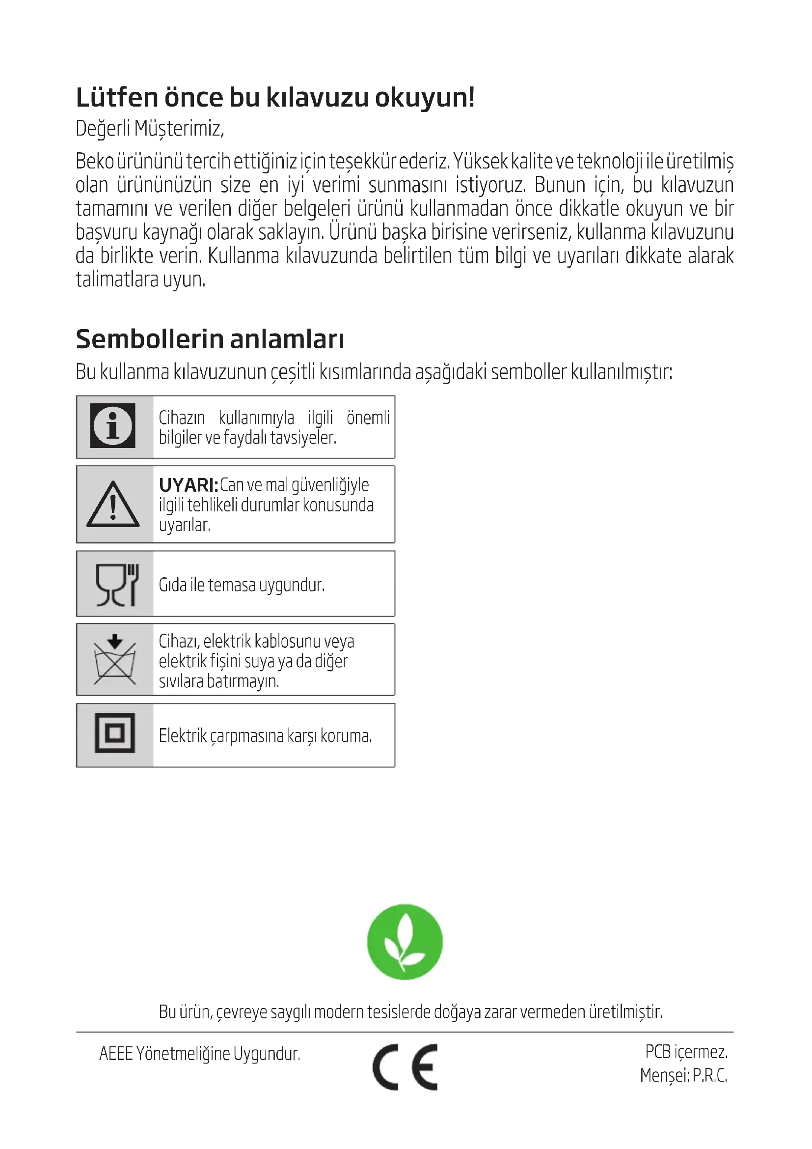 - Pendant la manipulation et le transport, portez toujours l’appareil dans son emballage d’origine. L’emballage de l’appareil le protège des dommages physiques. • Ne placez pas de charge lourde sur l’appareil ou sur l’emballage. Cela pourrait l’endommager. • Toute chute de l’appareil peut le rendre non opérationnel ou l’endommager de façon permanente.Lütfen önce bu kılavuzu okuyun! Değerl Müştermz, Beko ürününü terch ettğnz çn teşekkür ederz. Yüksek kalte ve teknoloj le üretlmş olan ürününüzün sze en y verm sunmasını styoruz. Bunun çn, bu kılavuzun tamamını ve verlen dğer belgeler ürünü kullanmadan önce dkkatle okuyun ve br başvuru kaynağı olarak saklayın. Ürünü başka brsne verrsenz, kullanma kılavuzunu da brlkte vern. Kullanma kılavuzunda belrtlen tüm blg ve uyarıları dkkate alarak talmatlara uyun. Sembollerin anlamları Bu kullanma kılavuzunun çeştl kısımlarında aşağıdak semboller kullanılmıştır: