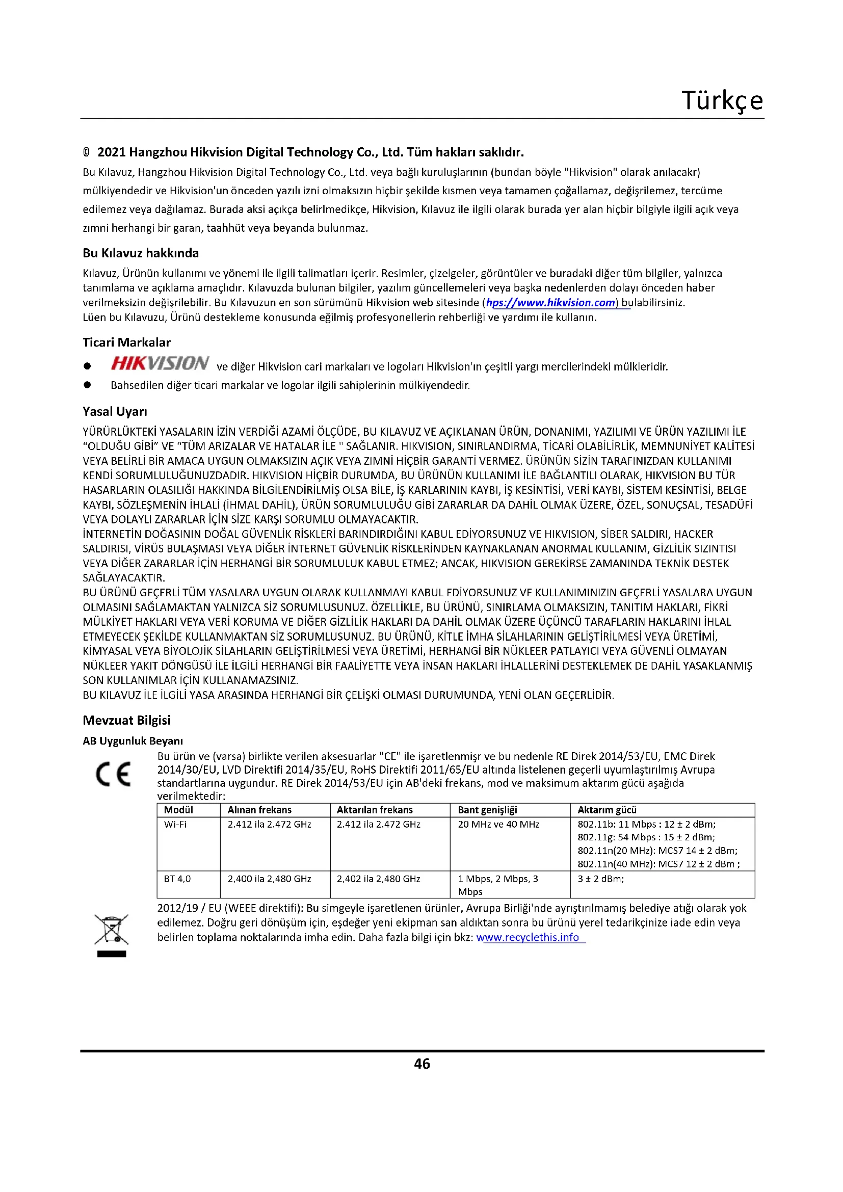 © 2021 Hangzhou Hikvision Digital Technology Co., Ltd. Tüm hakları saklıdır. Bu Kılavuz, Hangzhou Hikvision Digital Technology Co., Ltd. veya bağlı kuruluşlarının (bundan böyle "Hikvision" olarak anılacaktır) mülkiyetindedir ve Hikvision'un önceden yazılı izni olmaksızın hiçbir şekilde kısmen veya tamamen çoğaltılamaz, değiştirilemez, tercüme edilemez veya dağıtılamaz. Burada aksi açıkça belirtilmedikçe, Hikvision, Kılavuz ile ilgili olarak burada yer alan hiçbir bilgiyle ilgili açık veya zımni herhangi bir garanti, taahhüt veya beyanda bulunmaz. Bu Kılavuz hakkında Kılavuz, Ürünün kullanımı ve yönetimi ile ilgili talimatları içerir. Resimler, çizelgeler, görüntüler ve buradaki diğer tüm bilgiler, yalnızca tanımlama ve açıklama amaçlıdır. Kılavuzda bulunan bilgiler, yazılım güncellemeleri veya başka nedenlerden dolayı önceden haber verilmeksizin değiştirilebilir. Bu Kılavuzun en son sürümünü Hikvision web sitesinde (https://www.hikvision.com) bulabilirsiniz. Lütfen bu Kılavuzu, Ürünü destekleme konusunda eğitilmiş profesyonellerin rehberliği ve yardımı ile kullanın. Ticari Markalar ve diğer Hikvision ticari markaları ve logoları Hikvision'ın çeşitli yargı mercilerindeki mülkleridir. Bahsedilen diğer ticari markalar ve logolar ilgili sahiplerinin mülkiyetindedir. Yasal Uyarı YÜRÜRLÜKTEKİ YASALARIN İZİN VERDİĞİ AZAMİ ÖLÇÜDE, BU KILAVUZ VE AÇIKLANAN ÜRÜN, DONANIMI, YAZILIMI VE ÜRÜN YAZILIMI İLE “OLDUĞU GİBİ” VE “TÜM ARIZALAR VE HATALAR İLE " SAĞLANIR. HIKVISION, SINIRLANDIRMA, TİCARİ OLABİLİRLİK, MEMNUNİYET KALİTESİ VEYA BELİRLİ BİR AMACA UYGUN OLMAKSIZIN AÇIK VEYA ZIMNİ HİÇBİR GARANTİ VERMEZ. ÜRÜNÜN SİZİN TARAFINIZDAN KULLANIMI KENDİ SORUMLULUĞUNUZDADIR. HIKVISION HİÇBİR DURUMDA, BU ÜRÜNÜN KULLANIMI İLE BAĞLANTILI OLARAK, HIKVISION BU TÜR HASARLARIN OLASILIĞI HAKKINDA BİLGİLENDİRİLMİŞ OLSA BİLE, İŞ KARLARININ KAYBI, İŞ KESİNTİSİ, VERİ KAYBI, SİSTEM KESİNTİSİ, BELGE KAYBI, SÖZLEŞMENİN İHLALİ (İHMAL DAHİL), ÜRÜN SORUMLULUĞU GİBİ ZARARLAR DA DAHİL OLMAK ÜZERE, ÖZEL, SONUÇSAL, TESADÜFİ VEYA DOLAYLI ZARARLAR İÇİN SİZE KARŞI SORUMLU OLMAYACAKTIR. İNTERNETİN DOĞASININ DOĞAL GÜVENLİK RİSKLERİ BARINDIRDIĞINI KABUL EDİYORSUNUZ VE HIKVISION, SİBER SALDIRI, HACKER SALDIRISI, VİRÜS BULAŞMASI VEYA DİĞER İNTERNET GÜVENLİK RİSKLERİNDEN KAYNAKLANAN ANORMAL KULLANIM, GİZLİLİK SIZINTISI VEYA DİĞER ZARARLAR İÇİN HERHANGİ BİR SORUMLULUK KABUL ETMEZ; ANCAK, HIKVISION GEREKİRSE ZAMANINDA TEKNİK DESTEK SAĞLAYACAKTIR. BU ÜRÜNÜ GEÇERLİ TÜM YASALARA UYGUN OLARAK KULLANMAYI KABUL EDİYORSUNUZ VE KULLANIMINIZIN GEÇERLİ YASALARA UYGUN OLMASINI SAĞLAMAKTAN YALNIZCA SİZ SORUMLUSUNUZ. ÖZELLİKLE, BU ÜRÜNÜ, SINIRLAMA OLMAKSIZIN, TANITIM HAKLARI, FİKRİ MÜLKİYET HAKLARI VEYA VERİ KORUMA VE DİĞER GİZLİLİK HAKLARI DA DAHİL OLMAK ÜZERE ÜÇÜNCÜ TARAFLARIN HAKLARINI İHLAL ETMEYECEK ŞEKİLDE KULLANMAKTAN SİZ SORUMLUSUNUZ. BU ÜRÜNÜ, KİTLE İMHA SİLAHLARININ GELİŞTİRİLMESİ VEYA ÜRETİMİ, KİMYASAL VEYA BİYOLOJİK SİLAHLARIN GELİŞTİRİLMESİ VEYA ÜRETİMİ, HERHANGİ BİR NÜKLEER PATLAYICI VEYA GÜVENLİ OLMAYAN NÜKLEER YAKIT DÖNGÜSÜ İLE İLGİLİ HERHANGİ BİR FAALİYETTE VEYA İNSAN HAKLARI İHLALLERİNİ DESTEKLEMEK DE DAHİL YASAKLANMIŞ SON KULLANIMLAR İÇİN KULLANAMAZSINIZ. BU KILAVUZ İLE İLGİLİ YASA ARASINDA HERHANGİ BİR ÇELİŞKİ OLMASI DURUMUNDA, YENİ OLAN GEÇERLİDİR. Mevzuat Bilgisi AB Uygunluk Beyanı