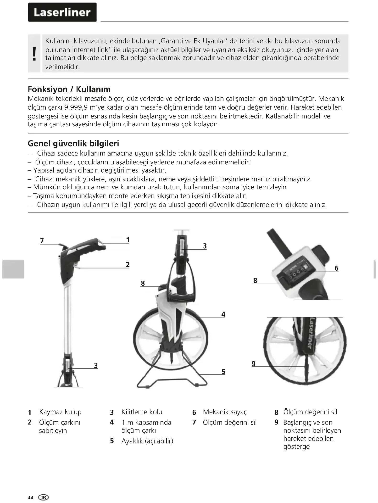 Fonksiyon / Kullanım Mekanik tekerlekli mesafe ölçer, düz yerlerde ve eğrilerde yapılan çalışmalar için öngörülmüştür. Mekanik ölçüm çarkı 9.999,9 m‘ye kadar olan mesafe ölçümlerinde tam ve doğru değerler verir. Hareket edebilen göstergesi ise ölçüm esnasında kesin başlangıç ve son noktasını belirtmektedir. Katlanabilir modeli ve taşıma çantası sayesinde ölçüm cihazının taşınması çok kolaydır. Genel güvenlik bilgileri – Cihazı sadece kullanım amacına uygun şekilde teknik özellikleri dahilinde kullanınız. – Ölçüm cihazı, çocukların ulaşabileceği yerlerde muhafaza edilmemelidir! – Yapısal açıdan cihazın değiştirilmesi yasaktır. – Cihazı mekanik yüklere, aşırı sıcaklıklara, neme veya şiddetli titreşimlere maruz bırakmayınız. – Mümkün olduğunca nem ve kumdan uzak tutun, kullanımdan sonra iyice temizleyin – Taşıma konumundayken monte ederken sıkışma tehlikesini dikkate alın – Cihazın uygun kullanımı ile ilgili yerel ya da ulusal geçerli güvenlik düzenlemelerini dikkate alınız.