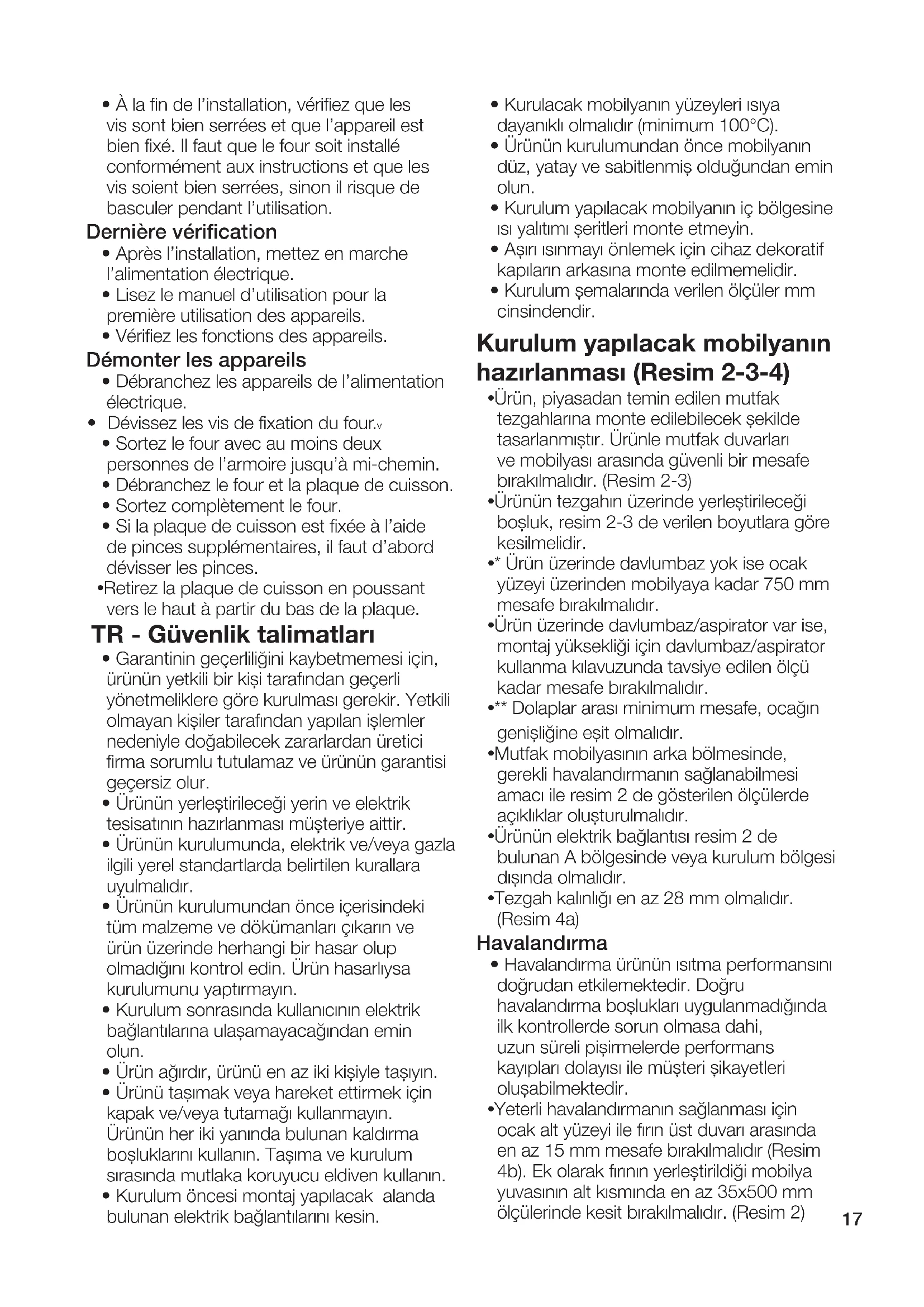 - Kurulum şemalarında verilen ölçüler mm cinsindendir. Kurulum yapılacak mobilyanın hazırlanması (Resim 2-3-4)