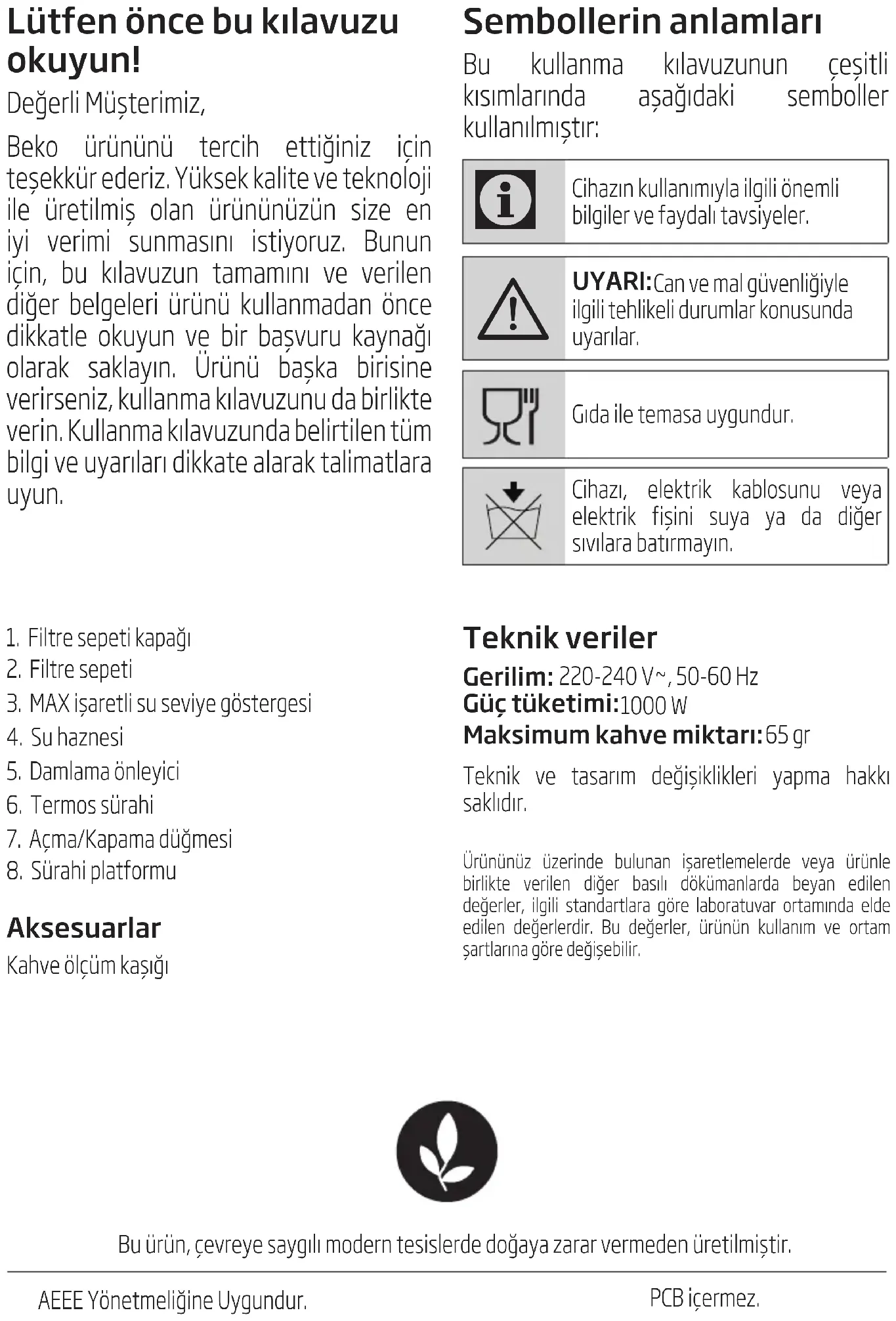Cihazın kullanımıyla ilgili önemli bilgiler ve faydalı tavsiyeler. UYARI: Can ve mal güvenliğiyle ilgili tehlikeli durumlar konusunda uyarılar.Gıda ile temasa uygundur.Cihazı, elektrik kablosunu veya elektrik fişini suya ya da diğer sıvılara batırmayın.Bu ürün, çevreye saygılı modern tesslerde doğaya zarar vermeden üretlmştr.AEEE Yönetmelğne Uygundur.PCB çermez.1. Filtre sepeti kapağı2. Filtre sepeti3. MAX işaretli su seviye göstergesi4. Su haznesi5. Damlama önleyici6. Termos sürahi7. Açma/Kapama düğmesi8. Sürahi platformu Aksesuarlar Kahve ölçüm kaşığı Teknik veriler Gerlm: 220-240 V~, 50-60 HzGüç tüketm: 1000 WMaksmum kahve mktarı: 65 grTeknk ve tasarım değşklkler yapma hakkı saklıdır.Ürününüz üzernde bulunan şaretlemelerde veya ürünle brlkte verlen dğer basılı dökümanlarda beyan edlen değerler, lgl standartlara göre laboratuvar ortamında elde edlen değerlerdr. Bu değerler, ürünün kullanım ve ortam şartlarına göre değşeblr.30 / TR Kahve Makinesi / Kullanma Kılavuzu Bu bölümde, yaralanma ya da mad- di hasar tehlikelerini önlemeye yar- dımcı olacak güvenlik talimatları yer almaktadır Bu talimatlara uyulmaması halinde her türlü garanti geçersiz hale gelir.