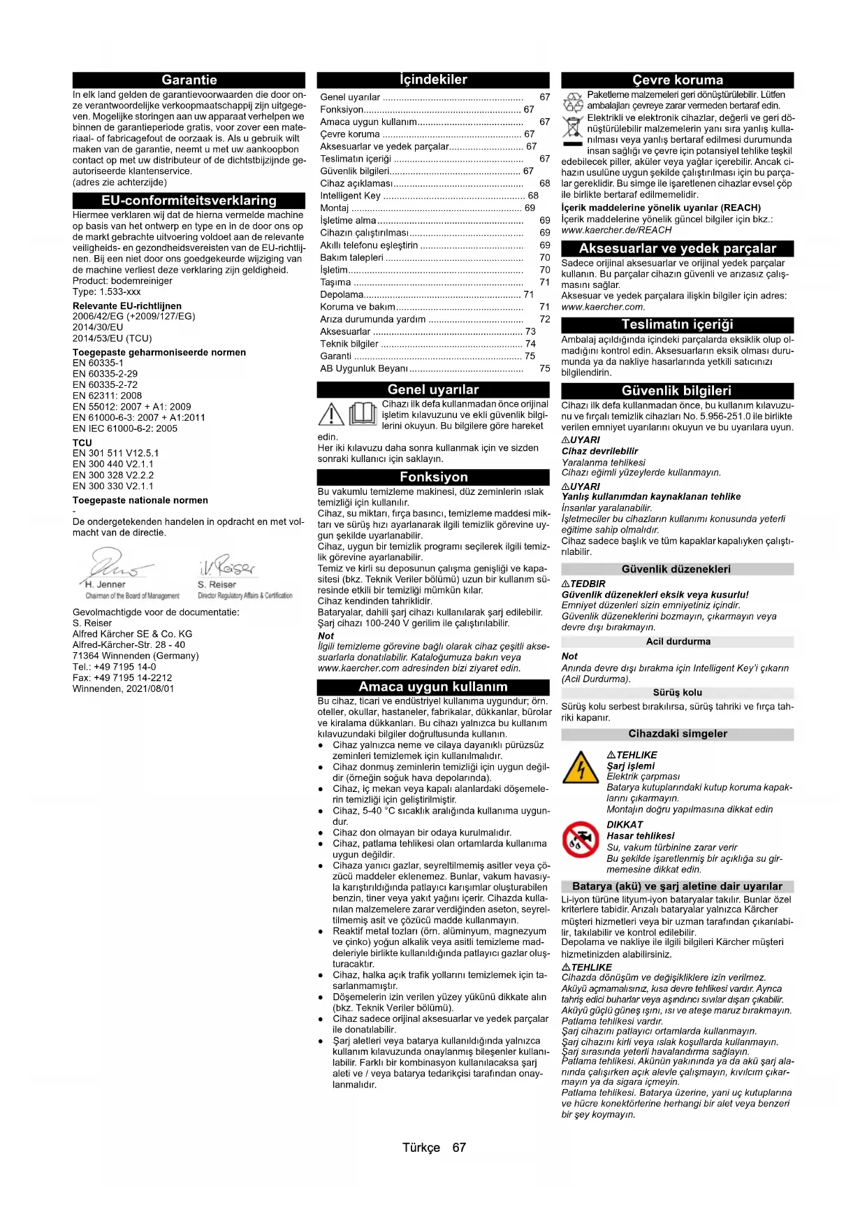 • De ondergetekenden handelen in opdracht en met vol- macht van de directie. Gevolmachtigde voor de documentatie: S. Reiser Alfred Kärcher SE & Co. KG Alfred-Kärcher-Str. 28 - 40 71364 Winnenden (Germany) Tel.: +49 7195 14-0 Fax: +49 7195 14-2212 Winnenden, 2021/08/01 İçindekiler Genel uyarılar Cihazı ilk defa kullanmadan önce orijinal işletim kılavuzunu ve ekli güvenlik bilgi- lerini okuyun. Bu bilgilere göre hareket edin. Her iki kılavuzu daha sonra kullanmak için ve sizden sonraki kullanıcı için saklayın. Fonksiyon Bu vakumlu temizleme makinesi, düz zeminlerin ıslak temizliği için kullanılır. Cihaz, su miktarı, fırça basıncı, temizleme maddesi mik- tarı ve sürüş hızı ayarlanarak ilgili temizlik görevine uy- gun şekilde uyarlanabilir. Cihaz, uygun bir temizlik programı seçilerek ilgili temiz- lik görevine ayarlanabilir. Temiz ve kirli su deposunun çalışma genişliği ve kapa- sitesi (bkz. Teknik Veriler bölümü) uzun bir kullanım sü- resinde etkili bir temizliği mümkün kılar. Cihaz kendinden tahriklidir. Bataryalar, dahili şarj cihazı kullanılarak şarj edilebilir. Şarj cihazı 100-240 V gerilim ile çalıştırılabilir. Not İlgili temizleme görevine bağlı olarak cihaz çeşitli akse- suarlarla donatılabilir. Kataloğumuza bakın veya www.kaercher.com adresinden bizi ziyaret edin. Amaca uygun kullanım Bu cihaz, ticari ve endüstriyel kullanıma uygundur; örn. oteller, okullar, hastaneler, fabrikalar, dükkanlar, bürolar ve kiralama dükkanları. Bu cihazı yalnızca bu kullanım kılavuzundaki bilgiler doğrultusunda kullanın. ● Cihaz yalnızca neme ve cilaya dayanıklı pürüzsüz zeminleri temizlemek için kullanılmalıdır. ● Cihaz donmuş zeminlerin temizliği için uygun değil- dir (örneğin soğuk hava depolarında). ● Cihaz, iç mekan veya kapalı alanlardaki döşemele- rin temizliği için geliştirilmiştir. ● Cihaz, 5-40 °C sıcaklık aralığında kullanıma uygun- dur. ● Cihaz don olmayan bir odaya kurulmalıdır. ● Cihaz, patlama tehlikesi olan ortamlarda kullanıma uygun değildir. ● Cihaza yanıcı gazlar, seyreltilmemiş asitler veya çö- zücü maddeler eklenemez. Bunlar, vakum havasıy- la kar ıştırıldığında patlayıcı karışımlar oluşturabilen benzin, tiner veya yakıt yağını içerir. Cihazda kulla- nılan malzemelere zarar verdiğinden aseton, seyrel- tilmemiş asit ve çözücü madde kullanmayın. ● Reaktif metal tozları (örn. alüminyum, magnezyum ve çinko) yoğun alkalik veya asitli temizleme mad- deleriyle birlikte kullanıldığında patlayıcı gazlar oluş- turacaktır. ● Cihaz, halka açık trafik yollarını temizlemek için ta- sarlanmamıştır. ● Döşemelerin izin verilen yüzey yükünü dikkate alın (bkz. Teknik Veriler bölümü). ● Cihaz sadece orijinal aksesuarlar ve yedek parçalar ile donatılabilir. ●Şarj aletleri veya batarya kullanıldığında yalnızca kullanım k ılavuzunda onaylanmış bileşenler kullanı- labilir. Farklı bir kombinasyon kullanılacaksa şarj aleti ve / veya batarya tedarikçisi tarafından onay- lanmalıdır. Çevre koruma Paketleme malzemeleri geri dönüştürülebilir. Lütfen ambalajları çevreye zarar vermeden bertaraf edin. Elektrikli ve elektronik cihazlar, değerli ve geri dö- nüştürülebilir malzemelerin yanı sıra yanlış kulla- nılması veya yanlış bertaraf edilmesi durumunda insan sağlığı ve çevre için potansiyel tehlike teşkil edebilecek piller, aküler veya yağlar içerebilir. Ancak ci- hazın usulüne uygun şekilde çalıştırılması için bu parça- lar gereklidir. Bu simge ile işaretlenen cihazlar evsel çöp ile birlikte bertaraf edilmemelidir. İçerik maddelerine yönelik uyarılar (REACH) İçerik maddelerine yönelik güncel bilgiler için bkz.: www.kaercher.de/REACH Aksesuarlar ve yedek parçalar Sadece orijinal aksesuarlar ve orijinal yedek parçalar kullanın. Bu parçalar cihazın güvenli ve arızasız çalış- masını sağlar. Aksesuar ve yedek parçalara ilişkin bilgiler için adres: www.kaercher.com. Teslimatın içeriği Ambalaj açıldığında içindeki parçalarda eksiklik olup ol- madığını kontrol edin. Aksesuarların eksik olması duru- munda ya da nakliye hasarlarında yetkili satıcınızı bilgilendirin. Güvenlik bilgileri Cihazı ilk defa kullanmadan önce, bu kullanım kılavuzu- nu ve fırçalı temizlik cihazları No. 5.956-251.0 ile birlikte verilen emniyet uyarılarını okuyun ve bu uyarılara uyun. 몇 UYARI Cihaz devrilebilir Yaralanma tehlikesi Cihazı eğimli yüzeylerde kullanmayın. 몇 UYARI Yanlış kullanımdan kaynaklanan tehlike İnsanlar yaralanabilir. İşletmeciler bu cihazların kullanımı konusunda yeterli eğitime sahip olmalıdır. Cihaz sadece başlık ve tüm kapaklar kapalıyken çalıştı- rılabilir. Güvenlik düzenekleri 몇 TEDBIR Güvenlik düzenekleri eksik veya kusurlu! Emniyet düzenleri sizin emniyetiniz içindir. Güvenlik düzeneklerini bozmayın, çıkarmayın veya devre dışı bırakmayın. Acil durdurma Not Anında devre dışı bırakma için Intelligent Key’i çıkarın (Acil Durdurma). Sürüş kolu Sürüş kolu serbest bı rakılırsa, sürüş tahriki ve fırça tah- riki kapanır. Cihazdaki simgeler Batarya (akü) ve şarj aletine dair uyarılar Li-iyon türüne lityum-iyon bataryalar takılır. Bunlar özel kriterlere tabidir. Arızalı bataryalar yalnızca Kärcher müşteri hizmetleri veya bir uzman tarafından çıkarılabi- lir, takılabilir ve kontrol edilebilir. Depolama ve nakliye ile ilgili bilgileri Kärcher müşteri hizmetinizden alabilirsiniz. TEHLIKE Cihazda dönüşüm ve değişikliklere izin verilmez. Aküyü açmamalısınız, kısa devre tehlikesi vardır. Ayrıca tahriş edici buharlar veya aşındırıcı sıvılar dışarı çıkabilir. Aküyü güçlü güneş ışını, ısı ve ateşe maruz bırakmayın. Patlama tehlikesi vardır. Şarj cihazını patlayıc