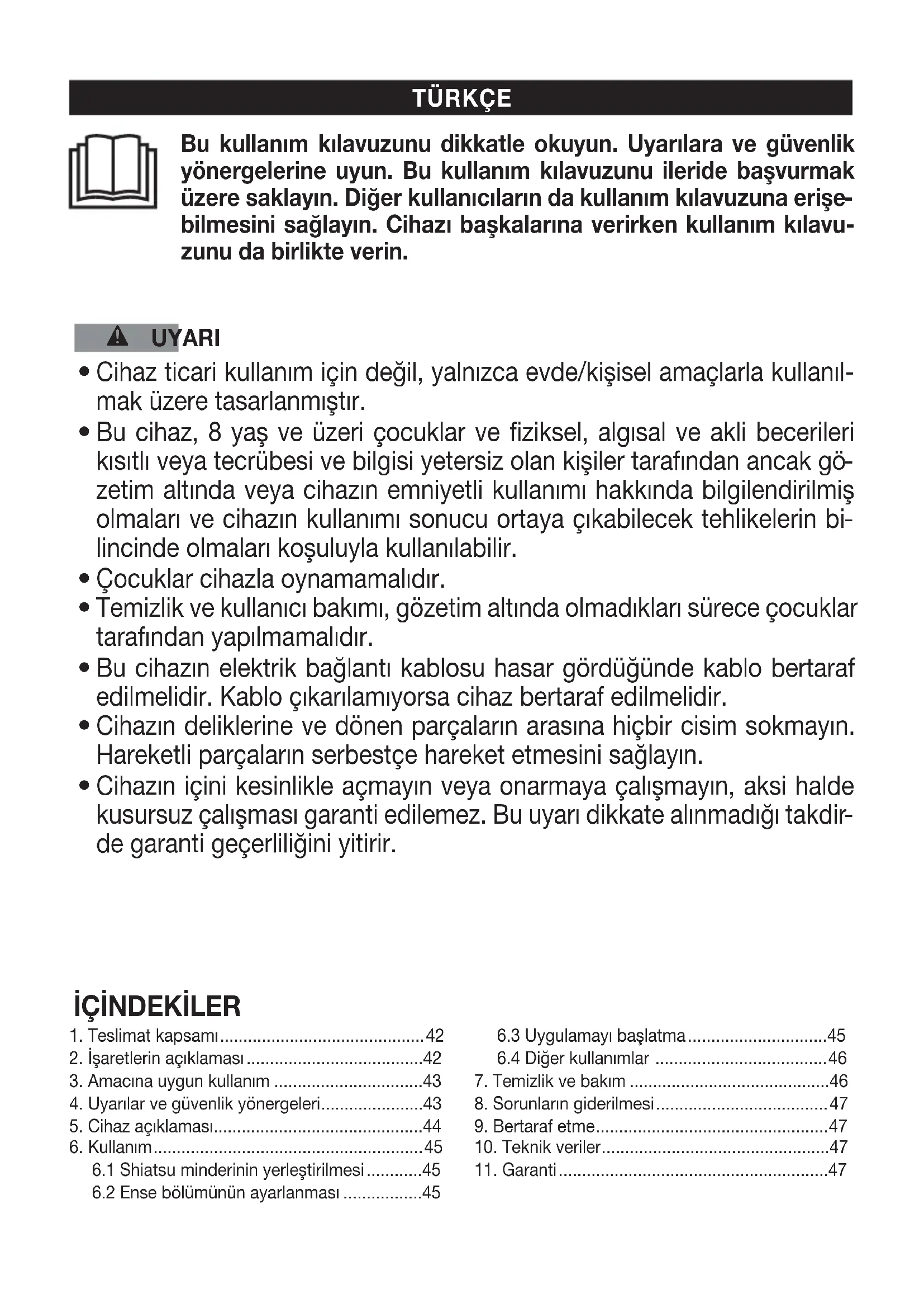 Bu cihaz yalnızca insanların sırtına ve ensesine masaj yapmak için tasarlanmıştır. Doktor tarafından yapılan bir tedavinin yerini tutamaz. Masaj aletini, aşağıdaki uyarılardan biri veya birden fazlası sizin için geçerliyse kullanmayın. UYARI Masaj aletini