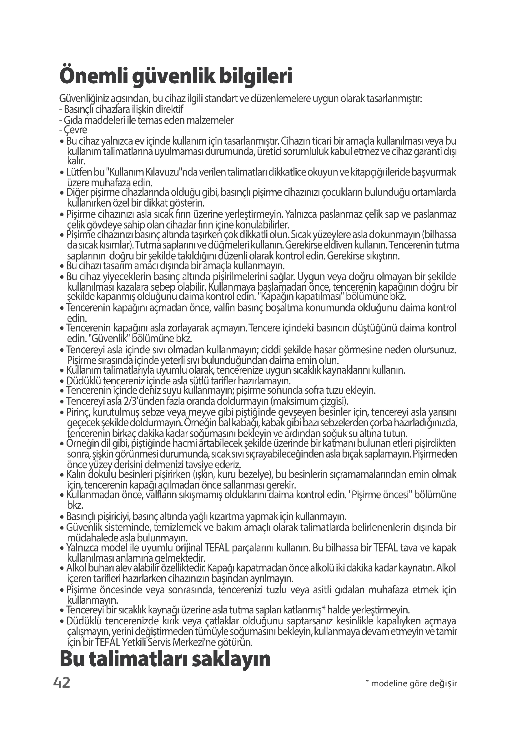 - Düdüklü tencerenizde kırık veya çatlaklar olduğunu saptarsanız kesinlikle kapalıyken açmaya çalışmayın, yerini değiştirmeden tümüyle soğumasını bekleyin, kullanmaya devam etmeyin ve tamir için bir TEFAL Yetkili Servis Merkezi'ne götürün. Bu talimatları saklayınTR