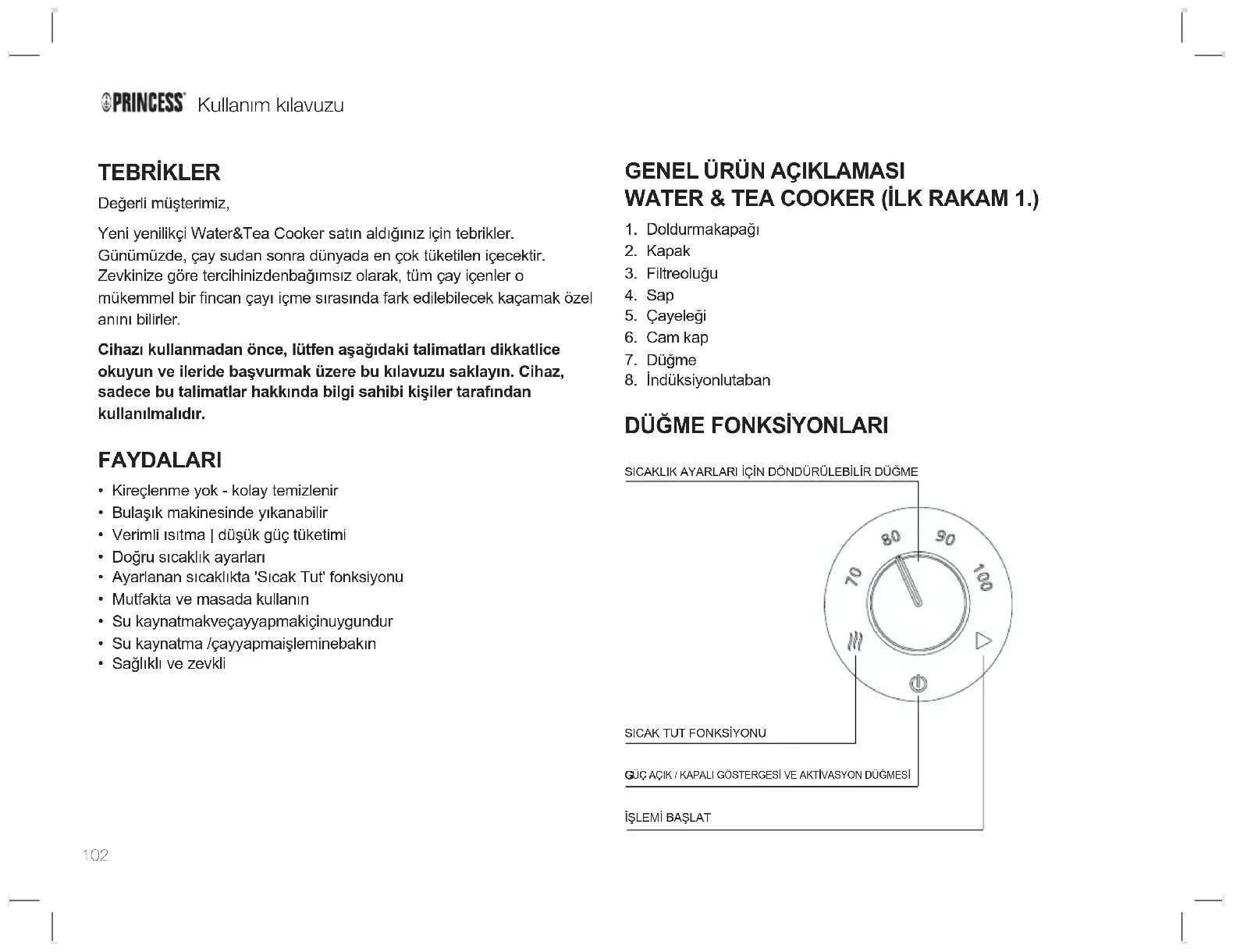 - Pre detailné podmienky záruky si, prosím , pozrite našu servisnú webovú stránku: service.princess.info SK102 Kullanım kılavuzu TEBRİKLER Değerli müşterimiz, Yeni yenilikçi Water&Tea Cooker satın aldığınız için tebrikler. Günümüzde, çay sudan sonra dünyada en çok tüketilen içecektir. Zevkinize göre tercihinizdenbağımsız olarak, tüm çay içenler o mükemmel bir ncan çayı içme sırasında fark edilebilecek kaçamak özel anını bilirler. Cihazı kullanmadan önce, lütfen aşağıdaki talimatları dikkatlice okuyun ve ileride başvurmak üzere bu kılavuzu saklayın. Cihaz, sadece bu talimatlar hakkında bilgi sahibi kişiler tarafından kullanılmalıdır. FAYDALARI