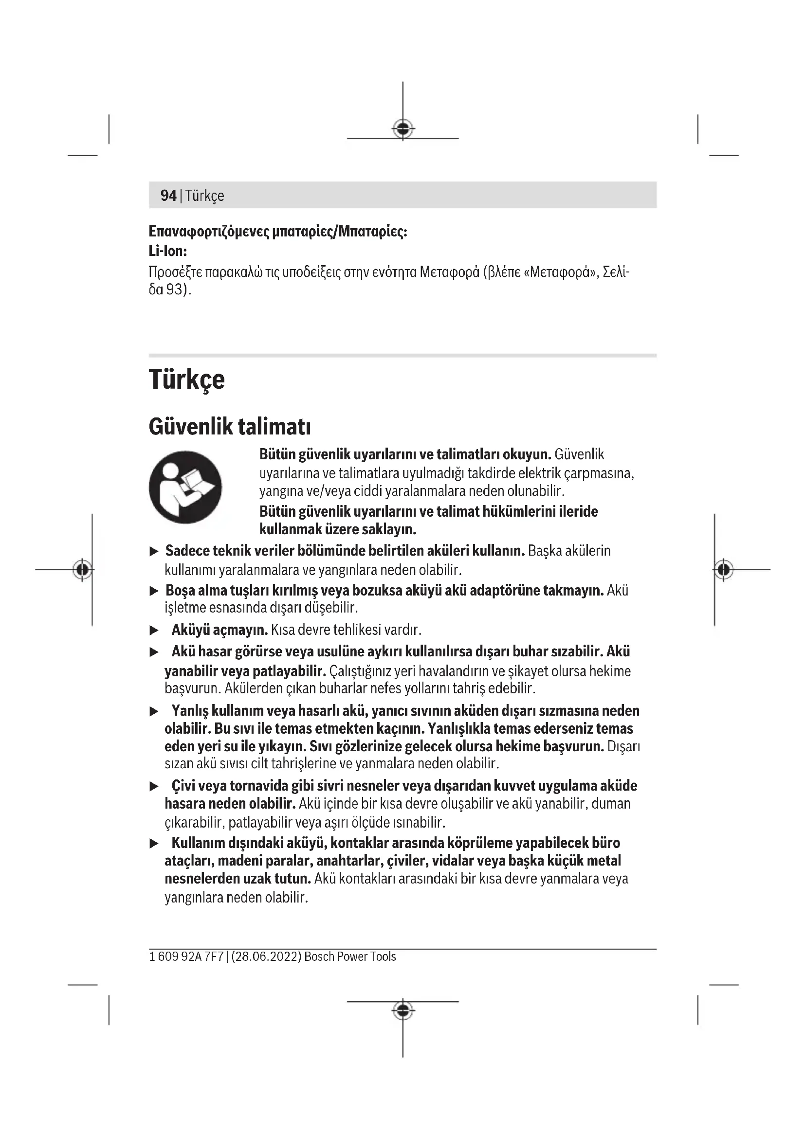 Μην ρίχνετε τις ηλεκτρικές συσκευές και τις επαναφορτιζόμενες μπαταρίες/μπα- ταρίες στα οικιακά απορρίμματα! Μόνο για χώρες τηςΕΕ: Σύμφωνα με την Ευρωπαϊκή οδηγία 2012/19/ΕΕ σχετικά με τις παλιές ηλεκτρικές και ηλε- κτρονικές συσκευές και τη μεταφορά της οδηγίας αυτής σε εθνικό δίκαιο οι άχρηστες ηλε- κτρικές συσκευές και σύμφωνα με την Ευρωπαϊκή οδηγία 2006/66/ΕΚ οι χαλασμένες ή χρησιμοποιημένες μπαταρίες πρέπει να συλλέγονται ξεχωριστά, για να ανακυκλωθούν με τρόπο φιλικό προς το περιβάλλον. Σε περίπτωση μη ενδεδειγμένης απόσυρσης οι ηλεκτρικές και ηλεκτρονικές συσκευές λόγω ενδεχομένης παρουσίας επικίνδυνων ουσιών μπορούν να έχουν επιβλαβείς επιπτώσεις στο περιβάλλον και στην ανθρώπινη υγεία. Bosch Power Tools 1 609 92A 7F7 | (28.06.2022)94 | Türkçe Επαναφορτιζόμενες μπαταρίες/Μπαταρίες: Li-Ion: Προσέξτε παρακαλώ τις υποδείξεις στην ενότητα Μεταφορά (βλέπε «Μεταφορά», Σελί- δα93). Türkçe Güvenlik talimatı Bütün güvenlik uyarılarını ve talimatları okuyun. Güvenlik uyarılarına ve talimatlara uyulmadığı takdirde elektrik çarpmasına, yangına ve/veya ciddi yaralanmalara neden olunabilir. Bütün güvenlik uyarılarını ve talimat hükümlerini ileride kullanmak üzere saklayın. u Sadece teknik veriler bölümünde belirtilen aküleri kullanın. Başka akülerin kullanımı yaralanmalara ve yangınlara neden olabilir. u Boşa alma tuşları kırılmış veya bozuksa aküyü akü adaptörüne takmayın. Akü işletme esnasında dışarı düşebilir. u Aküyü açmayın. Kısa devre tehlikesi vardır. u Akü hasar görürse veya usulüne aykırı kullanılırsa dışarı buhar sızabilir. Akü yanabilir veya patlayabilir. Çalıştığınız yeri havalandırın ve şikayet olursa hekime başvurun. Akülerden çıkan buharlar nefes yollarını tahriş edebilir. u Yanlış kullanım veya hasarlı akü, yanıcı sıvının aküden dışarı sızmasına neden olabilir. Bu sıvı ile temas etmekten kaçının. Yanlışlıkla temas ederseniz temas eden yeri su ile yıkayın. Sıvı gözlerinize gelecek olursa hekime başvurun. Dışarı sızan akü sıvısı cilt tahrişlerine ve yanmalara neden olabilir. u Çivi veya tornavida gibi sivri nesneler veya dışarıdan kuvvet uygulama aküde hasara neden olabilir. Akü içinde bir kısa devre oluşabilir ve akü yanabilir, duman çıkarabilir, patlayabilir veya aşırı ölçüde ısınabilir. u Kullanım dışındaki aküyü, kontaklar arasında köprüleme yapabilecek büro ataçları, madeni paralar, anahtarlar, çiviler, vidalar veya başka küçük metal nesnelerden uzak tutun. Akü kontakları arasındaki bir kısa devre yanmalara veya yangınlara neden olabilir. 1 609 92A 7F7 | (28.06.2022) Bosch Power ToolsTürkçe | 95 Aküyü sıcaktan, sürekli gelen güneş ışınından, ateşten, kirden, sudan ve nemden koruyun. Patlama ve kısa devre tehlikesi vardır. Ürün ve performans açıklaması Bütün güvenlik talimatını ve uyarıları okuyun. Güvenlik talimatlarına ve uyarılara uyulmadığı takdirde elektrik çarpmasına, yangına ve/veya ciddi yaralanmalara neden olunabilir. Lütfen kullanma kılavuzunun ön kısmındaki resimlere dikkat edin. Usulüne uygun kullanım Akü adaptörü gerilim kaynağı olarak bir Bosch 18V Lityum İyon akünün takılmasında kullanılır. Akü adaptörü ile aynı anda azami iki USB cihazı ve bir ısıtmalı ceket rezistansı gerilimle beslenebilir. Şekli gösterilen elemanlar Şekli gösterilen elemanların numaraları grafik sayfasındaki elektrikli el aleti resmindeki numaralarla aynıdır. (1) Akü adaptörü (2) USB soketi (3) Isıtmalı ceket ısıtma elemanının bağlantı fişinin takılması için soket (4) Kemere takma klipsi (5) Akü adaptörünü etkinleştirmek için açma tuşu (6) Akü