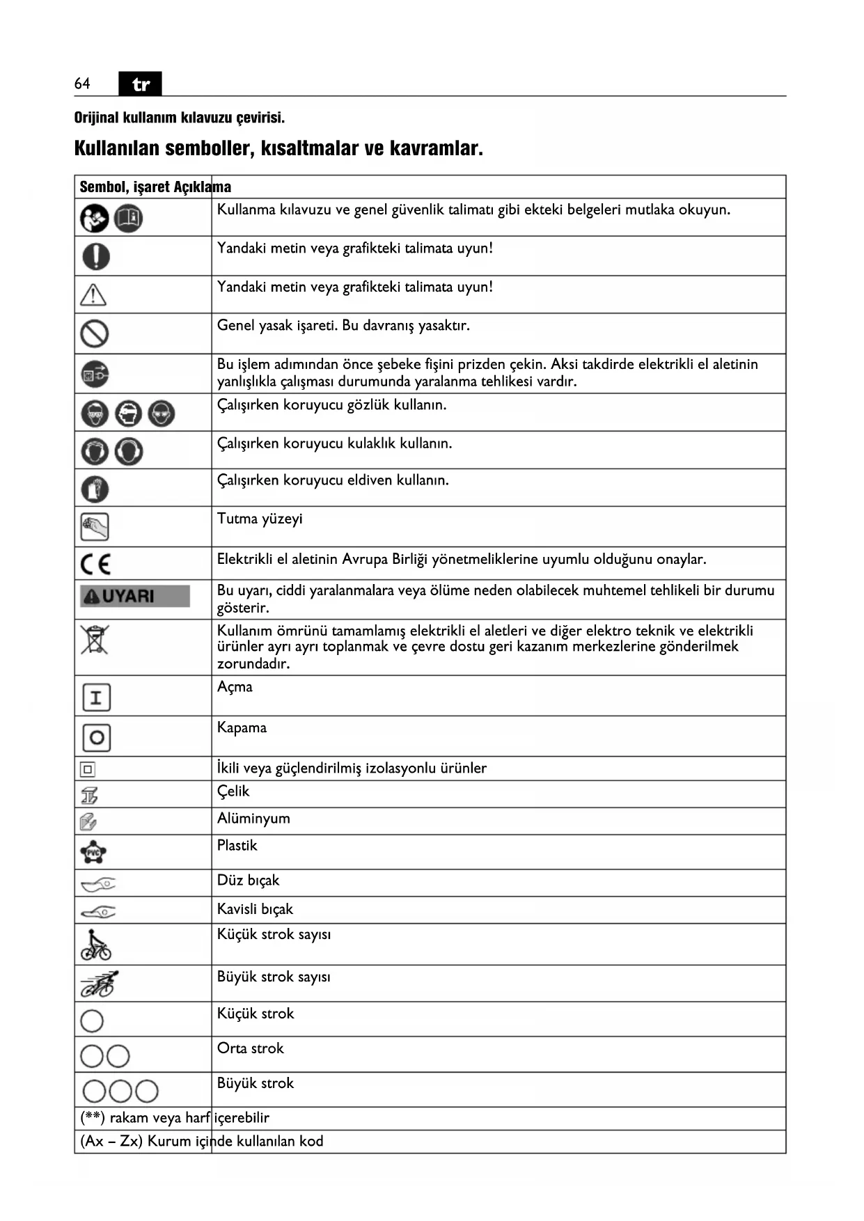 Orijinal kullanım kılavuzu çevirisi. Kullanılan semboller, kısaltmalar ve kavramlar. Sembol, işaret Açıklama Kullanma kılavuzu ve genel güvenlik talimatı gibi ekteki belgeleri mutlaka okuyun. Yandaki metin veya grafikteki talimata uyun! Yandaki metin veya grafikteki talimata uyun! Genel yasak işareti. Bu davranış yasaktır. Bu işlem adımından önce şebeke fişini prizden çekin. Aksi takdirde elektrikli el aletinin yanlışlıkla çalışması durumunda yaralanma tehlikesi vardır. Çalışırken koruyucu gözlük kullanın. Çalışırken koruyucu kulaklık kullanın. Çalışırken koruyucu eldiven kullanın. Tutma yüzeyi Elektrikli el aletinin Avrupa Birliği yönetmeliklerine uyumlu olduğunu onaylar. Bu uyarı, ciddi yaralanmalara veya ölüme neden olabilecek muhtemel tehlikeli bir durumu gösterir. Kullanım ömrünü tamamlamış elektrikli el aletleri ve diğer elektro teknik ve elektrikli ürünler ayrı ayrı toplanmak ve çevre dostu geri kazanım merkezlerine gönderilmek zorundadır. Açma Kapama İkili veya güçlendirilmiş izolasyonlu ürünler Çelik Alüminyum Plastik Düz bıçak Kavisli bıçak Küçük strok sayısı Büyük strok sayısı Küçük strok Orta strok Büyük strok (**) rakam veya harf içerebilir (Ax – Zx) Kurum içinde kullanılan kod65