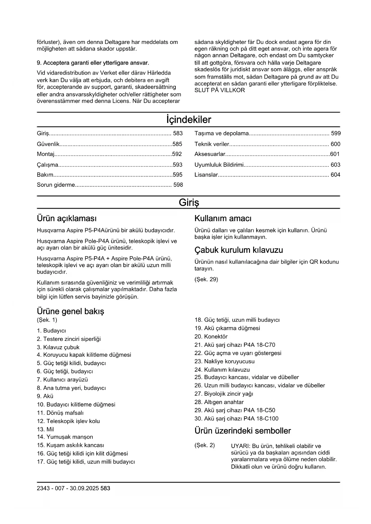 Huskvarna, 2025-10-31 Claes Losdal, AR-GE Müdürü, Husqvarna AB Teknik dokümantasyon sorumlusu Türk ithalat şirketi daha fazla bilgi için temas edilecek: Çullas Orman Bahçe ve Tarım Mak. San. Tic. A.Ş. Yalı Mah. Ziya Gökalp Cad. No:17 Maltepe – 34844 İstanbul / Türkiye Telefon: +90 216 519 88 82 Faks: +90 216 519 88 78 info@cullas.com.tr 2343 - 007 - 30.09.2025 603Lisanslar Telif Hakkı