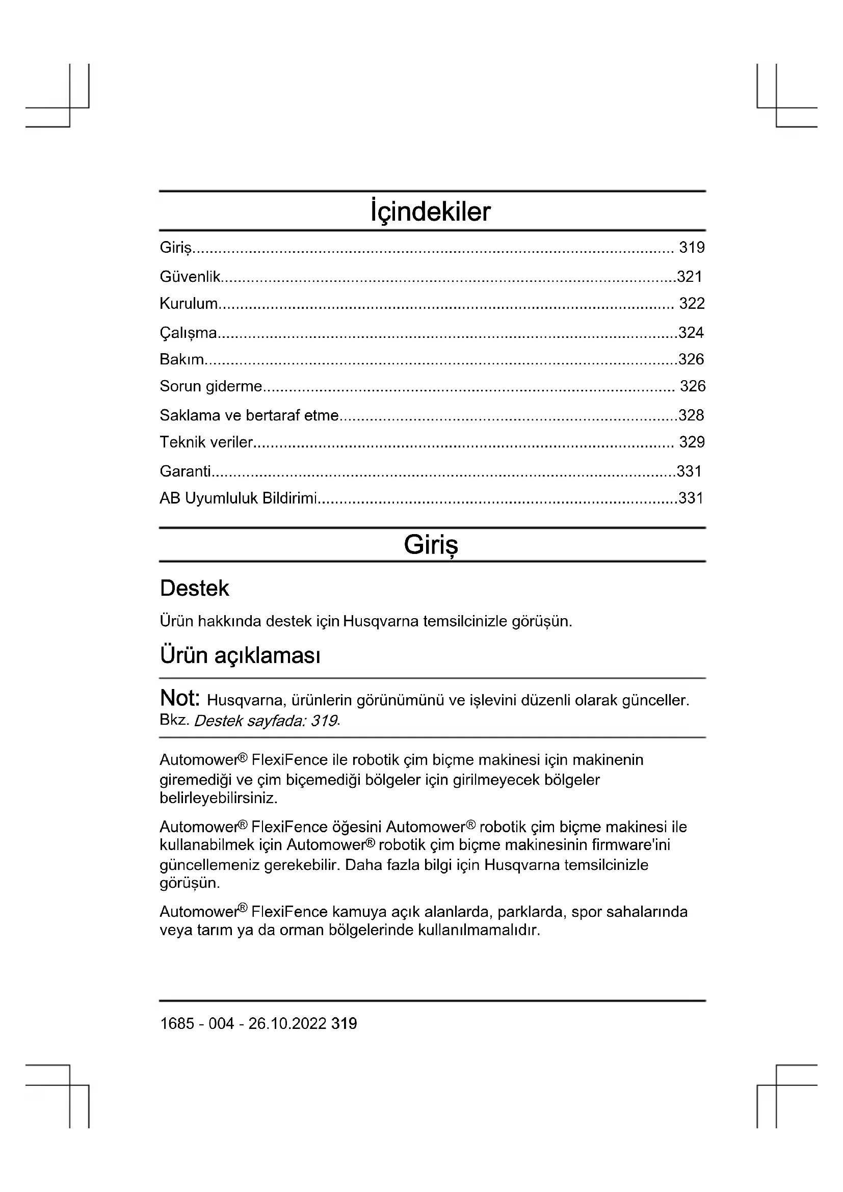 - Yetkili olmayan kişilerin ürün üzerinde değişiklik yapması veya kurcalamasından kaynaklanan hasar. Husqvarna ürününüzde bir hata oluşursa daha fazla talimat için lütfen Husqvarna yerel temsilciniz ile iletişime geçin. Husqvarna yerel temsilcisi ile iletişime geçerken lütfen faturayı ve ürünün seri numarasını yanınızda bulundurun. AB Uyumluluk Bildirimi Aşağıda imzası bulunan, üreticinin yetkili temsilcisi olarak, GARDENA Germany AB, PO Box 7454, S-103 92, Stockholm, Sweden, aşağıda belirtilen birimlerin fabrikamızdan ayrılırken uyumlu hale getirilmiş AB yönergeleri, AB güvenlik standartları ve ürüne özel standartlara uygun olduğunu onaylamaktadır. Birimler, onayımız olmadan değiştirilirse bu sertifika geçerliliğini yitirir. 1685 - 004 - 26.10.2022 331Açıklama Mobil Çevrim Tip/Model Automower