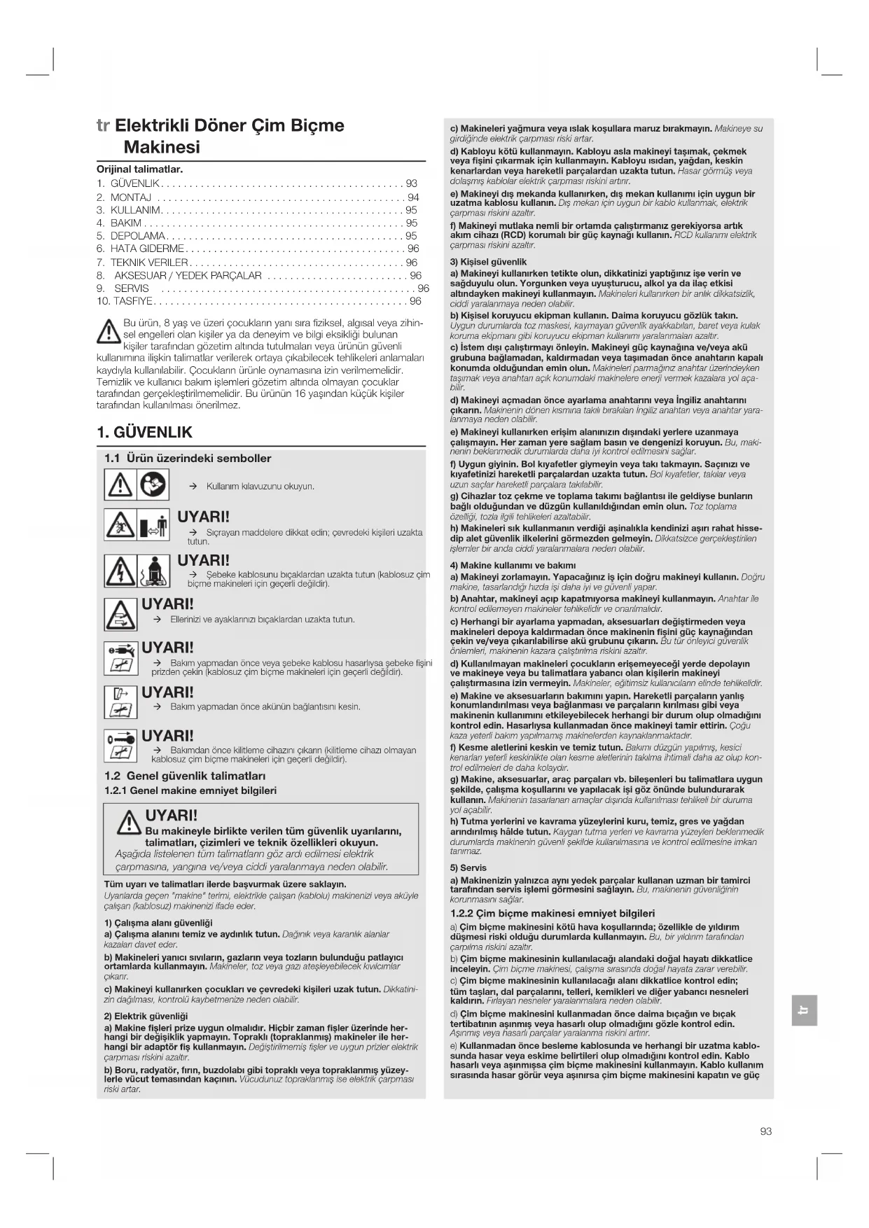Æ Kullanım kılavuzunu okuyun. UYARI! Æ Sıçrayan maddelere dikkat edin; çevredeki kişileri uzakta tutun. UYARI! Æ Şebeke kablosunu bıçaklardan uzakta tutun (kablosuz çim biçme makineleri için geçerli değildir). UYARI! Æ Ellerinizi ve ayaklarınızı bıçaklardan uzakta tutun. UYARI! Æ Bakım yapmadan önce veya şebeke kablosu hasarlıysa şebeke şini prizden çekin (kablosuz çim biçme makineleri için geçerli değildir). UYARI! Æ Bakım yapmadan önce akünün bağlantısını kesin. UYARI! Æ Bakımdan önce kilitleme cihazını çıkarın (kilitleme cihazı olmayan kablosuz çim biçme makineleri için geçerli değildir).