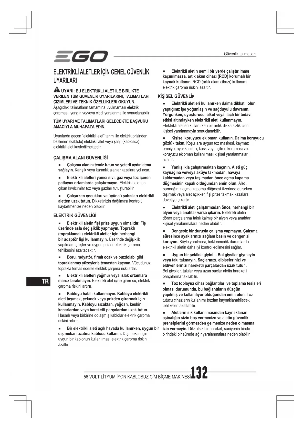 TEHLİKE: Bu makine, bu kılavuzda yer alan güvenli çalıştırma kurallarına uygun olarak çalıştırılmak üzere tasarlanmıştır. Tüm elektrikli cihazlarda olduğu gibi, operatörün dikkatsizliği veya herhangi bir hatası ciddi yaralanmaya yol açabilir. Bu makine ellerinizi ve ayaklarınızı yaralayabilir ve nesneleri fırlatıp atabilir. Tüm güvenlik talimatlarına uyulmaması ciddi yaralanmalara veya ölüme yol açabilir. UYARI: Kablosuz çim biçme makinesini kullanırken yangın, elektrik çarpması ve kişisel yaralanma riskini azaltmak için daima temel güvenlik önlemleri alınmalıdır.56 VOLT LİTYUM İYON KABLOSUZ ÇİM BİÇME MAKİNESİ134
